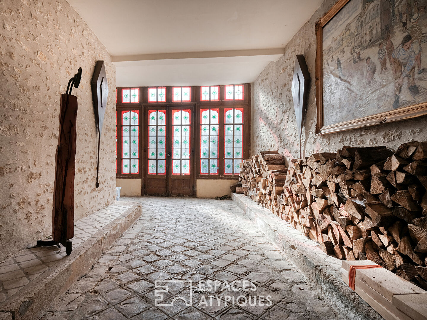 La découverte extérieure est saisissante. La façade côté rue se distingue immédiatement par sa singularité. La brique et la pierre se parent d’une élégante ornementation, les frontons sont sculptés. La double porte d’entrée en bois en impose et dévoile un incroyable porche en pavés au fond duquel un mur de vitraux laisse entrer une lumière douce et enveloppante.