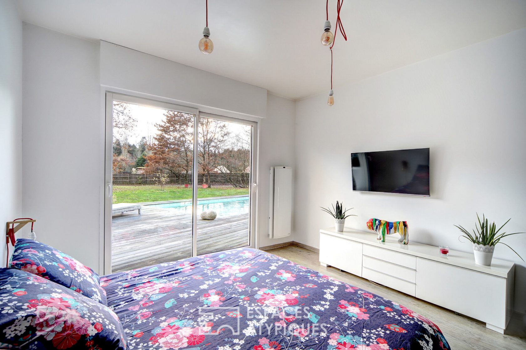 L’aile droite est quant à elle dédiée aux enfants avec deux chambres et une salle d’eau aux couleurs vitaminées. Un double garage de 60m² avec espace atelier vient compléter utilement ce bien.