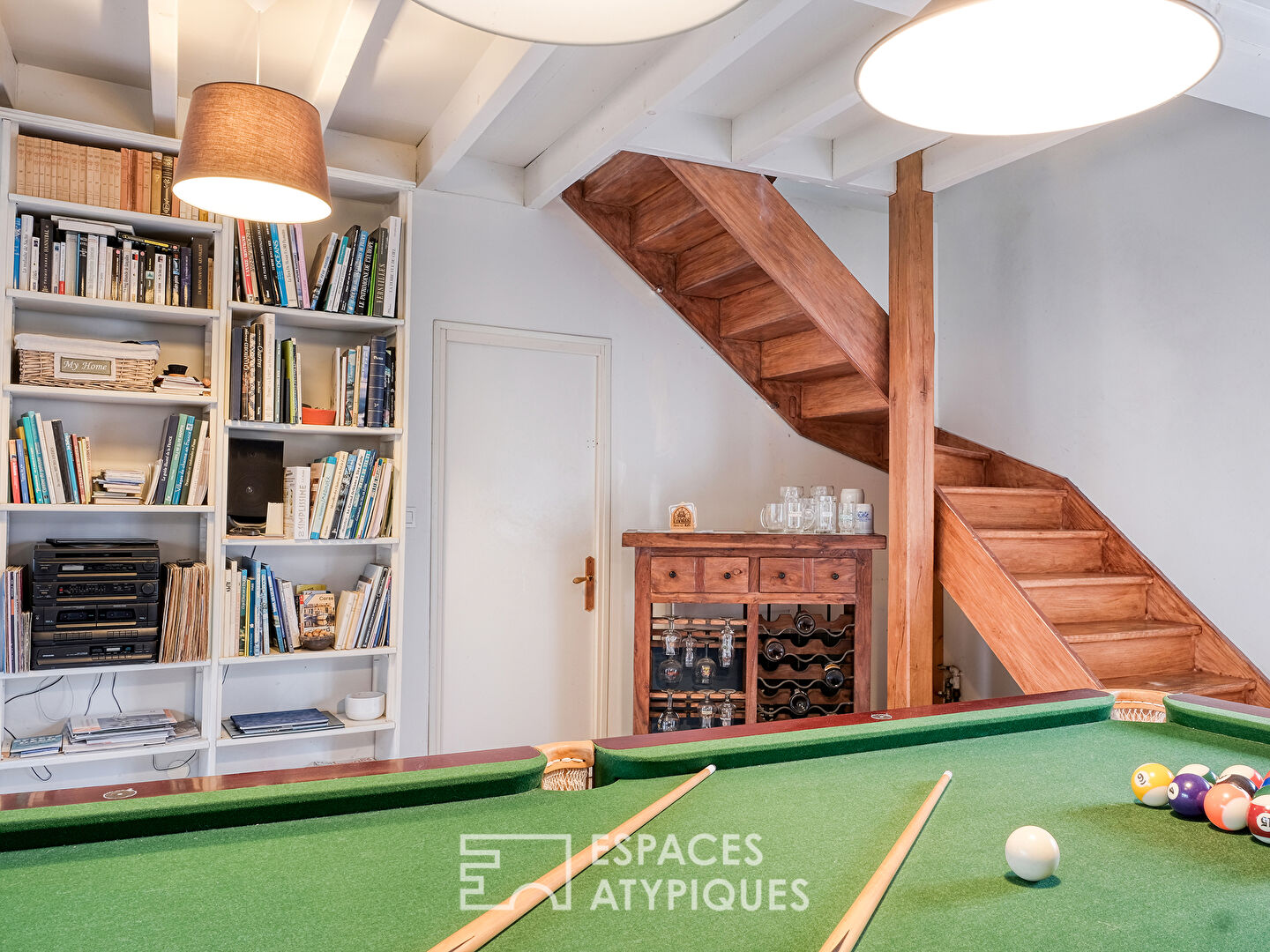 De retour dans l’entrée, la visite se poursuit dans l’extension créée dans les années 90 dont la pièce centrale abritant billard et bibliothèque, donne le ton de la détente. Un bureau avec placards intégrés, un dressing indépendant, une buanderie et un escalier complètent ce bel espace à la lumière traversante. De chaque côté des baies vitrées, se trouvent la terrasse principale ainsi qu’une deuxième terrasse et le jardin.