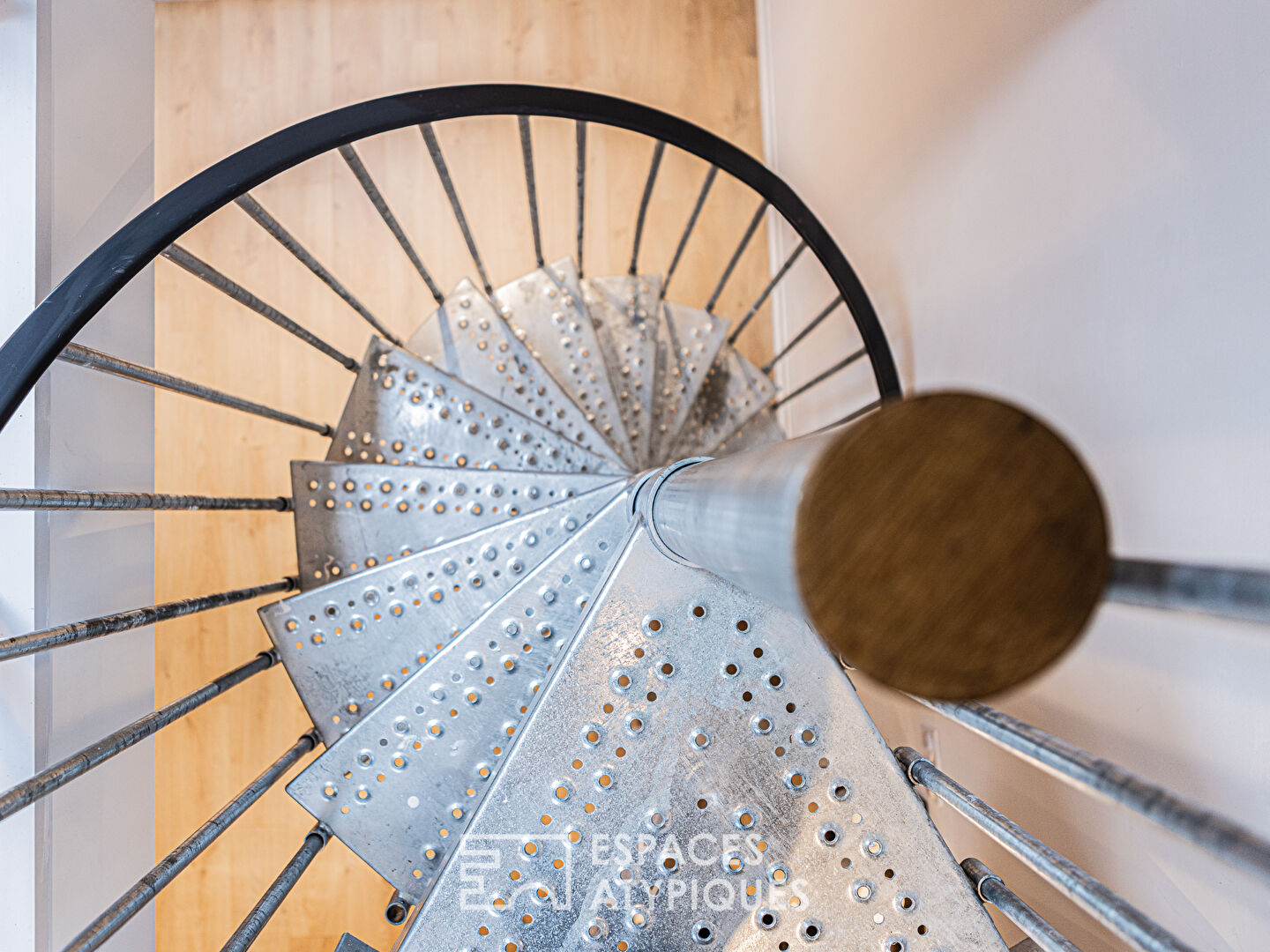 À l’étage, l’espace nuit s’organise autour d’une mezzanine proposant plusieurs usages : un coin bureau, un espace nuit et un dressing.