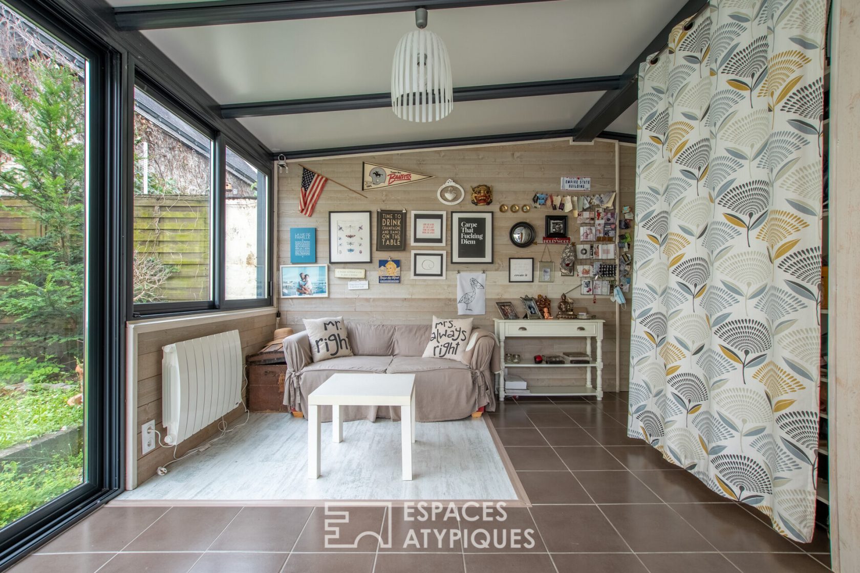 Un passage privé fermé mène à l’entrée qui dessert une jolie véranda, espace de vie lumineux du rez-de-chaussée. Jouxtant cette pièce se trouve une cuisine aménagée et équipée ouverte sur un salon cosy qui dégage une atmosphère chaleureuse.