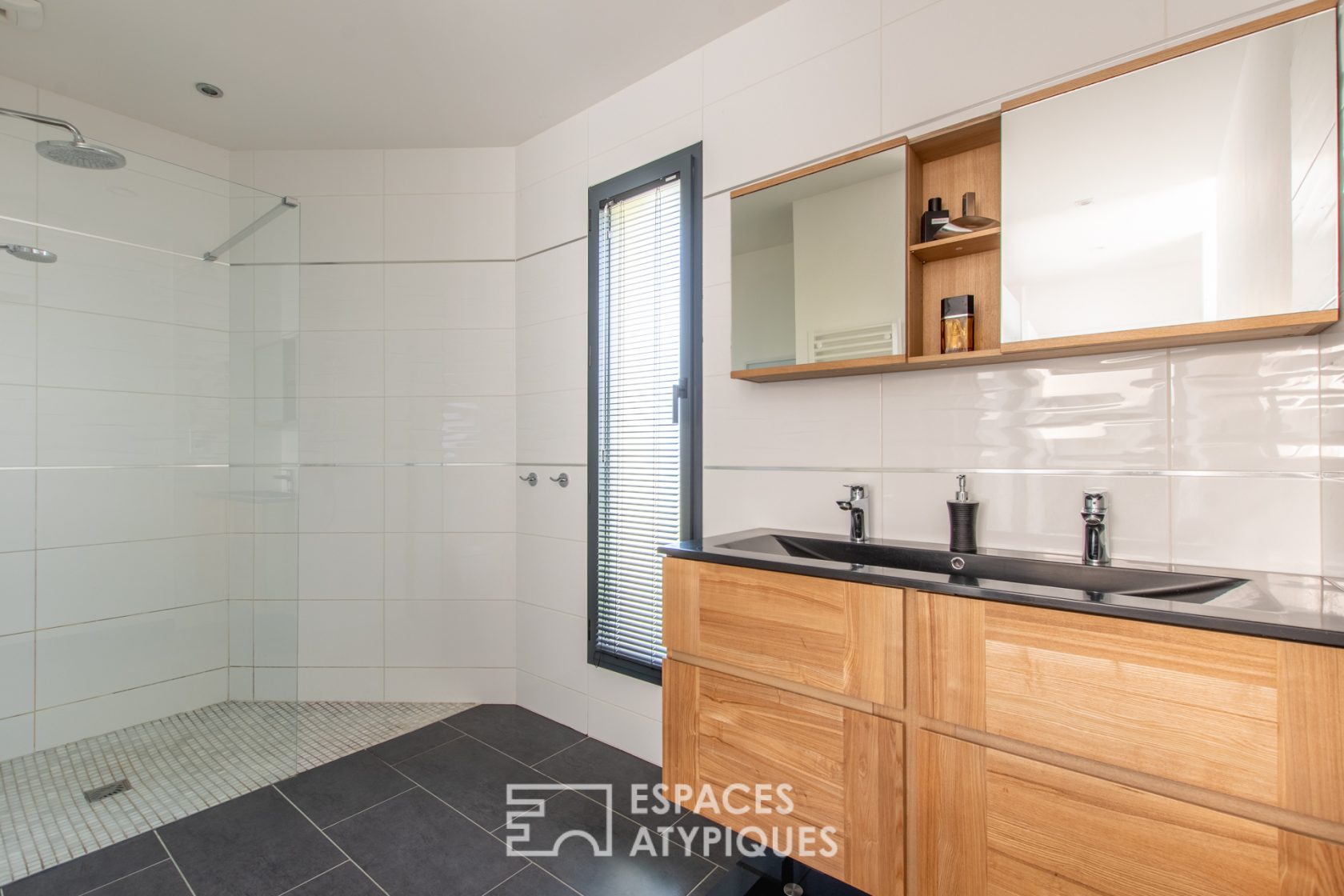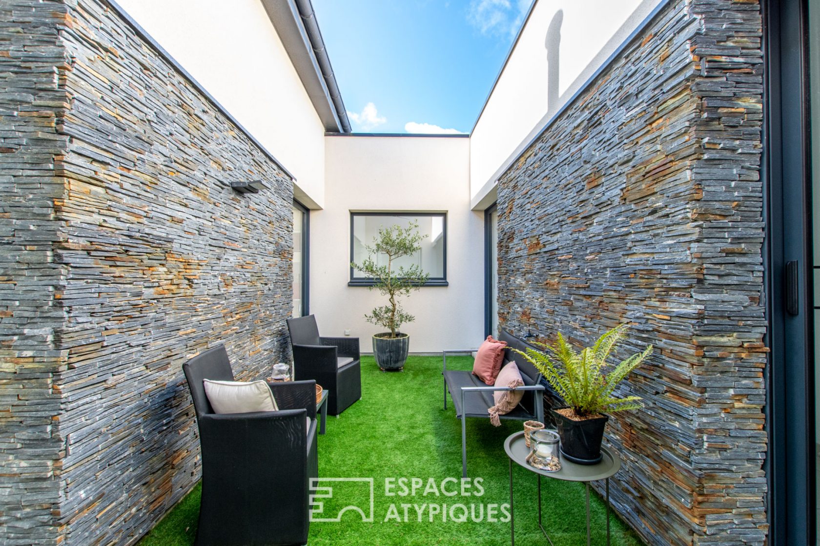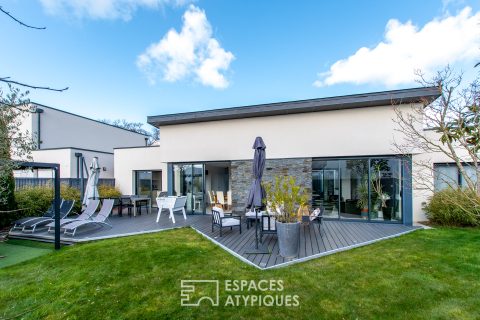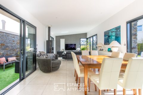Située à Saint-Jean-de-Linières, cette lumineuse maison d’architecte développe 132 m2 sur une parcelle de 561 m2 à seulement 10 minutes d’Angers.