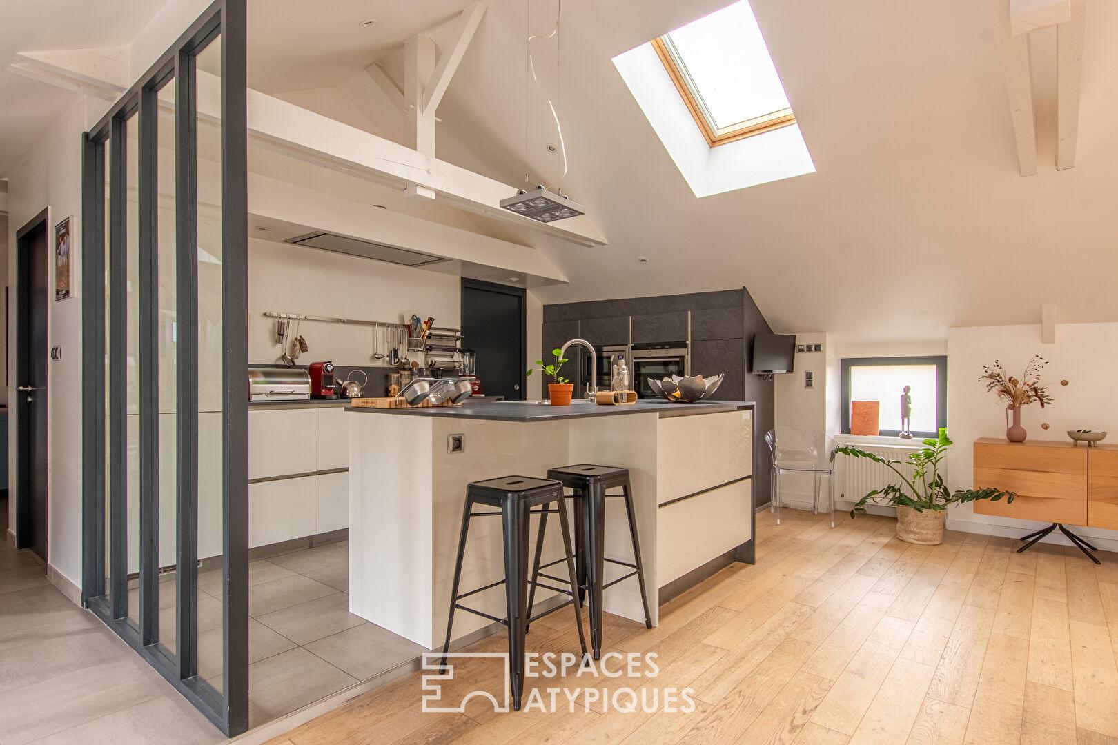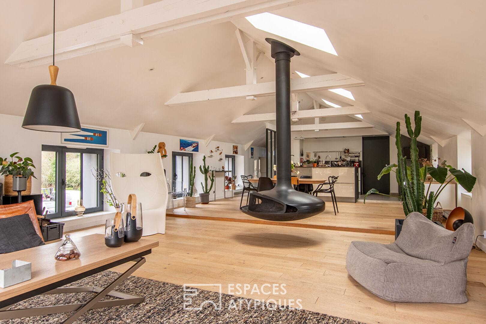 À l’étage, accessible par une entrée indépendante, l’atmosphère change radicalement. La lumière s’impose et révèle un loft contemporain aux prestations abouties. Un palier aménagé en espace bureau crée une transition subtile entre gestion professionnelle et vie privée. La pièce de vie impressionne par ses volumes et sa cohérence. La cuisine aménagée et équipée, structurée autour d’un généreux îlot central, dialogue harmonieusement avec le séjour. Au coeur de cet espace, une cheminée suspendue et orientable devient l’élément sculptural du lieu : elle pivote au gré des instants, diffusant sa chaleur aussi bien vers la cuisine que vers le salon, soulignant la convivialité des volumes ouverts. De larges baies vitrées prolongent l’ensemble vers une terrasse offrant une vue dégagée sur un environnement naturel et une rivière, apportant une respiration rare.