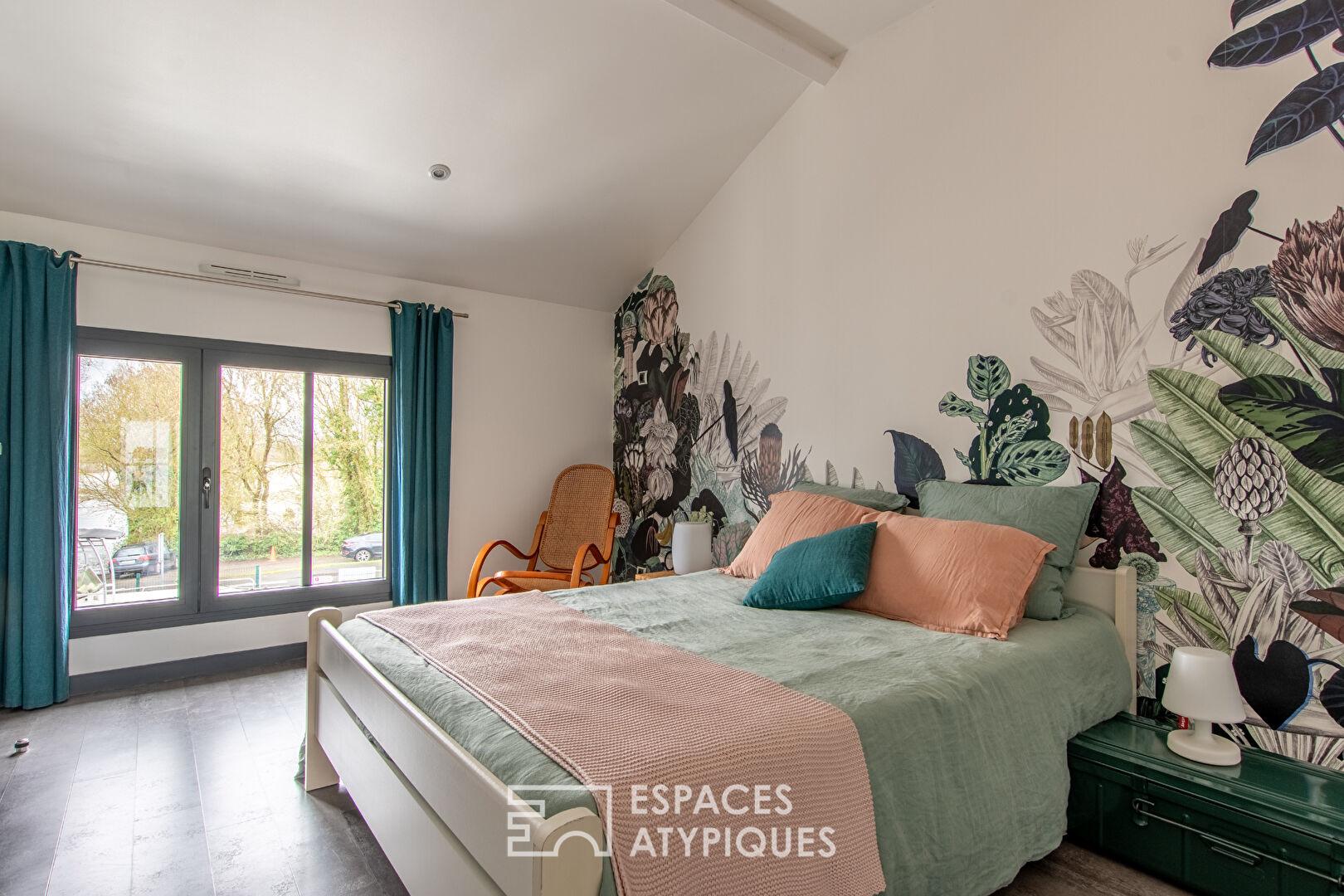 Proche d’Angers, implantée sur une parcelle d’environ 1 600 m², cette ancienne bâtisse entièrement rénovée développe un concept rare et audacieux : conjuguer activité professionnelle et habitat d’exception au sein d’un même lieu.