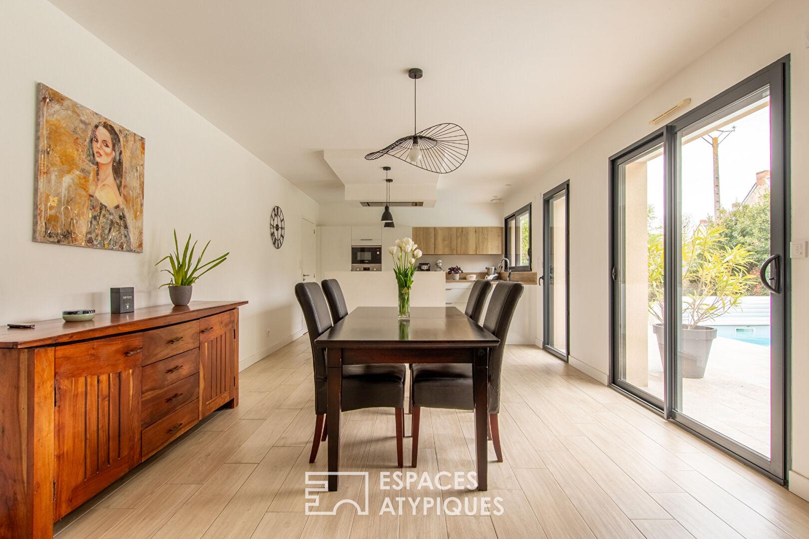 Le rez-de-chaussée s’ouvre sur de généreux volumes, organisés autour d’une belle pièce de vie réunissant séjour, salon et cuisine contemporaine ouverte avec îlot central. De larges baies vitrées en aluminium prolongent naturellement les espaces vers l’extérieur, offrant une continuité harmonieuse avec la vaste terrasse qui borde la piscine. L’ensemble s’inscrit dans un cadre verdoyant, intimiste et préservé des regards.