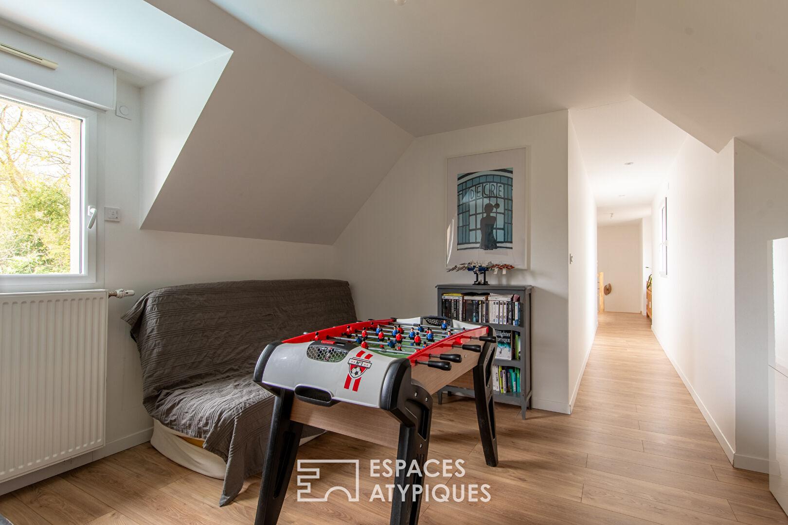 Une suite parentale de plain-pied complète ce niveau. Elle se compose d’une chambre, d’un dressing et d’une salle d’eau, offrant un véritable espace de confort et d’intimité. S’y ajoutent des toilettes indépendantes, une lingerie ainsi qu’un garage. À l’étage, un escalier en bois clair mène à un vaste palier baigné de lumière naturelle, distribuant deux chambres, une salle de bains, des toilettes indépendantes, ainsi qu’un espace polyvalent pouvant accueillir une salle de jeux et un bureau.