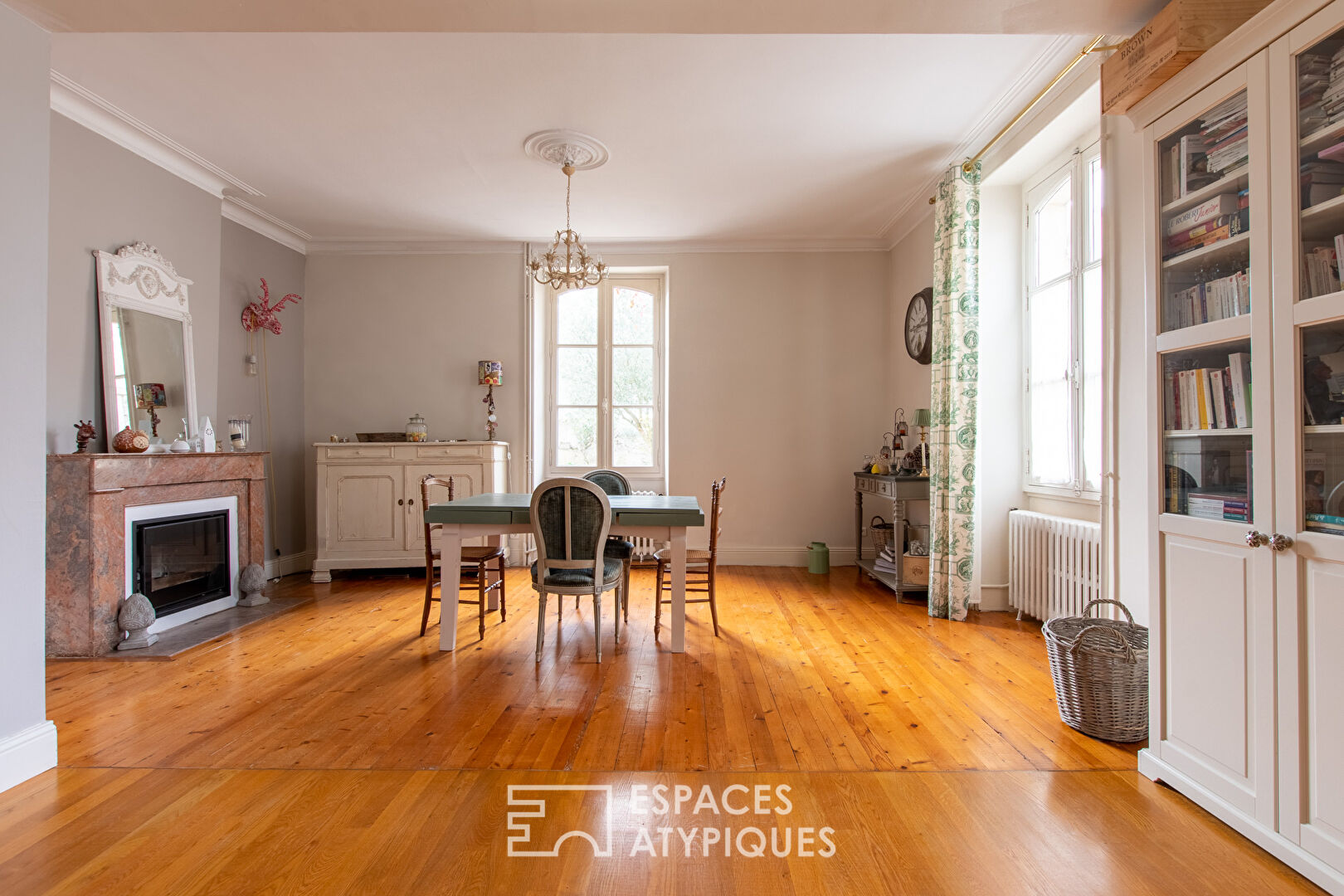 La maison bourgeoise dévoile une belle hauteur sous plafond et séduit par la présence des éléments d’origine. L’entrée dégage une atmosphère chaleureuse et accueillante, et invite à la découverte du lieu. D’un côté, l’espace double salon-séjour aux murs clairs, est agrémenté d’une cheminée de marbre et de l’autre côté, une vaste cuisine familiale ouverte sur le joli jardin. L’escalier ancien mène au palier du premier étage qui distribue trois chambres spacieuses, dont une suite parentale avec salle de bains privative, ainsi qu’un bureau et une salle d’eau. Ces différentes pièces, toutes ponctuées de boiseries et de parquet, ont préservé un cachet indéniable.