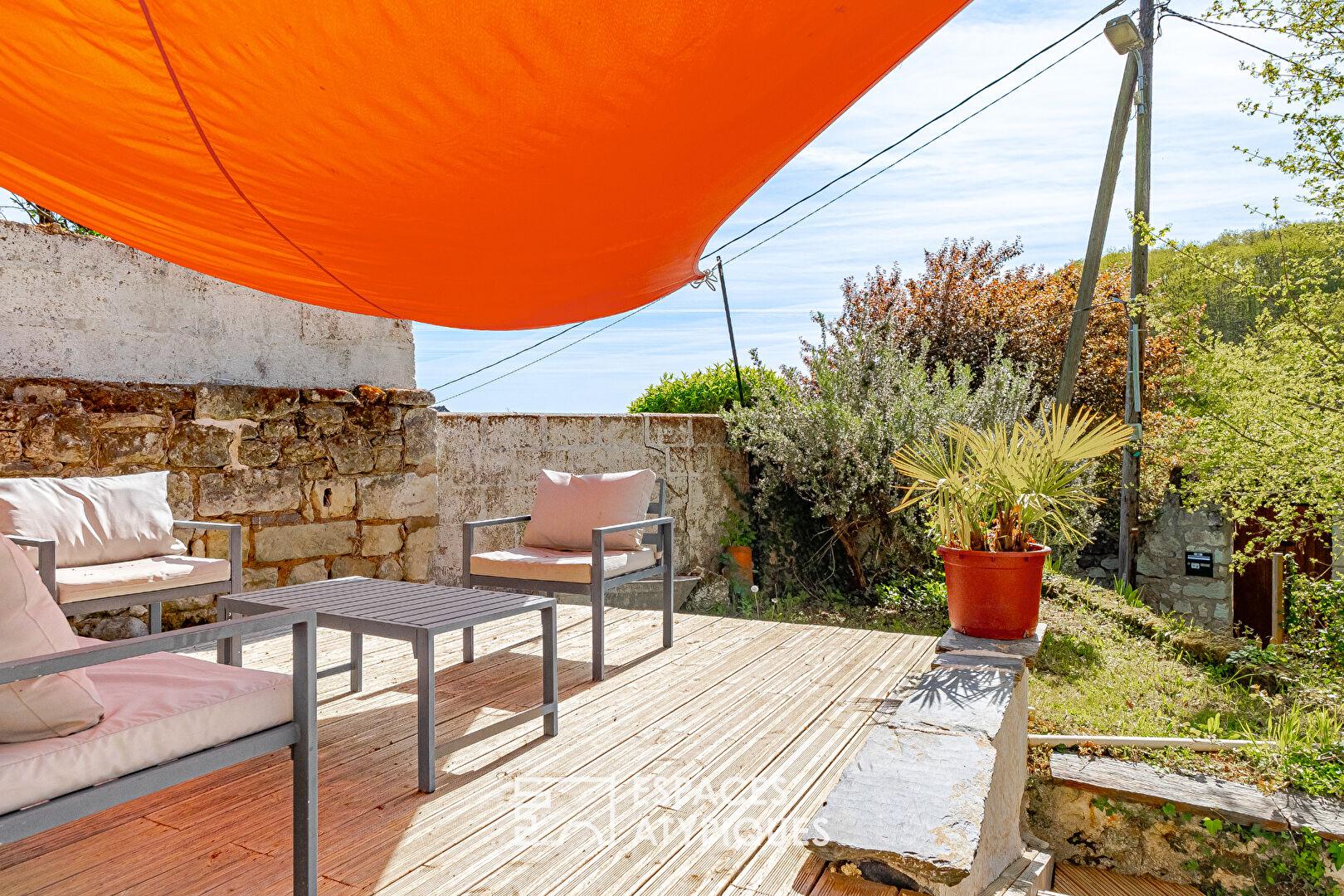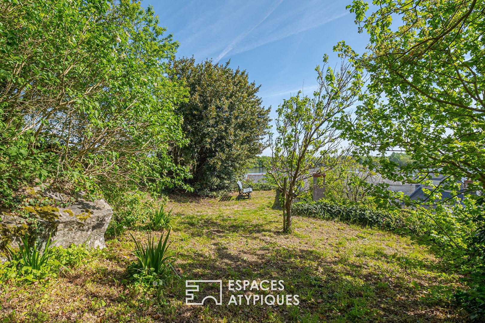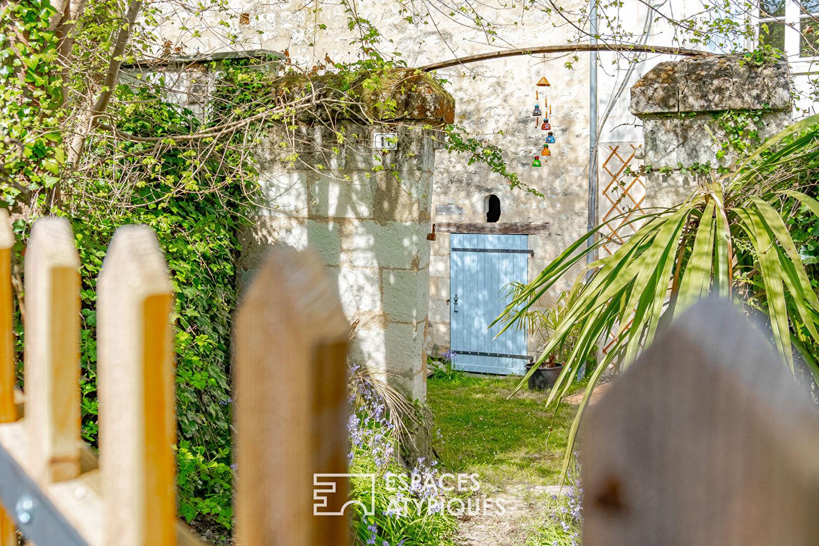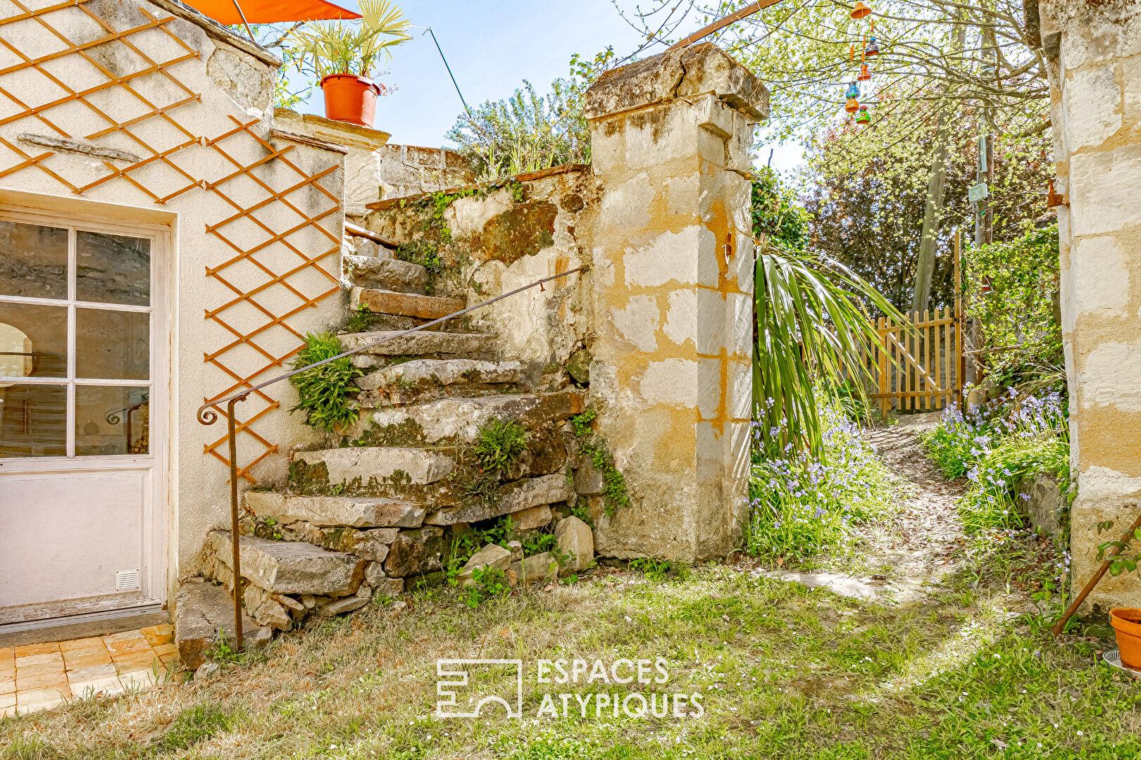 À l’abri des regards, le jardin clos se compose de différents espaces intimistes et de dépendances creusées dans la roche, offrant diverses possibilités de stockage. En surplomb, un terrain dominant dévoile une vue remarquable sur la Loire et son environnement, renforçant le caractère unique de ce bien.