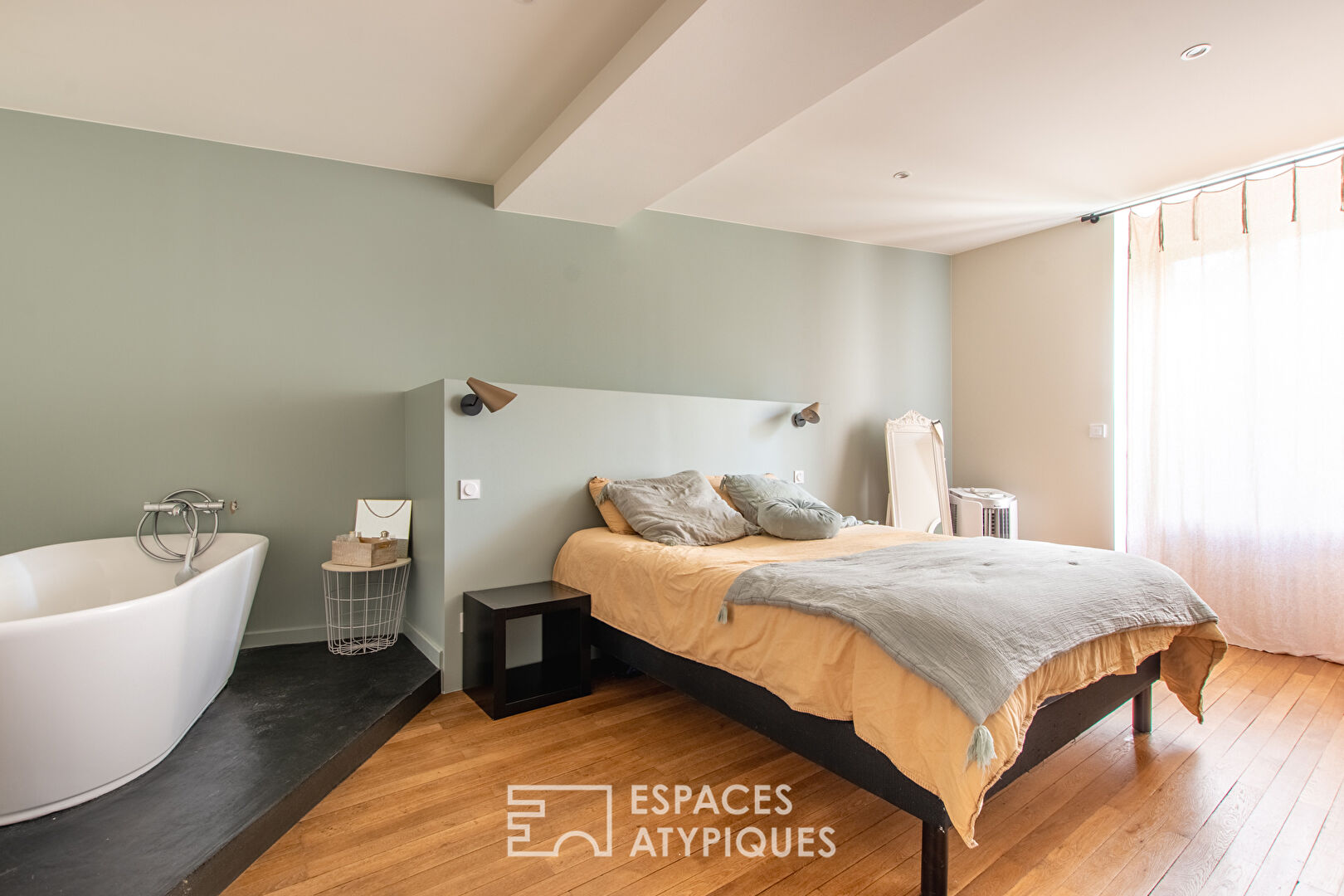 L’entrée permet d’accéder au chaleureux séjour ouvert sur la cuisine équipée et aménagée. Un lieu lumineux alliant une rénovation authentique et moderne. Une possible chambre de plain-pied et salle d’eau reste à aménager. Un escalier en bois conduit aux espaces nuits composés de deux chambres dont une parentale avec dressing, une salle de bain, un bureau et une mezzanine. Un grenier reste à aménager.