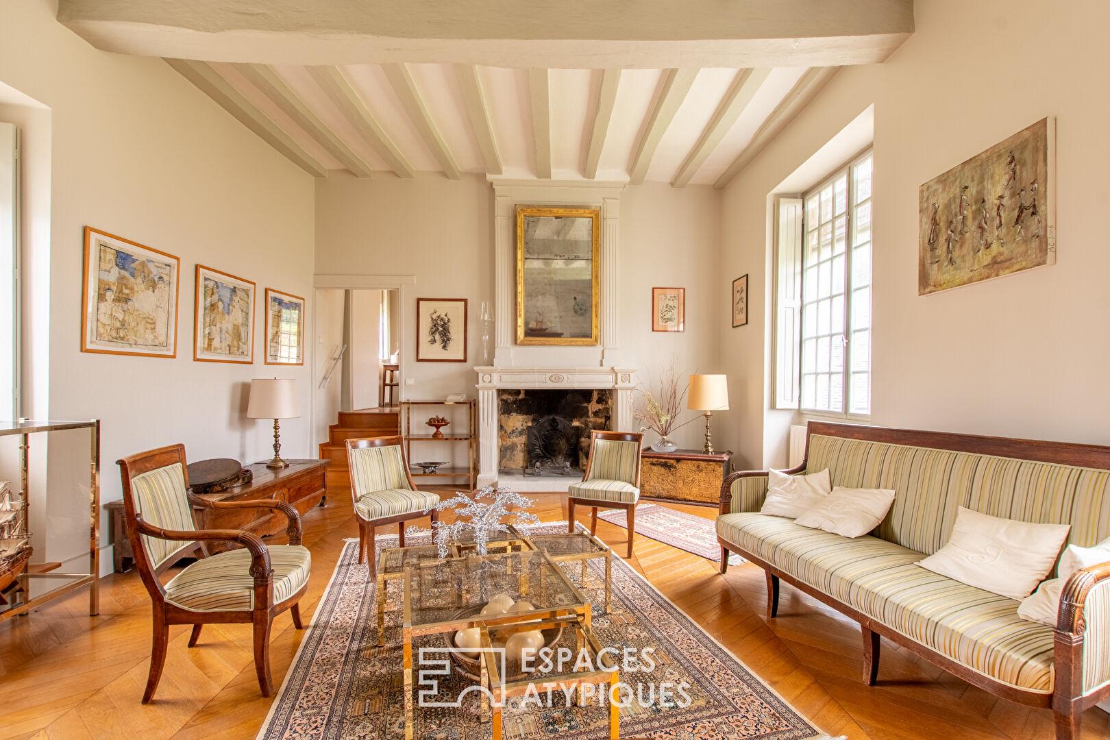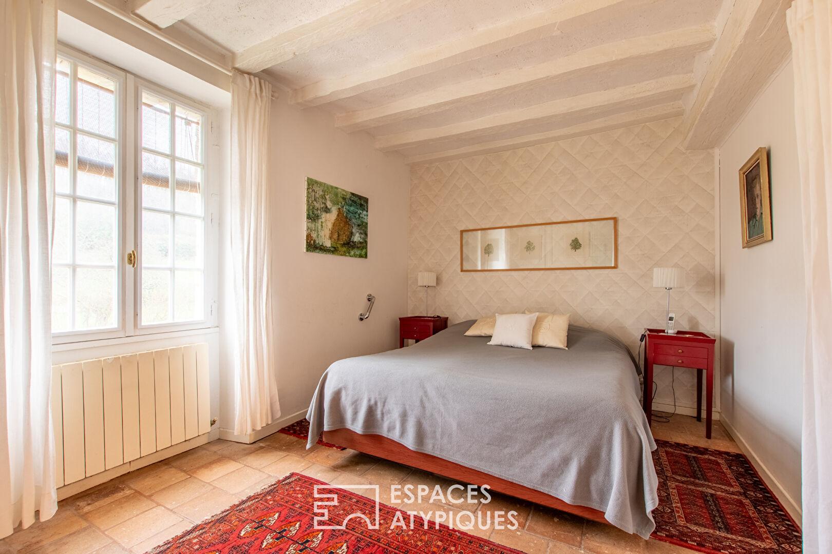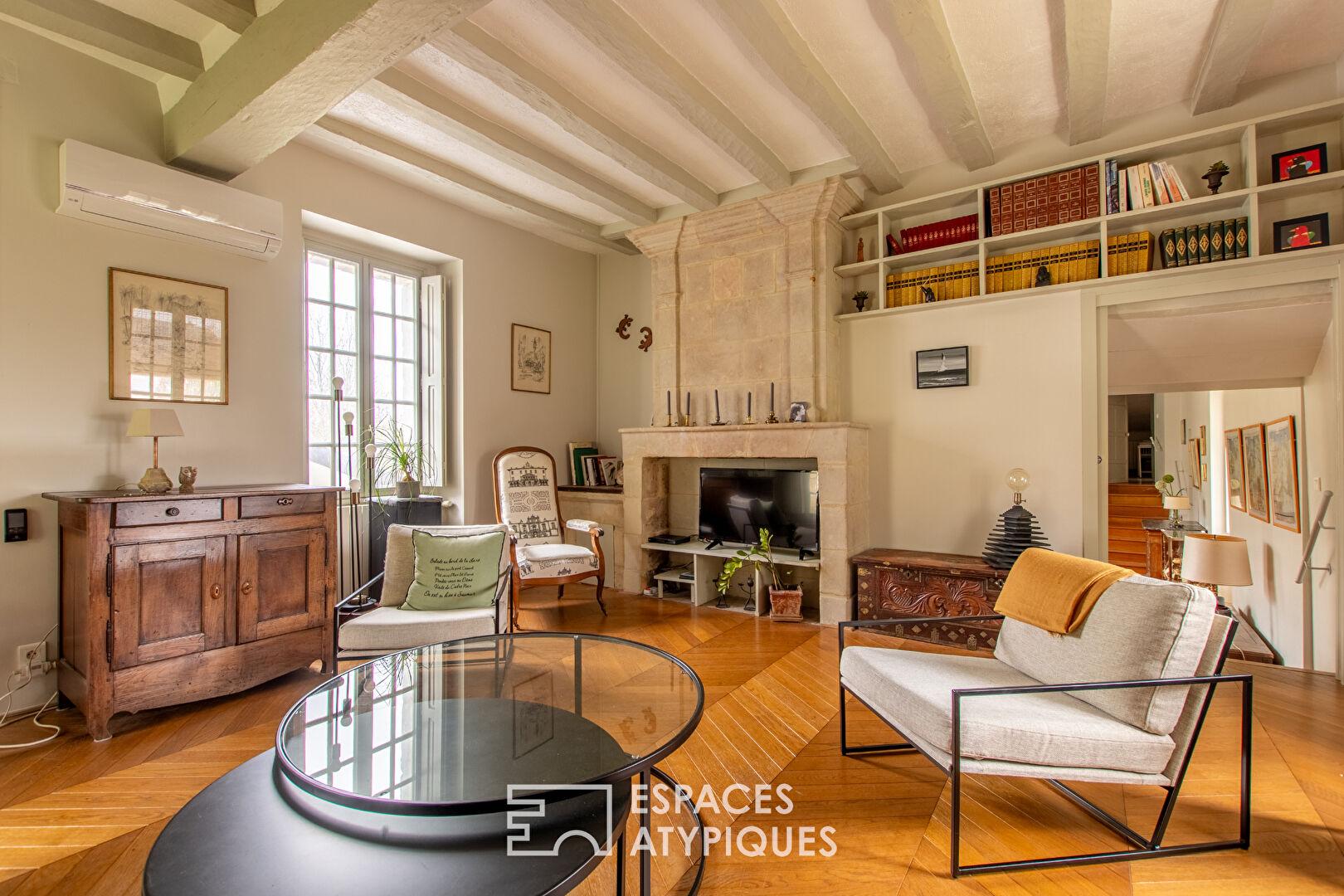 Entièrement rénovée avec des matériaux de qualité, la maison dévoile de beaux volumes et un charme authentique. Le salon, baigné de lumière, s’articule autour d’une superbe cheminée du XVIIe siècle et d’un élégant parquet en point de Hongrie qui souligne le caractère du lieu. Les espaces de vie proposent une atmosphère chaleureuse où les éléments anciens dialoguent harmonieusement avec une rénovation soignée. L’ensemble accueille cinq chambres confortables, deux salles de bains et une salle d’eau, offrant une distribution fluide idéale pour une vie familiale ou une maison de caractère dédiée à la réception. En sous-sol, une cave voûtée datant du XIIe siècle rappelle l’histoire ancienne de cette propriété singulière.