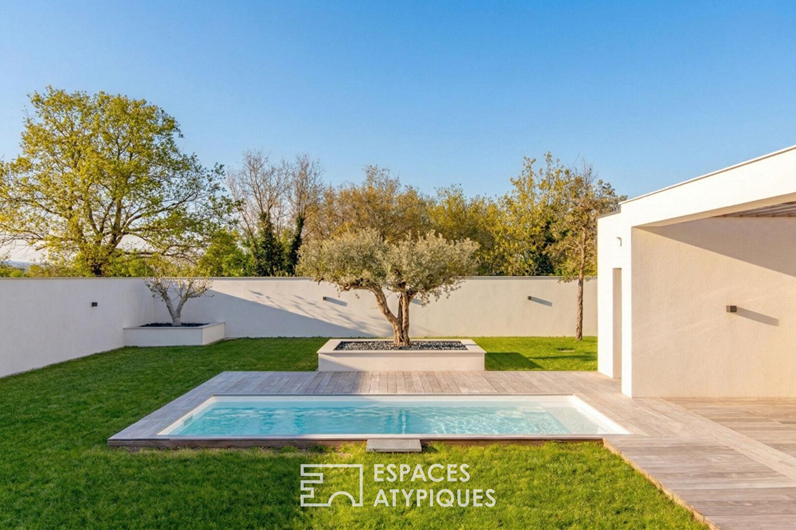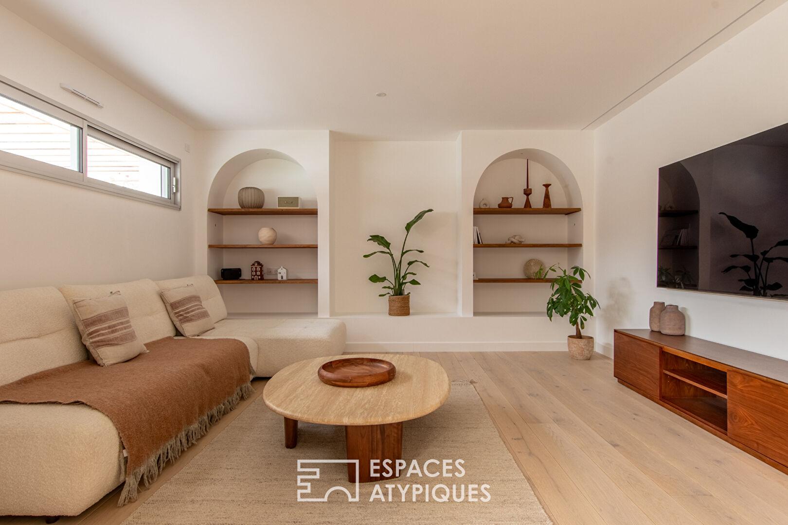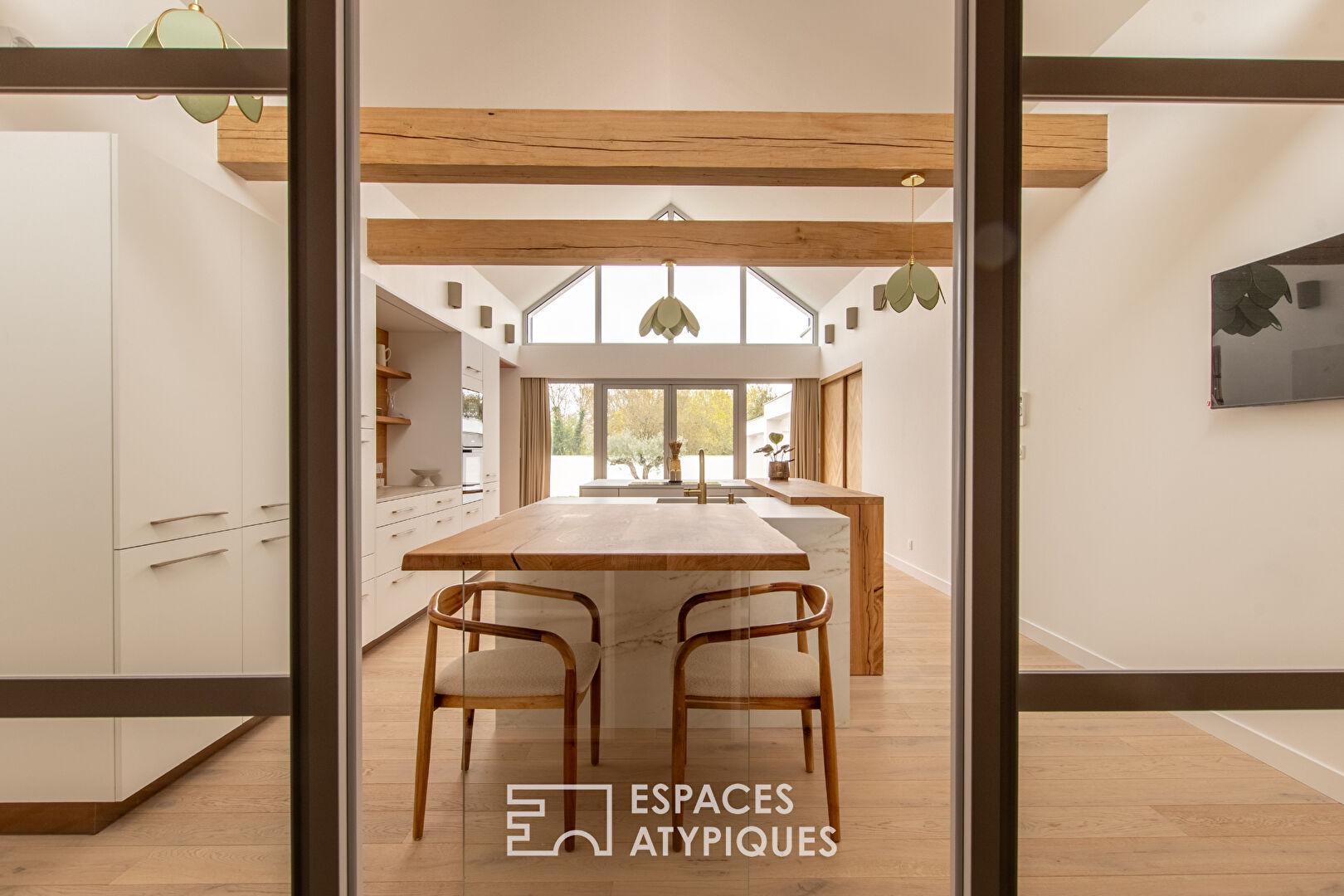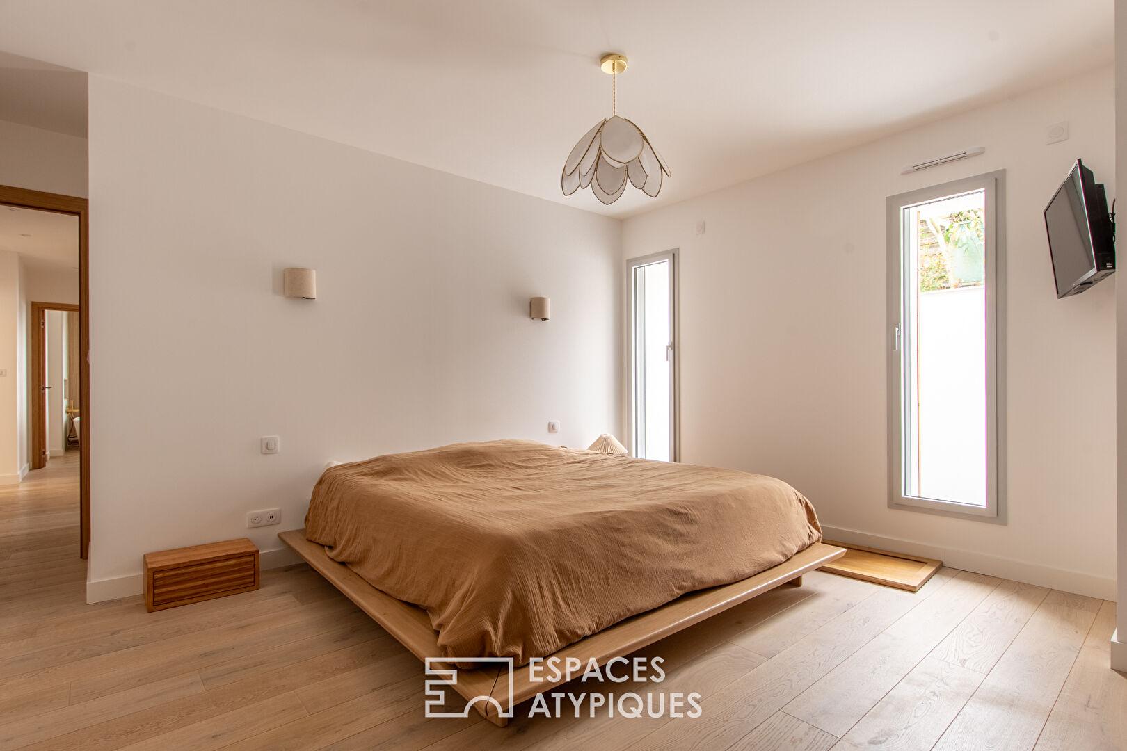 Issue d’une écriture architecturale singulière, cette contemporaine d’architecte de plain-pied déploie une esthétique résolument épurée, où chaque ligne est pensée pour sublimer les volumes et la lumière, signature d’un lieu à la fois élégant et chaleureux.