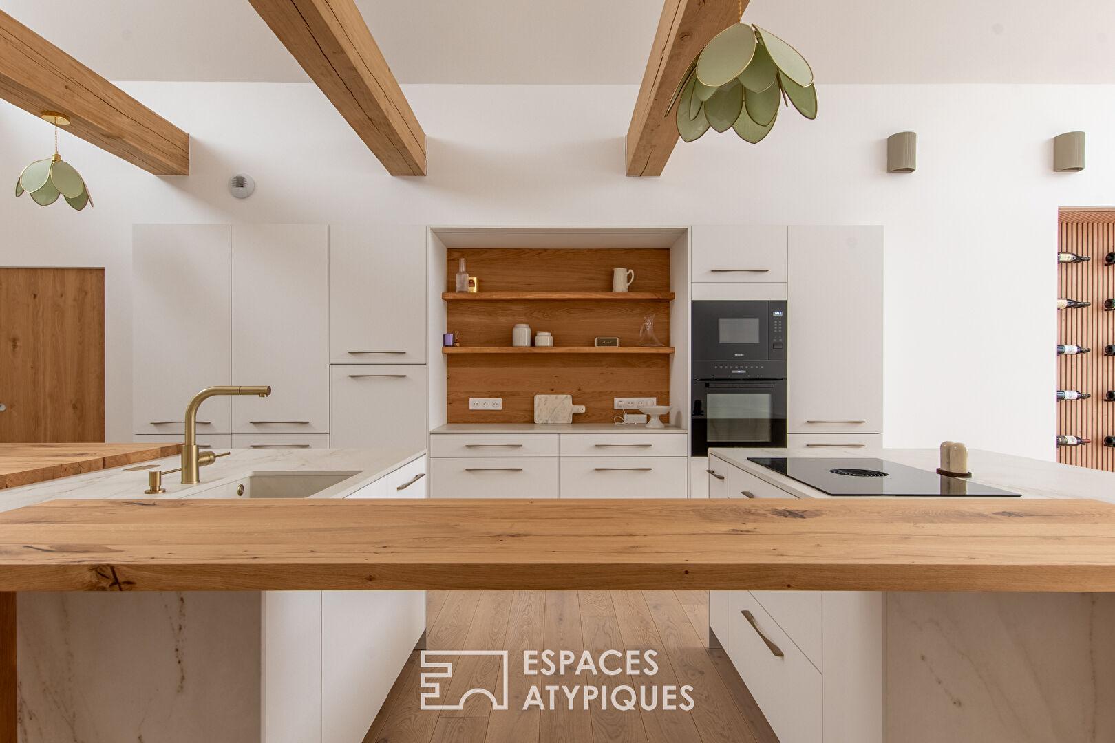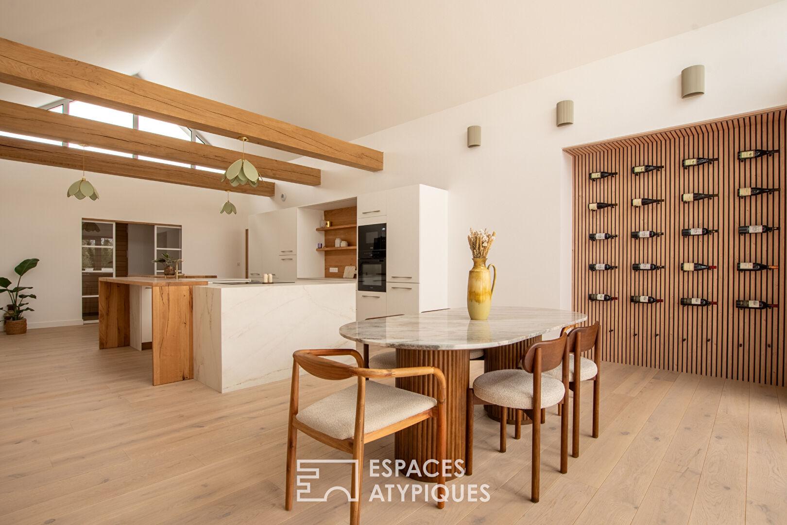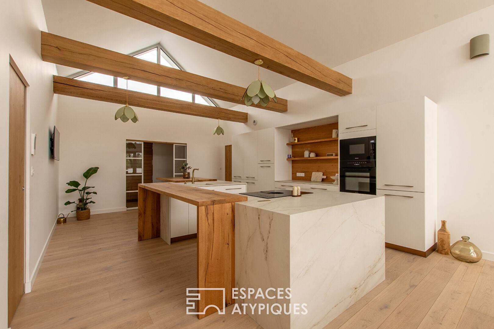 L’entrée, parfaitement aménagée, s’ouvre sur une pièce de vie élégante et raffinée, rythmée par une hauteur sous plafond généreuse et magnifiée par des poutres apparentes ainsi qu’une lumière naturelle omniprésente, créant une sensation de calme absolu. La cuisine, parfaitement intégrée et aux finitions soignées, s’ouvre sur le séjour dans un esprit convivial et raffiné. Les matériaux, choisis avec exigence, conjuguent chaleur et modernité. Dans son prolongement, un salon intimiste trouve naturellement sa place.