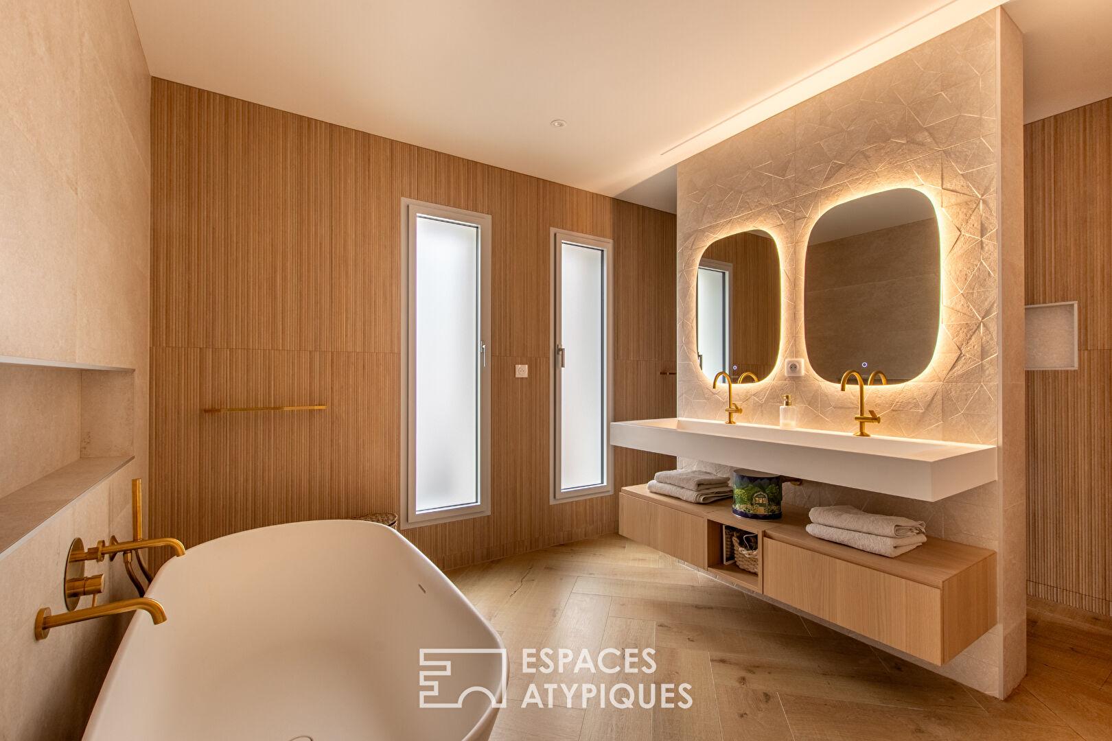 L’espace nuit se compose de trois chambres, dont une suite parentale pensée comme un véritable cocon, agrémentée de son dressing. Une salle d’eau aux finitions remarquables vient compléter l’espace, où baignoire et double douche cohabitent avec justesse dans un esprit à la fois esthétique et fonctionnel. Un bureau vient parfaire l’ensemble, idéal pour le télétravail ou un espace dédié aux loisirs.