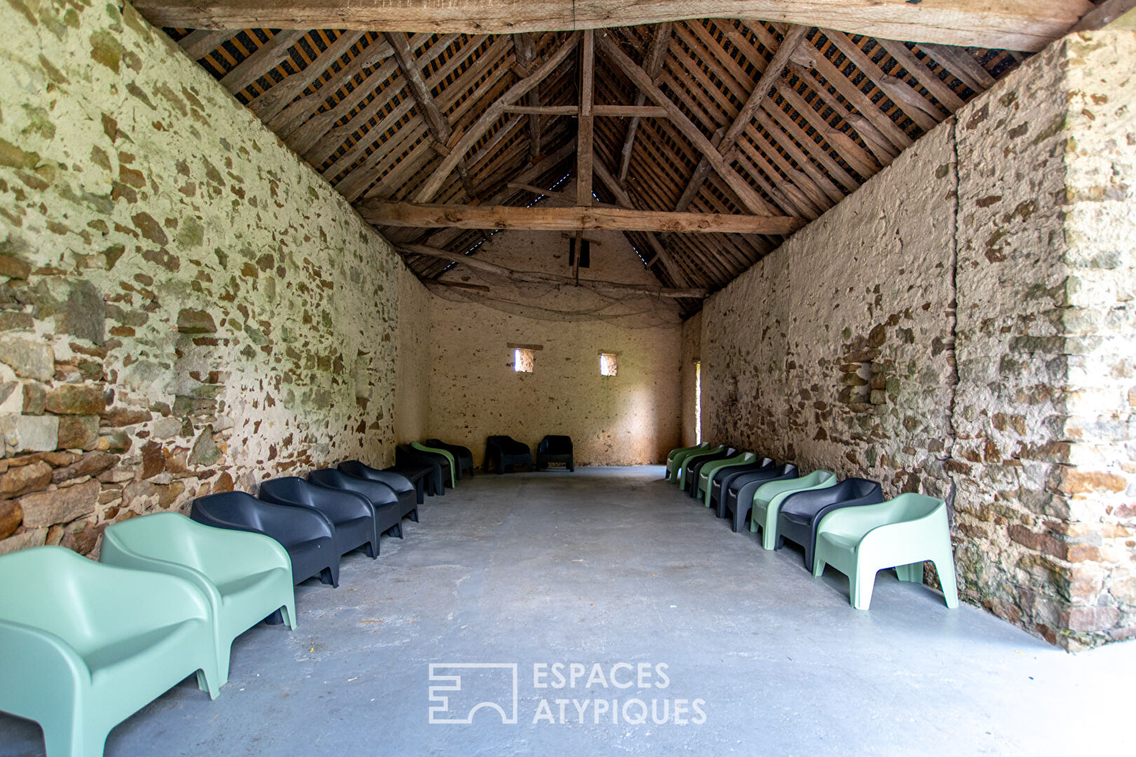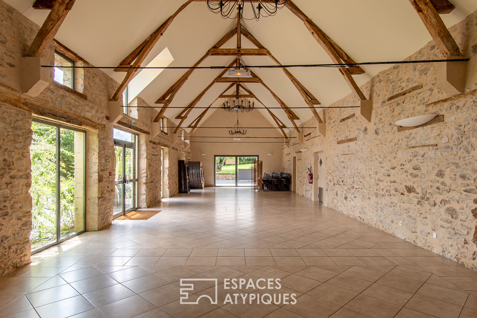 L’ancienne grange qui a été investie en grande salle de réception présente un beau volume sous poutres apparentes et a été conçue intégrant la norme PMR, pouvant accueillir 140 personnes assises. Elle est complétée d’une cuisine traiteur pour remise en température et cellules réfrigérées, un vestiaire, des sanitaires, un espace bébé, et d’un parking public. Cet ensemble bâti d’environ 200m2 est prolongé d’une belle terrasse de 80m2 entourée de verdure.