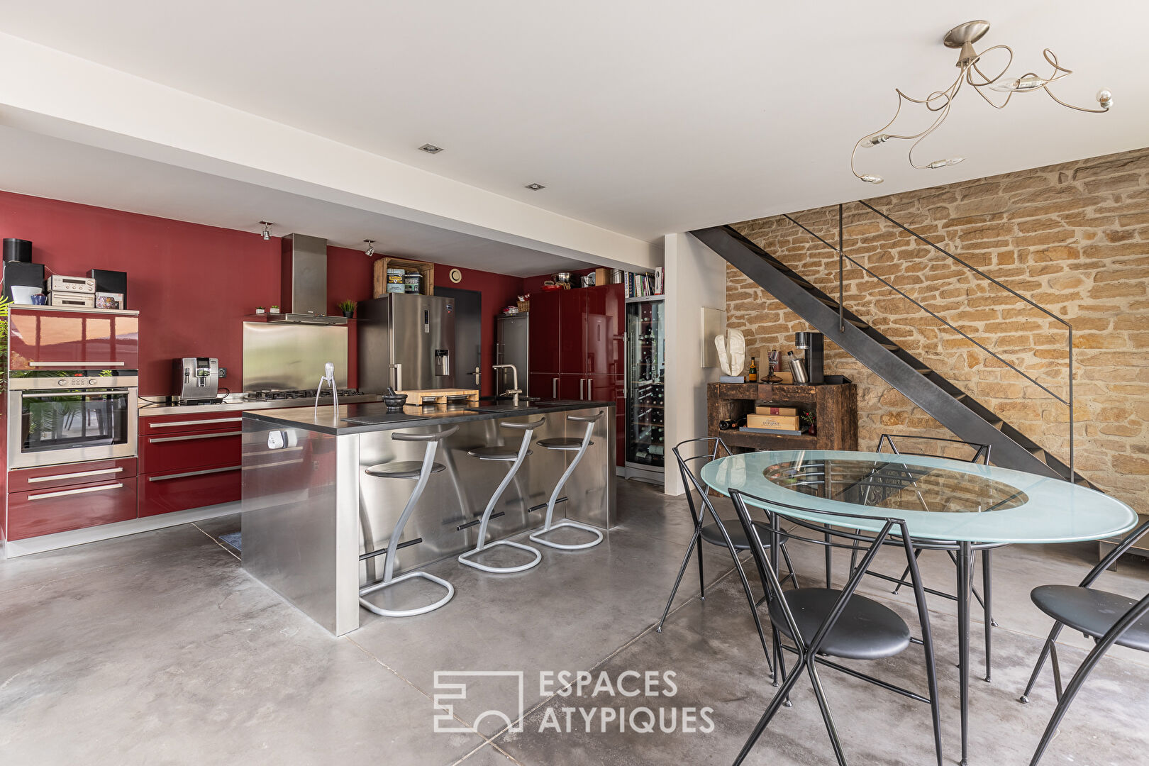 L’entrée s’ouvre sur l’espace de vie, véritable coeur vibrant du lieu dont l’impressionnante hauteur sous plafond laisse entrevoir les poutres de la charpente apparente. Surplombée par des nombreuses ouvertures zénithales, la pièce baignée de lumière offre une atmosphère à la fois originale et apaisée. La cuisine ouverte, accompagnée de son espace dînatoire se trouvent blotti sous un retour du bâtiment, marquant ainsi une distinction avec le séjour, tout en laissant circuler la lumière. De larges baies vitrées définissent la transition avec le patio.