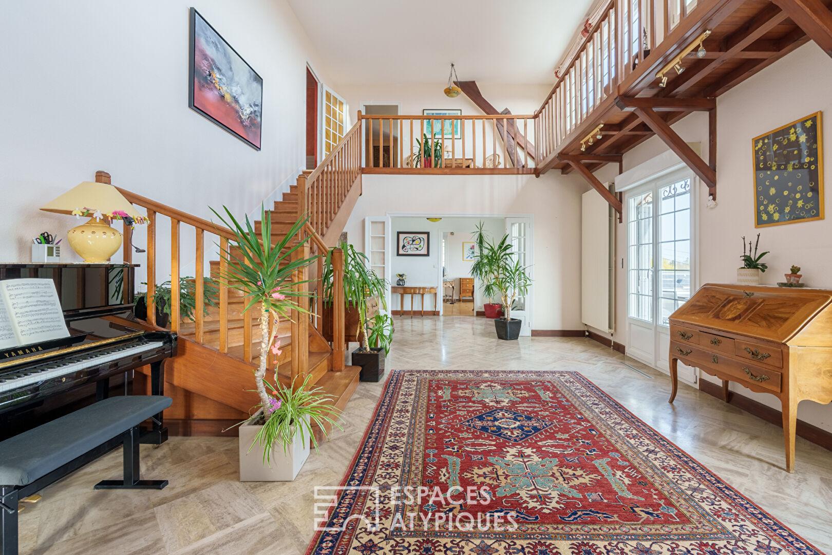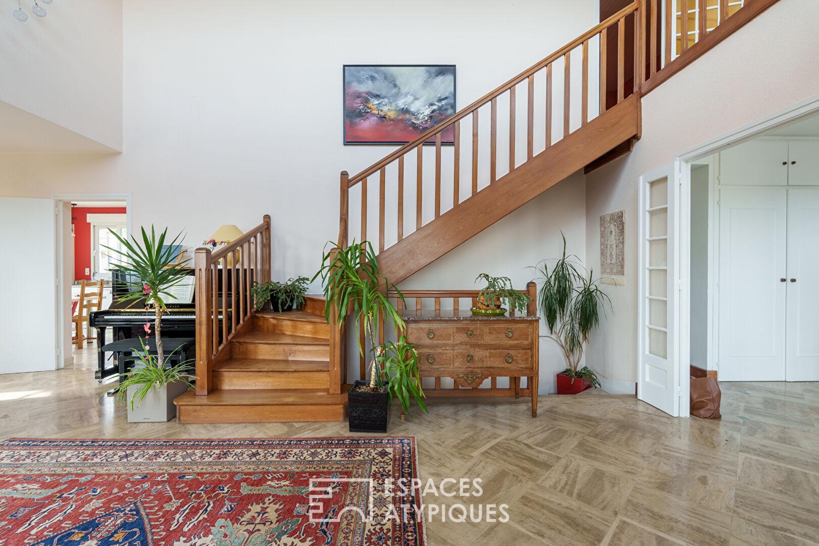 Située au calme d’un chemin confidentiel sur les hauteurs prisées de Saint-Max, cette propriété singulière des années 70 déploie ses 300 m² de volumes généreux sur une parcelle de 10 ares. Alliant le charme architectural de son époque à une extension récente, elle propose une expérience de vie dedans-dehors unique grâce à ses multiples terrasses, dont une terrasse panoramique surplombant la plaine Est de Nancy.