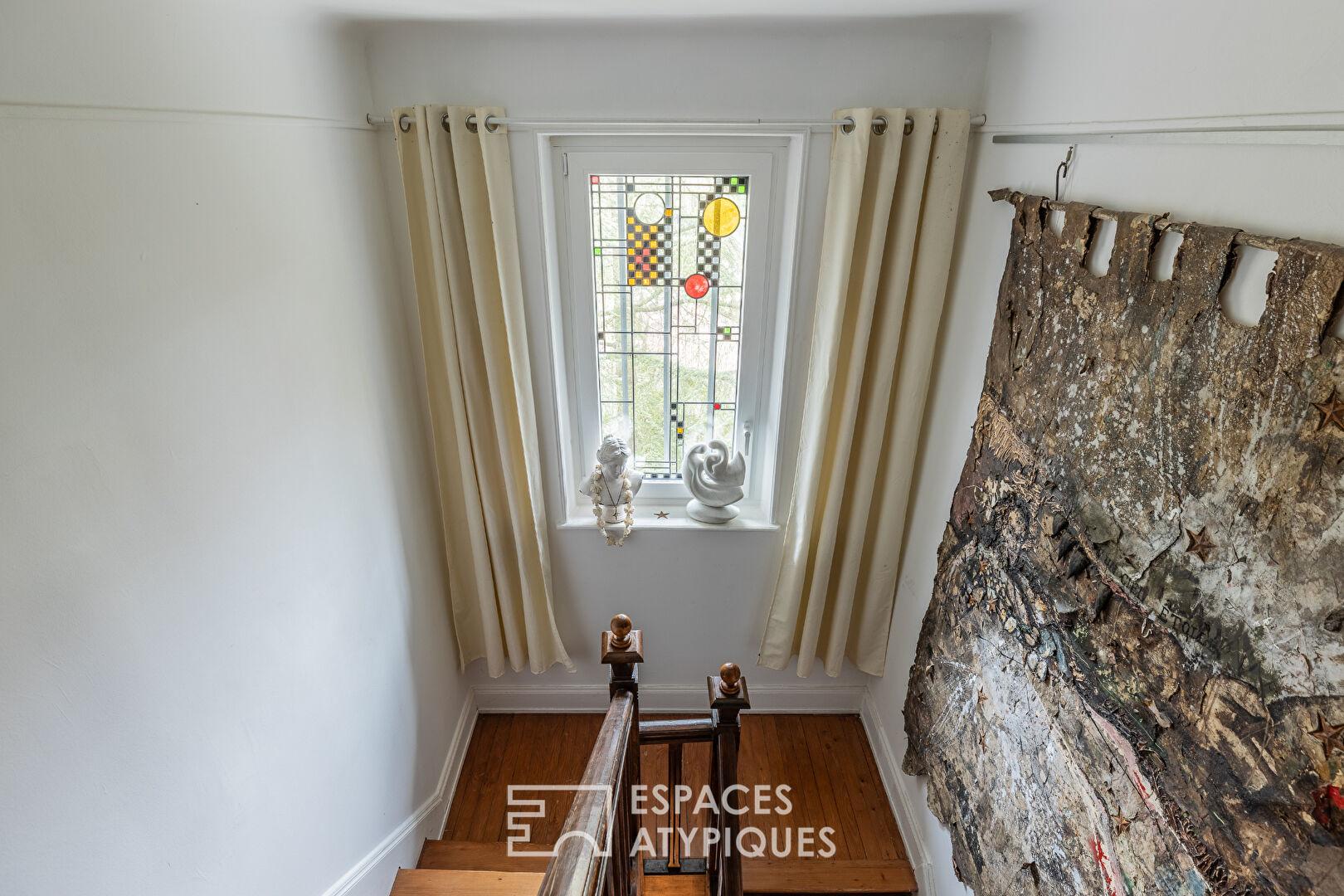 L’entrée, ornée de son carrelage authentique, ouvre sur un bureau feutré et un double séjour traversant où le parquet massif et le poêle à bois apportent une chaleur immédiate. La salle à manger communique avec une cuisine équipée, prolongée par une véranda baignée de lumière. Les deux portes-fenêtres, parées de vitraux aux motifs travaillés, offrent une perspective apaisante sur la nature environnante. Un escalier en bois massif distribue les étages, ponctué sur chaque palier par des fenêtres aux vitraux Art Déco qui colorent la lumière naturelle. Le premier niveau accueille trois chambres, dont une suite avec douche, un dressing et une salle d’eau rénovée. Sous les combles, une quatrième chambre et un bureau révèlent des poutres apparentes pour une ambiance cosy. Un sous-sol complet, intégrant chaufferie, buanderie et de larges espaces de stockage, vient parfaire les prestations de la maison.