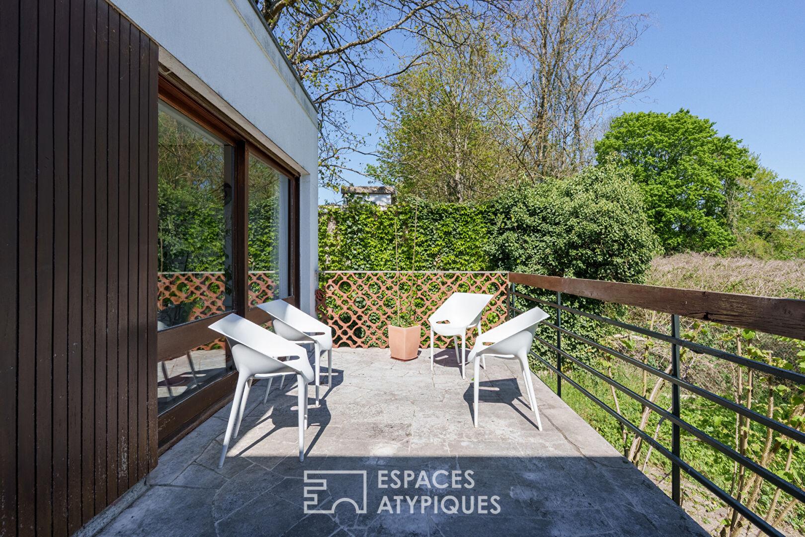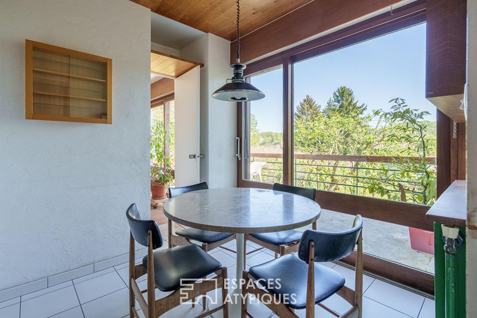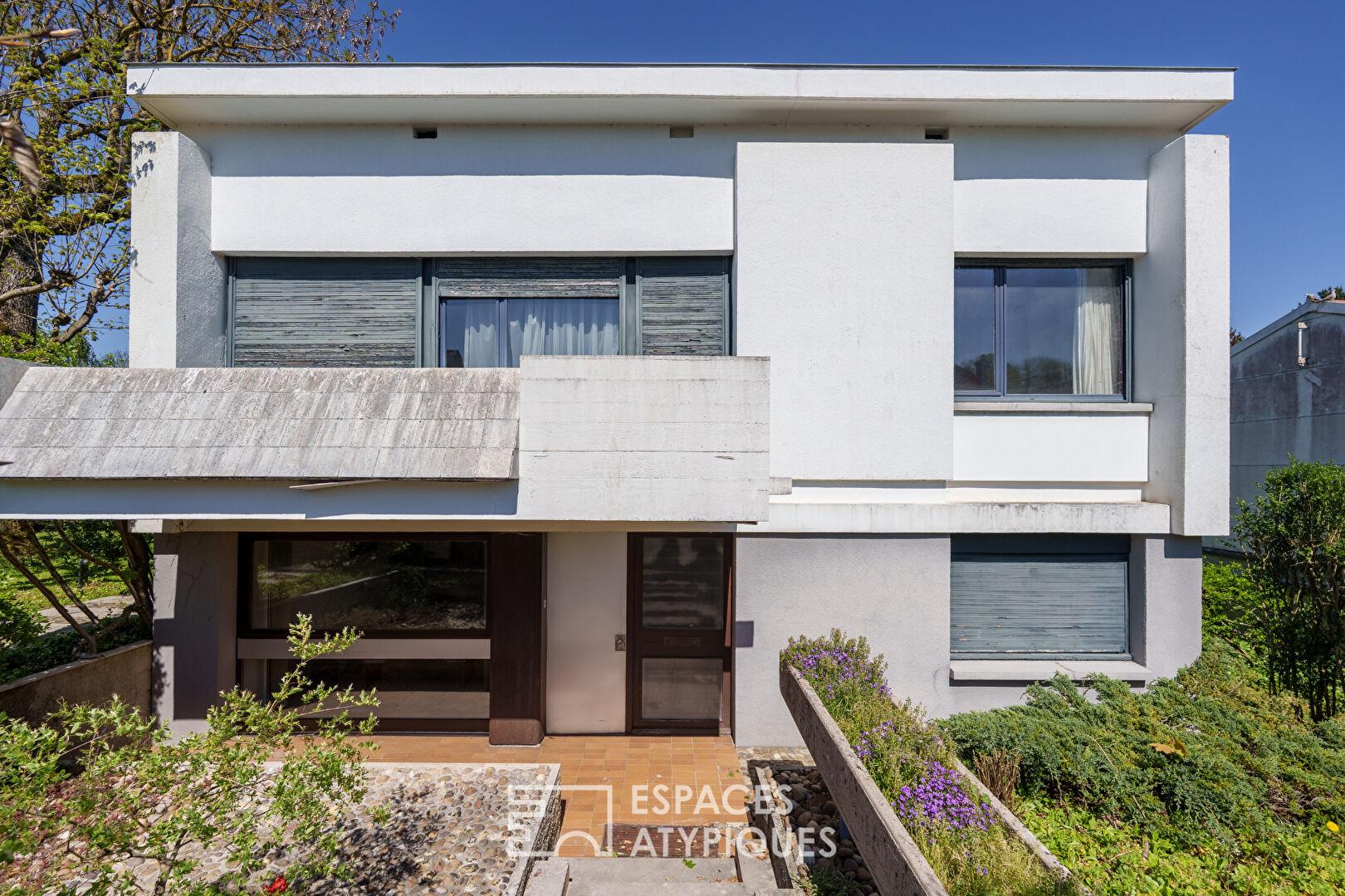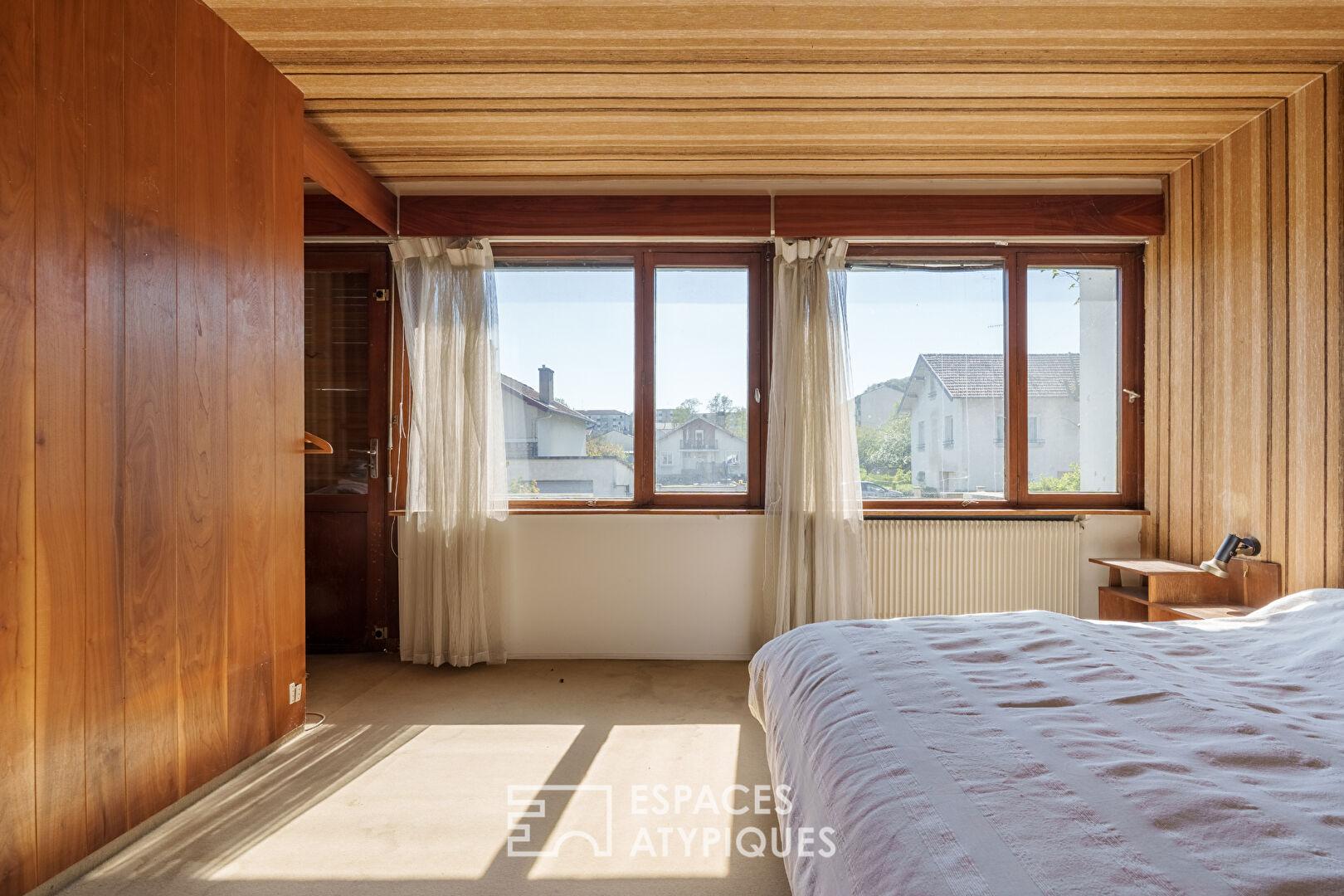 Située en centre-ville de Saint-Mihiel, surnommée la « petite Florence lorraine », cette villa d’architecte emblématique de 1960 déploie ses 360 m² au coeur d’un terrain arboré de 10 ares. Véritable manifeste du mouvement moderniste, cette demeure singulière se distingue par ses volumes audacieux, ses larges ouvertures et une distribution pensée pour la fluidité.