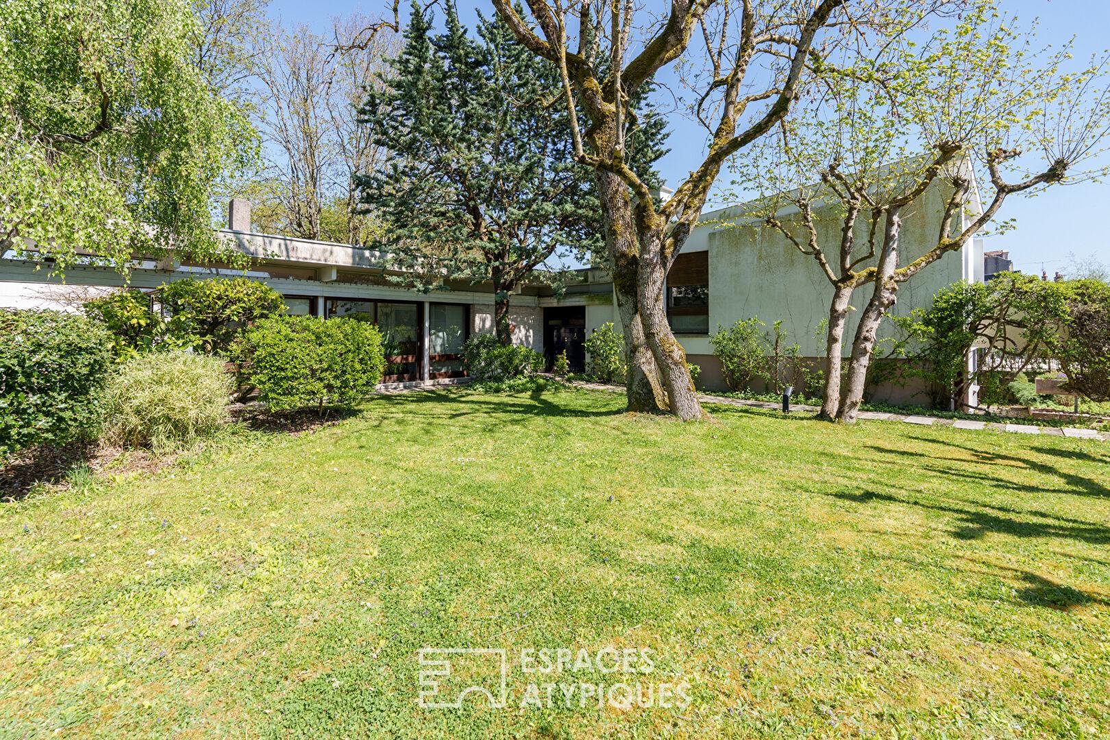 Les extérieurs sont à l’image de l’architecture : structurés et apaisants. Le jardin enveloppe la maison d’un écran de verdure. Un garage complète ce bien rare. L’emplacement est privilégié, permettant de rejoindre les commerces, les écoles et le collège en seulement quelques minutes de marche.