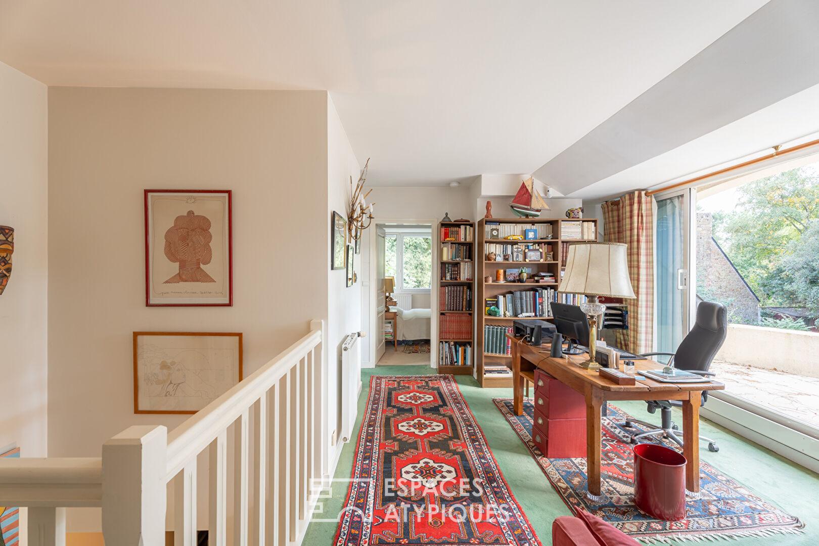 À l’étage, une mezzanine lumineuse ouverte sur terrasse distribue trois chambres aux ambiances distinctes, dont une avec dressing, ainsi qu’une salle d’eau, une salle de bains et un wc. L’ensemble est pensé pour allier confort et indépendance.