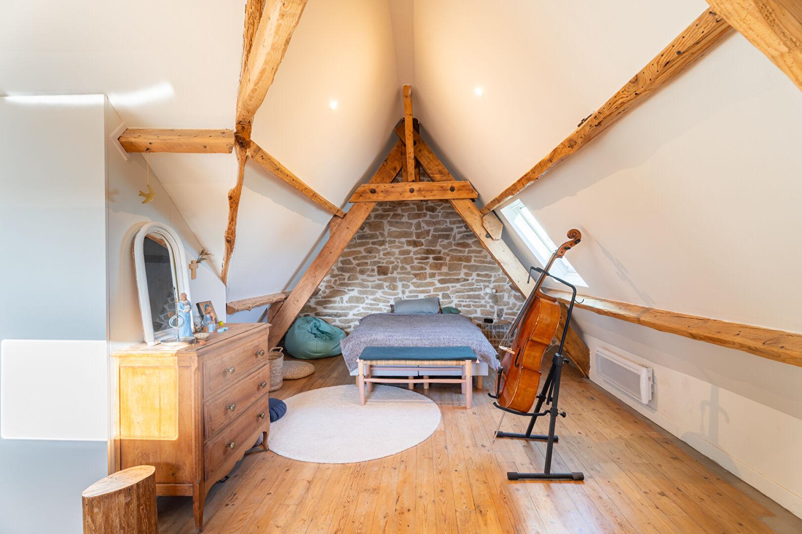Le second étage, sous rampants, accueille une chambre, une salle d’eau et un WC.