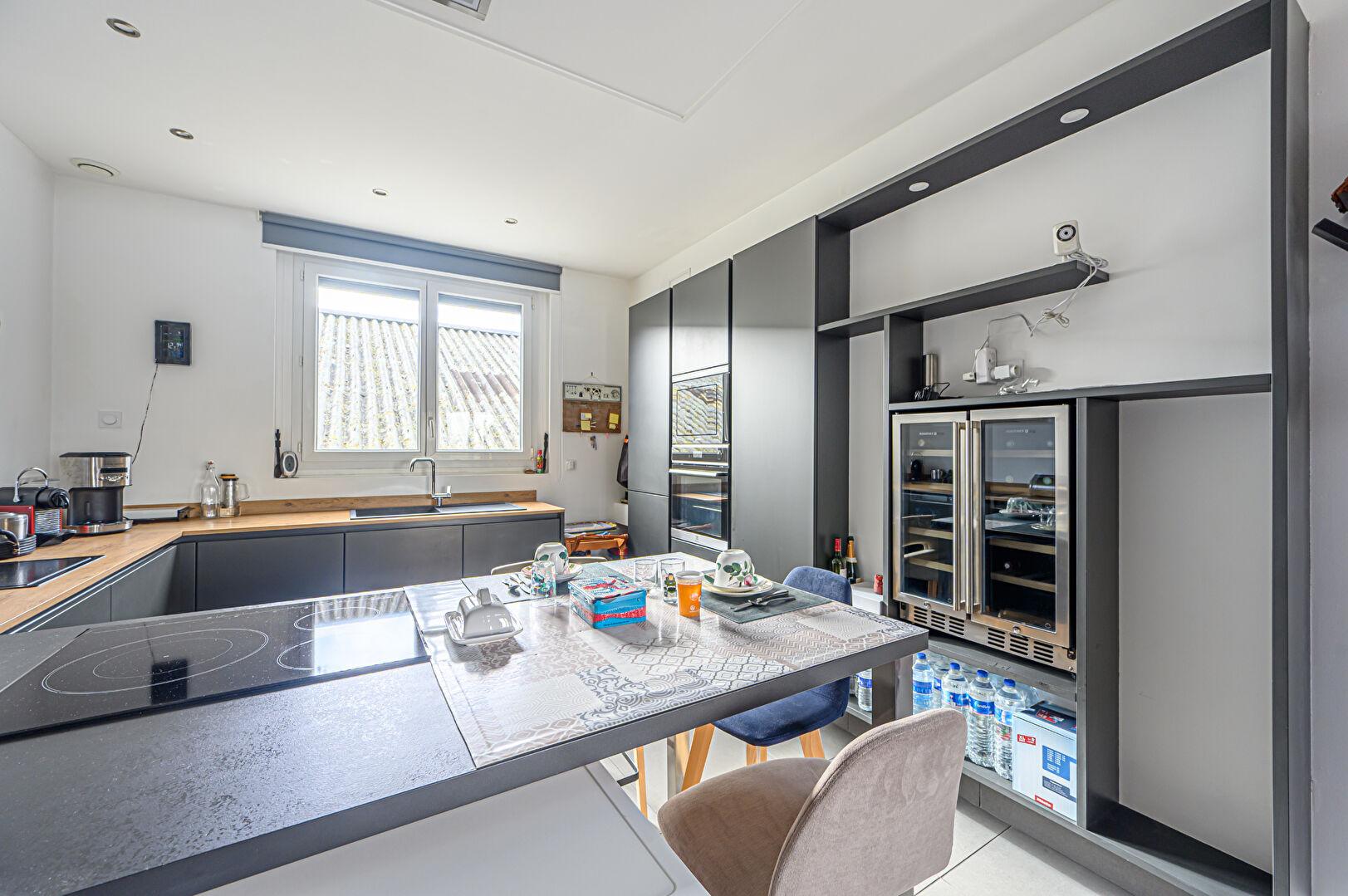 La cuisine ouverte, aménagée et parfaitement équipée, s’intègre harmonieusement à l’espace salon-séjour pour créer un lieu de vie convivial.