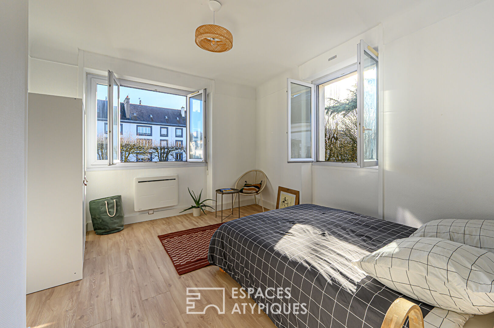 Niché au deuxième étage d’un immeuble emblématique de l’architecture Lorientaise après-guerre, cet appartement traversant, tout récemment rénové, se déploie sur environ 80 m².
