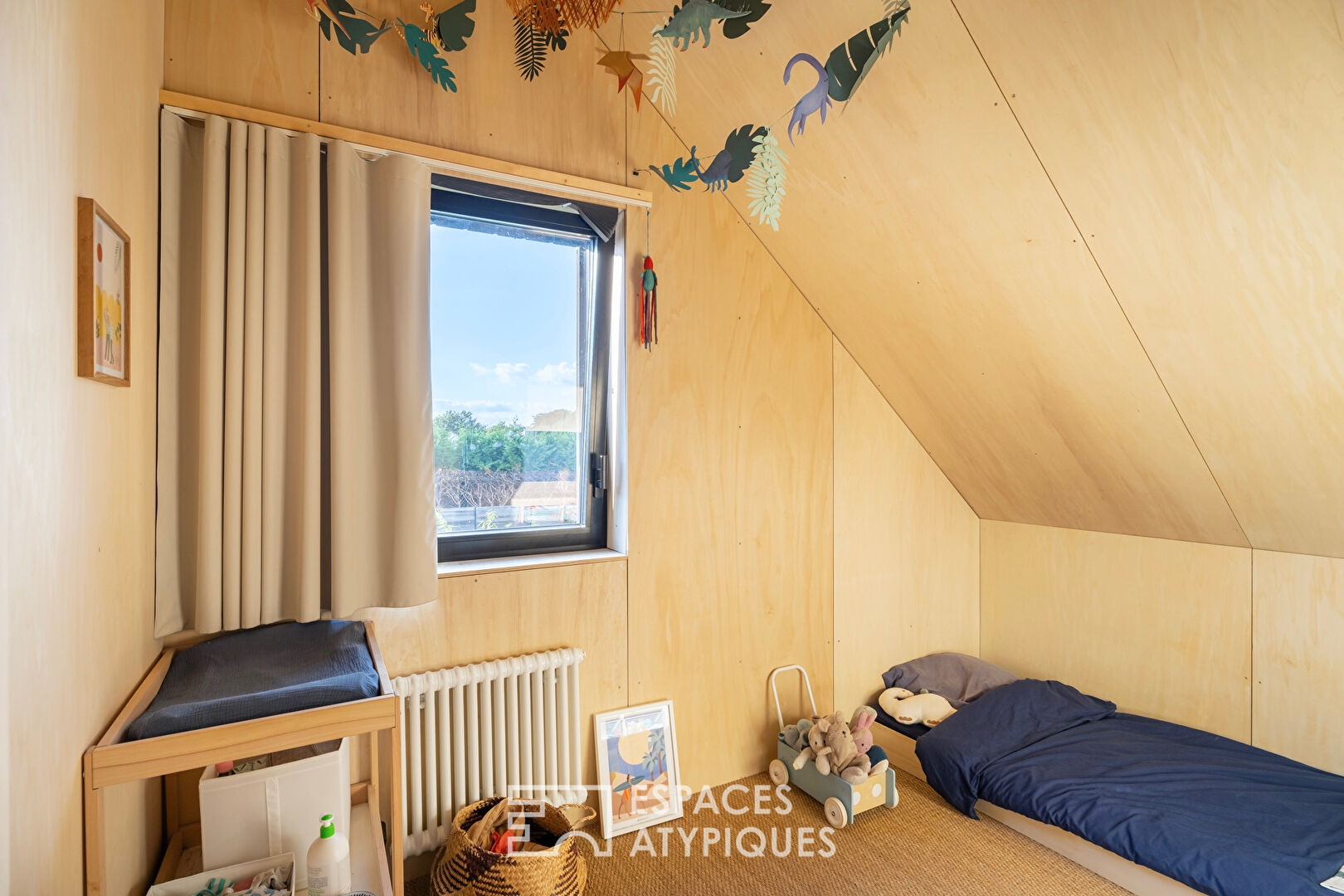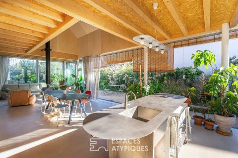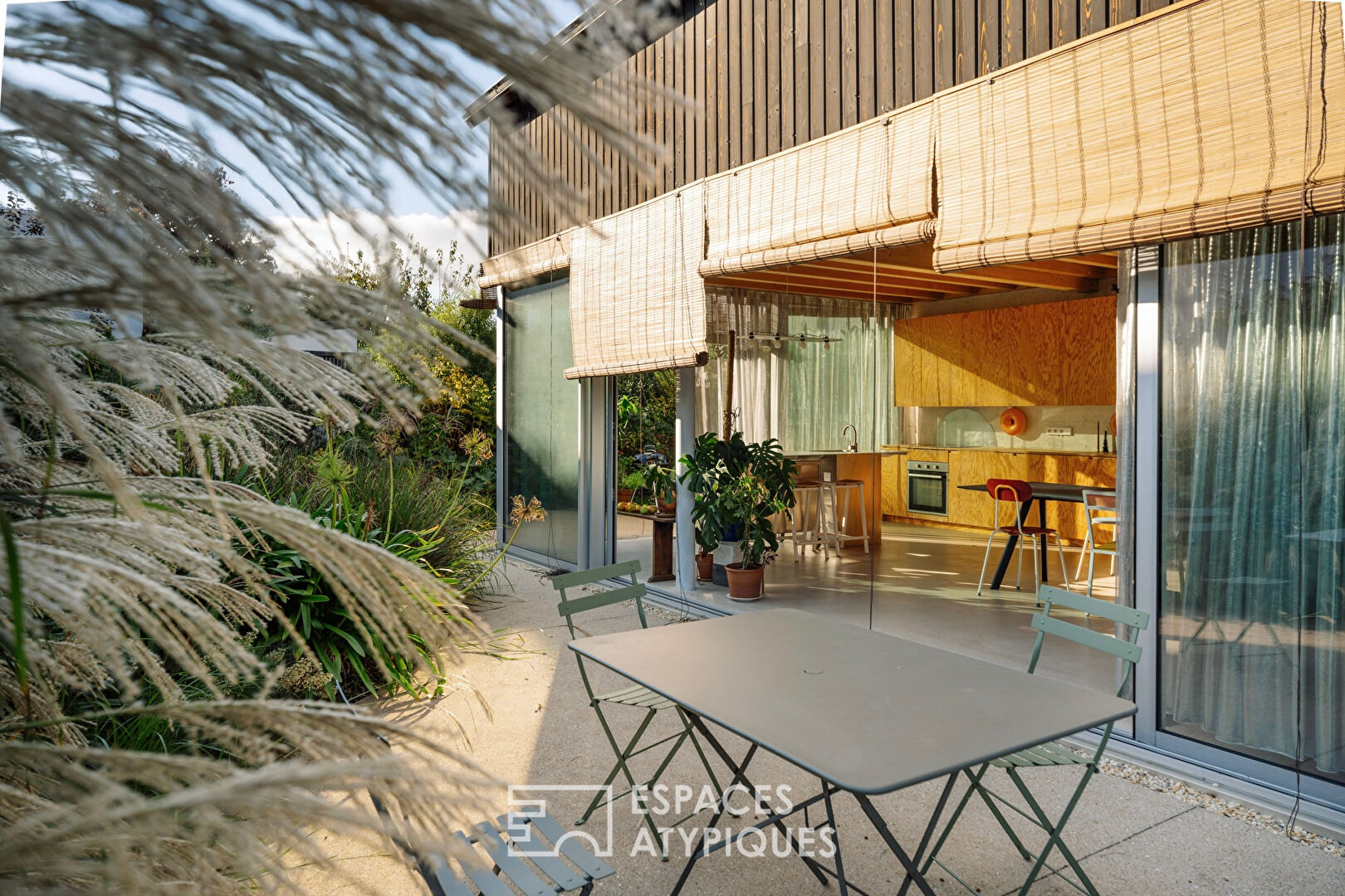 Le jardin généreusement planté s’inscrit harmonieusement dans l’architecture de la maison, créant un prolongement naturel des espaces intérieurs.
