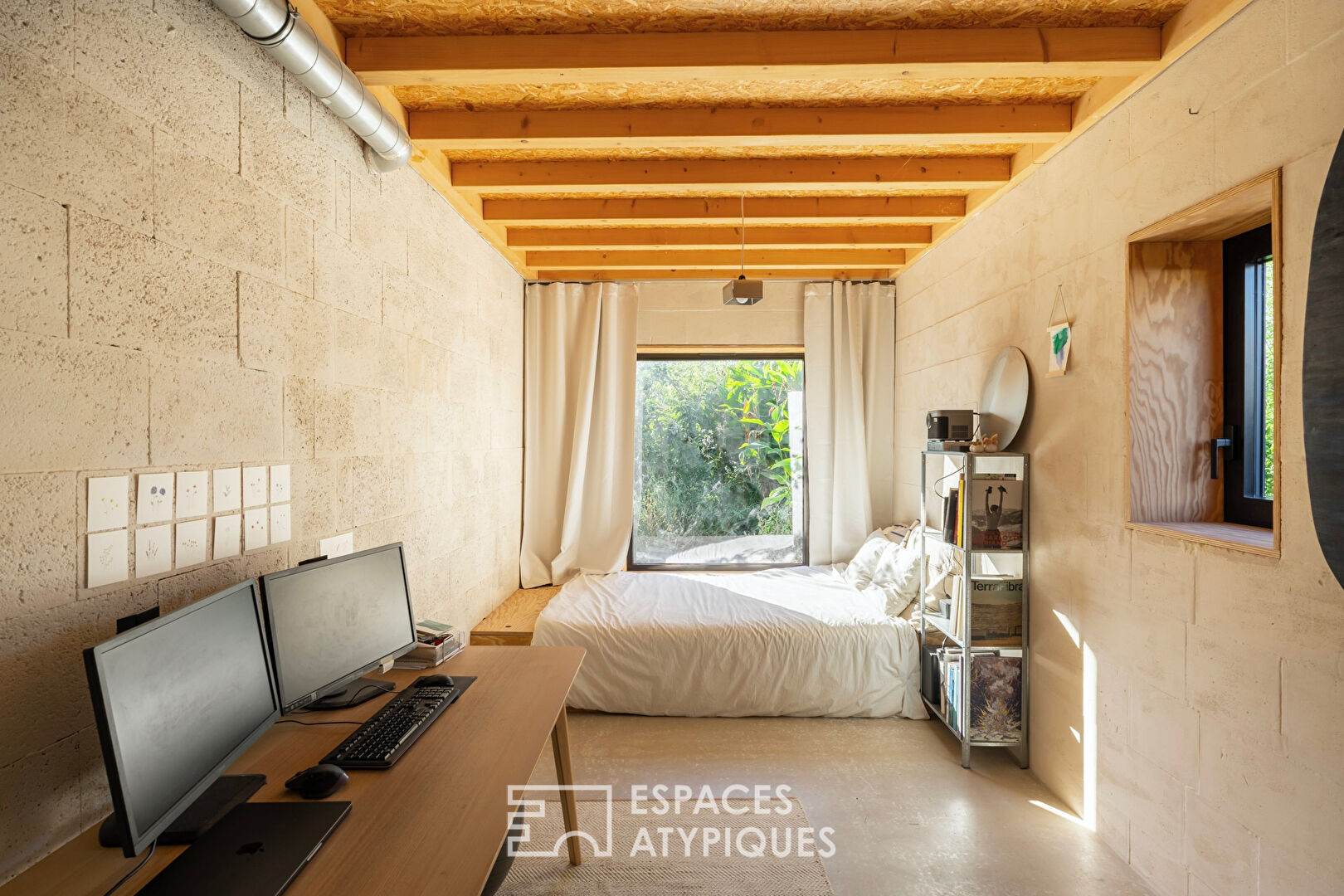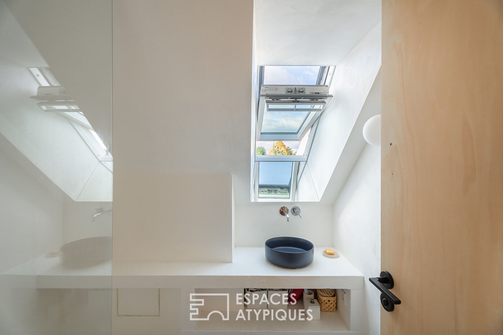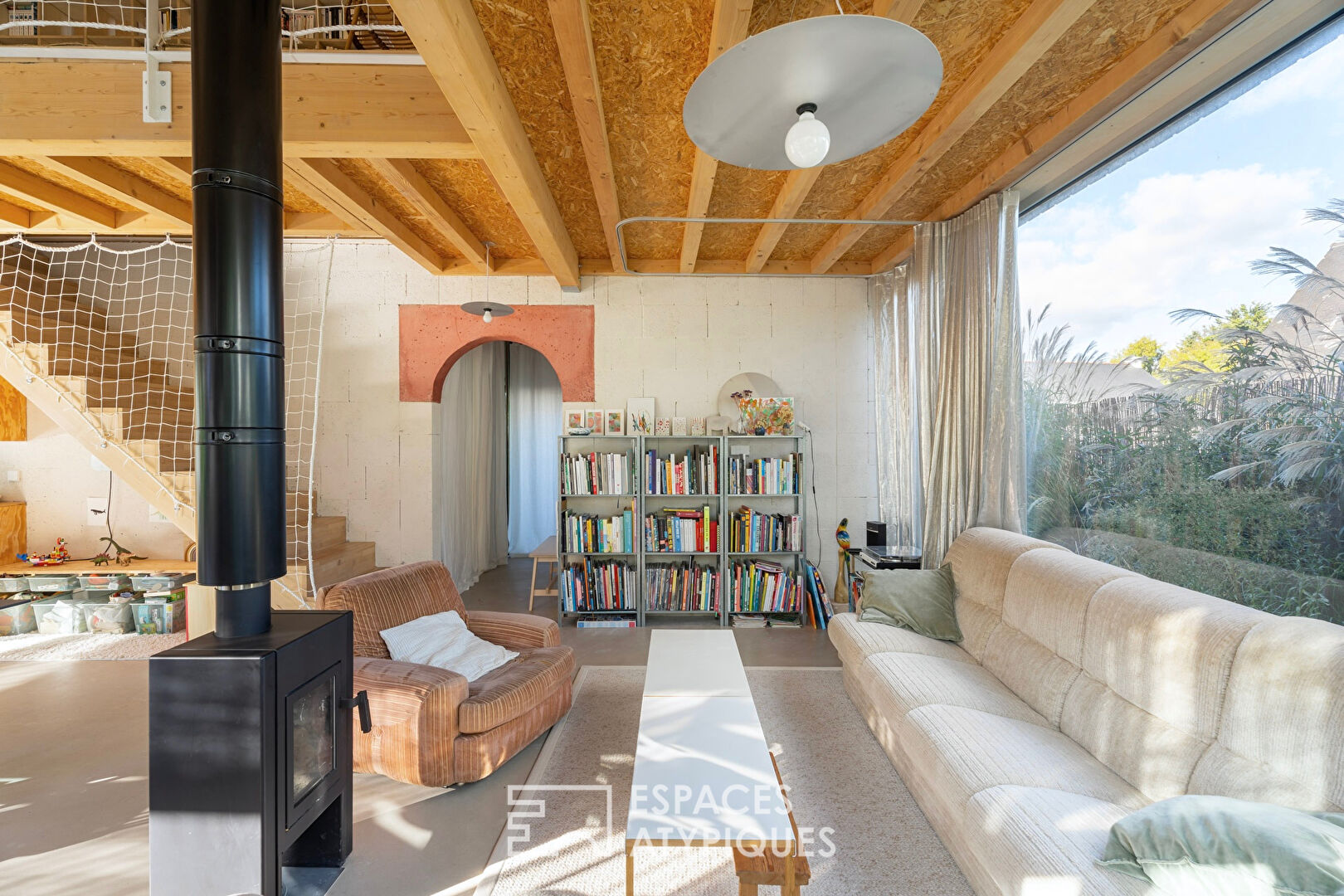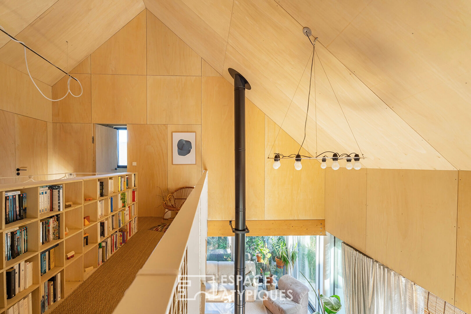 Ce bien unique se compose, au rez-de-chaussée, d’un vaste espace de vie au plafond cathédrale largement vitré, inondant la pièce de lumière. La cuisine ouverte vient parfaitement s’intégrer à ce volume. Un bureau vient compléter ce niveau, offrant un espace supplémentaire et polyvalent pouvant se transformer en salle de loisirs, en coin lecture ou en chambre selon vos besoins.