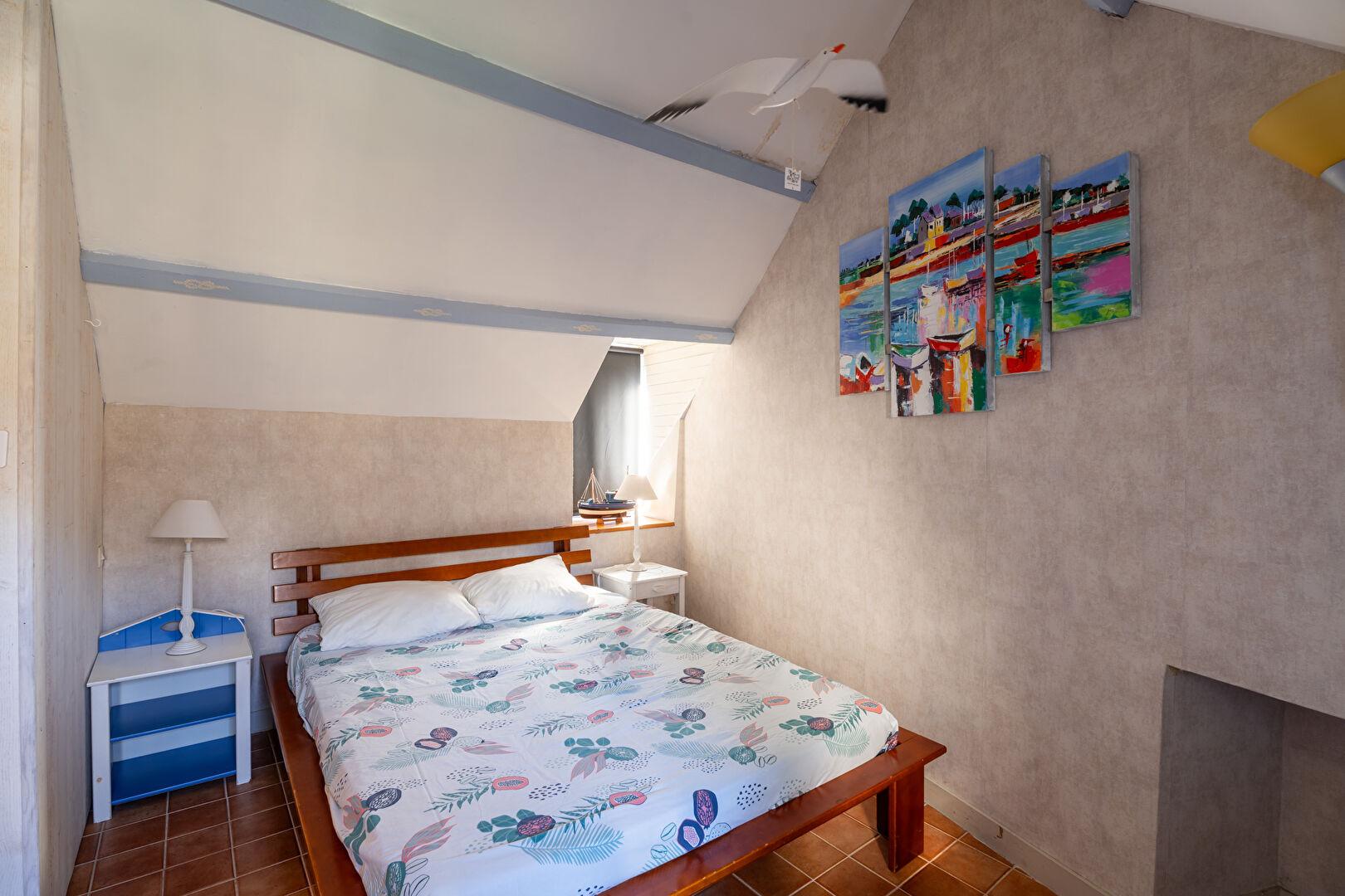 À l’étage, le palier dessert deux chambres, propices au repos et à la quiétude, ainsi qu’une salle d’eau et un WC indépendant, complétant l’espace nuit avec fonctionnalité.
