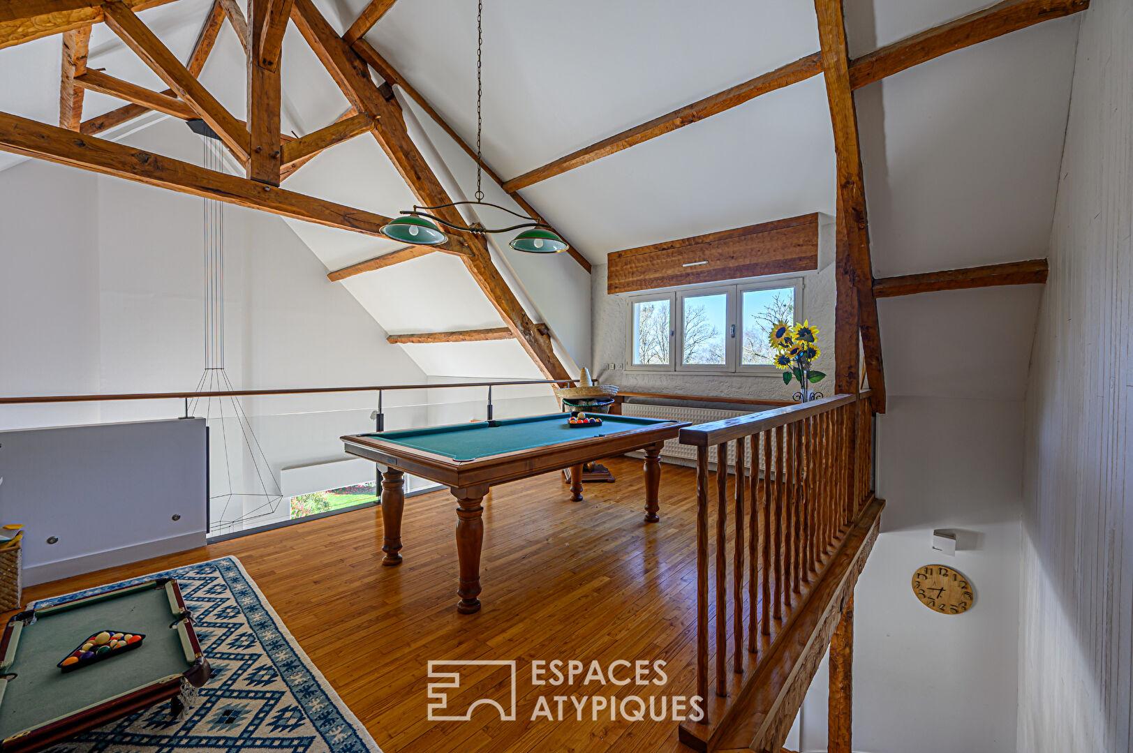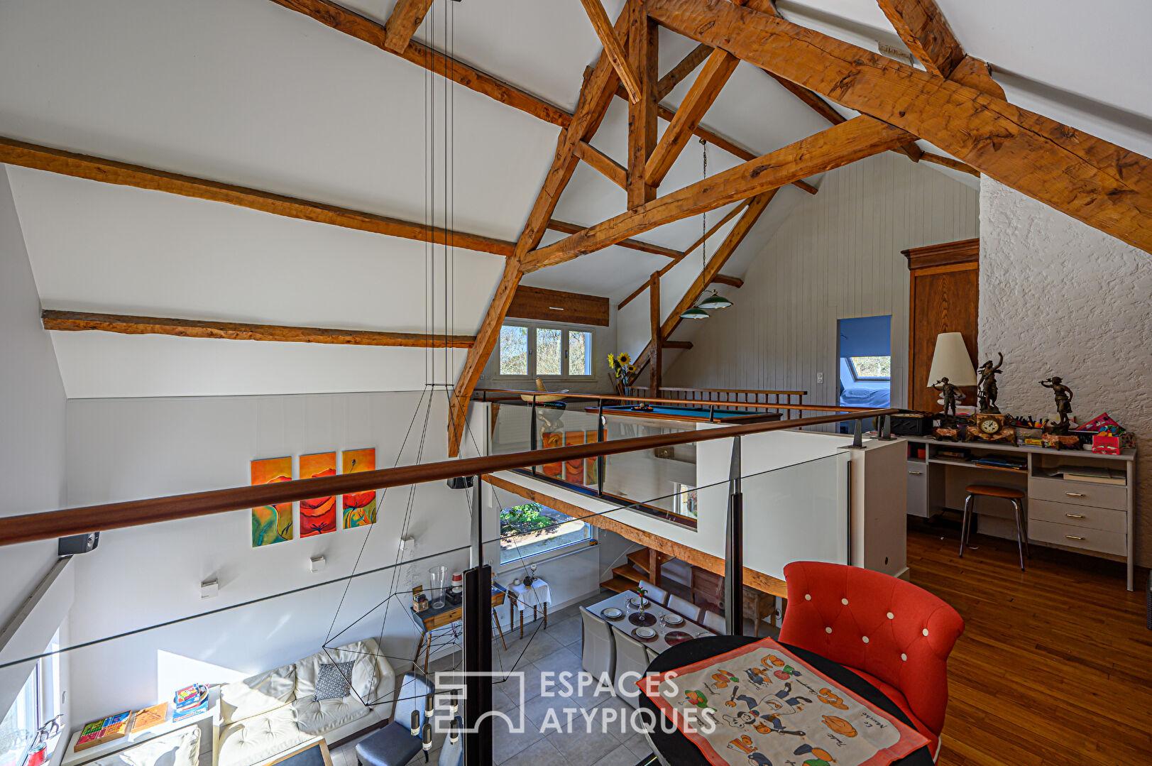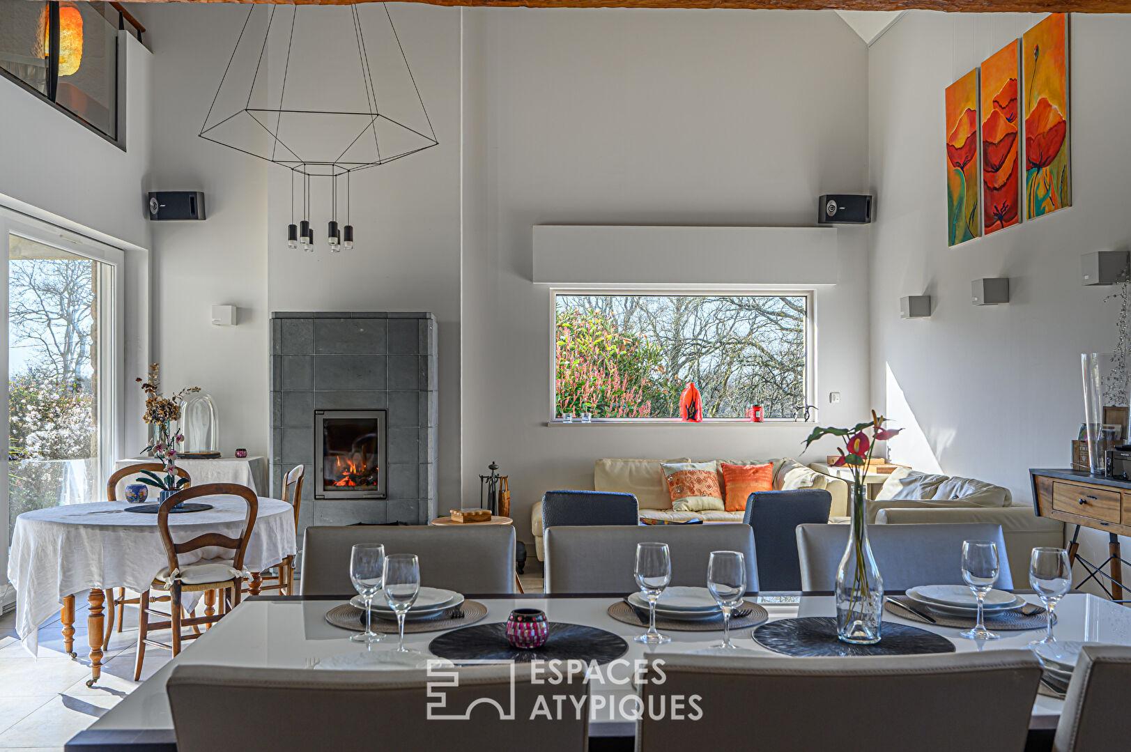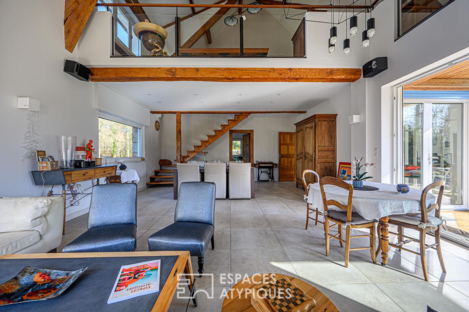 La salle à manger s’intègre harmonieusement dans cet ensemble ouvert, tandis qu’une mezzanine surplombe la pièce de vie et met en valeur la charpente apparente, apportant un esprit loft à l’ensemble.
