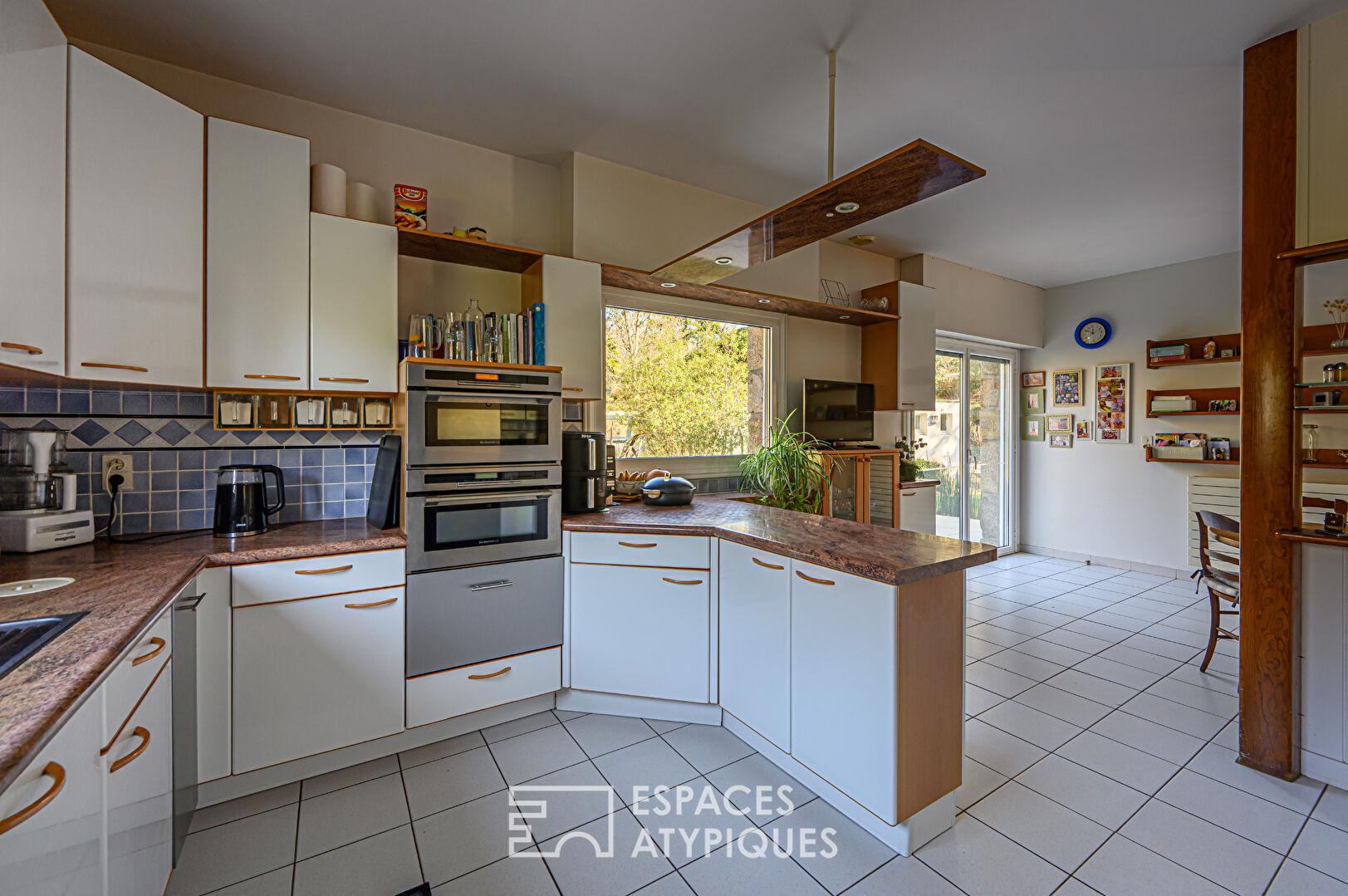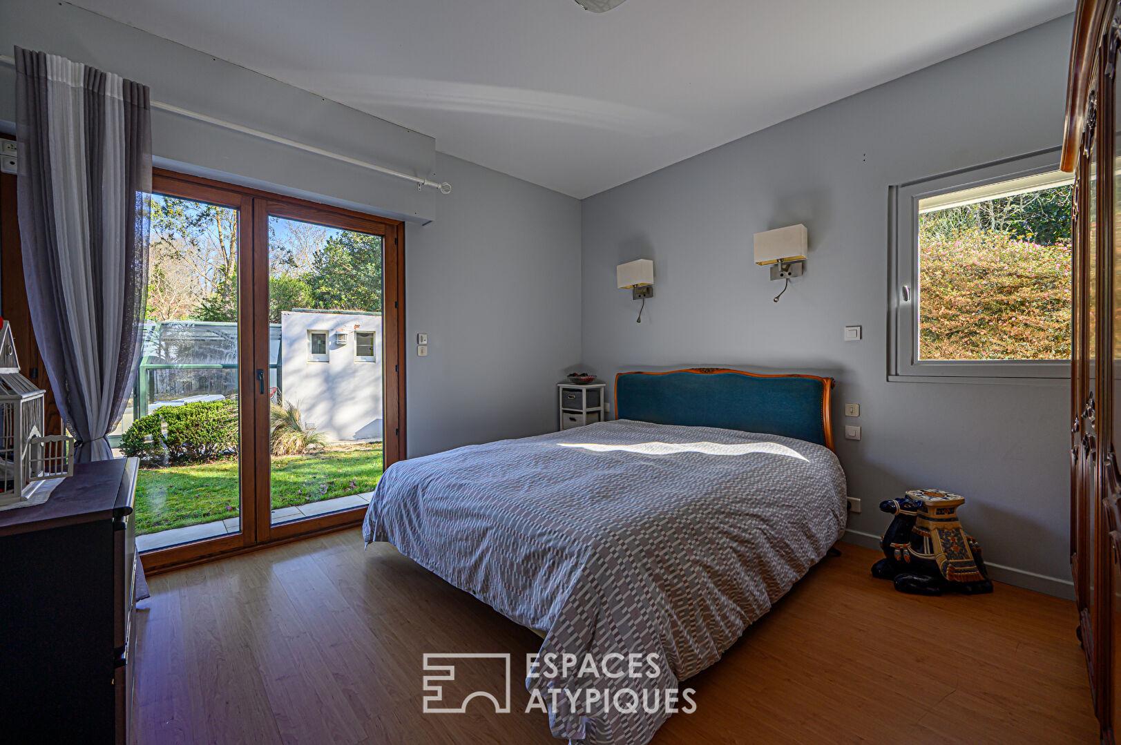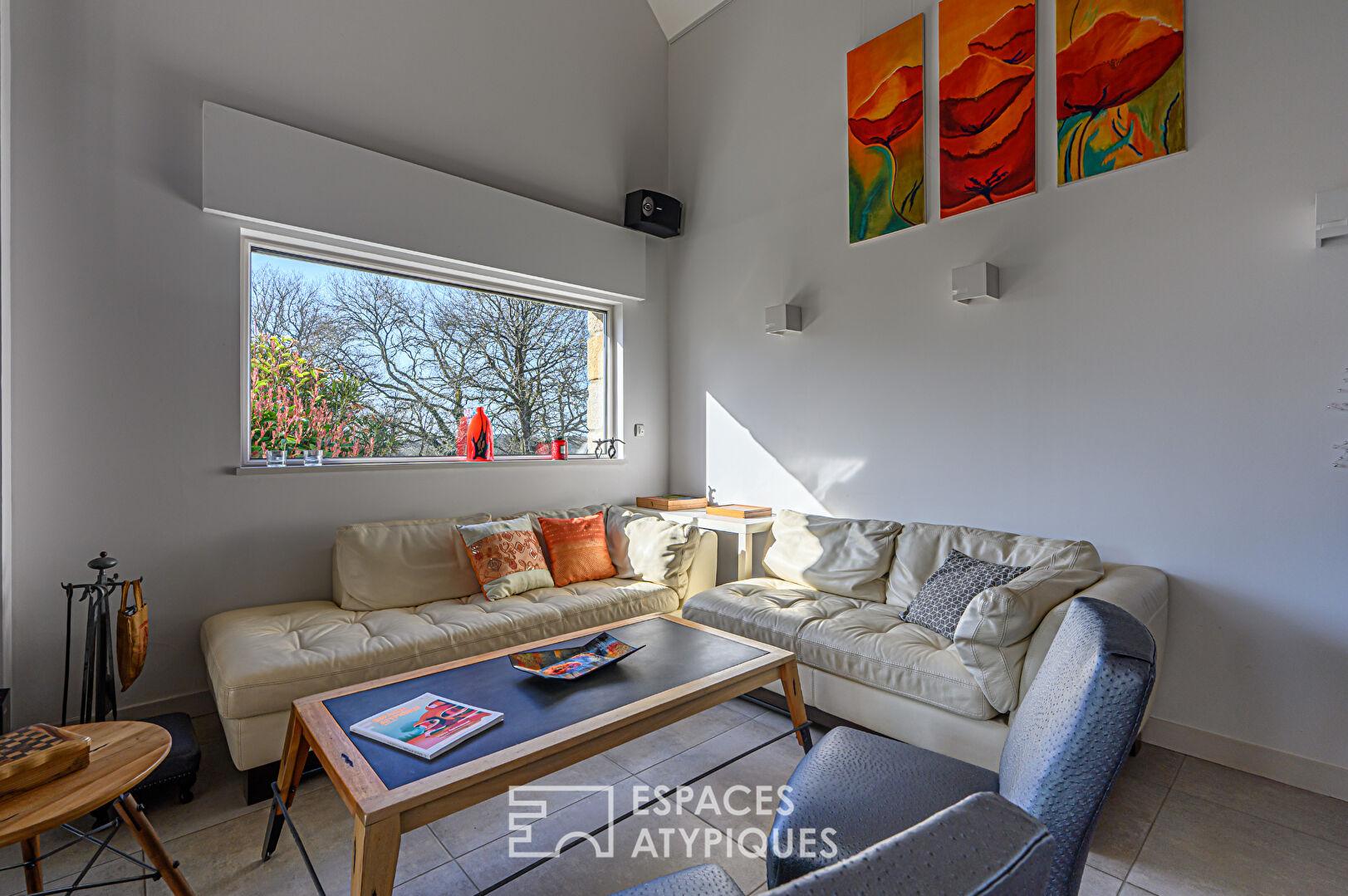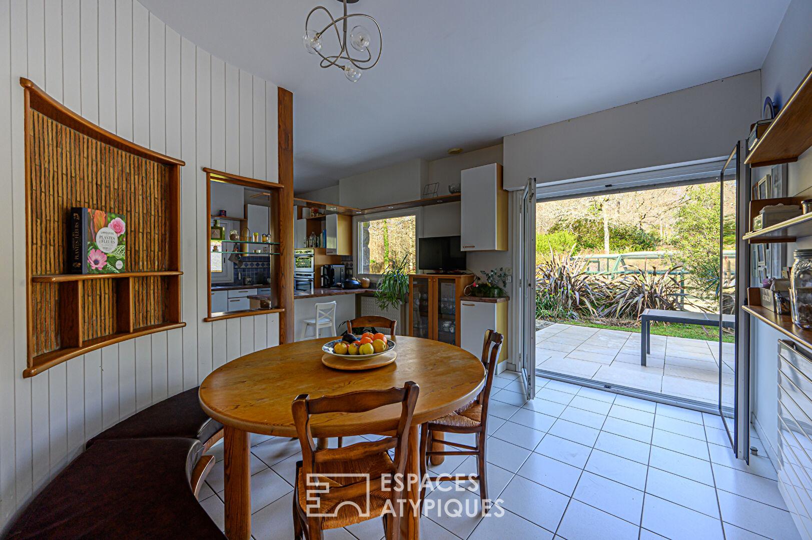 Située dans un hameau de la commune de Guidel, cette maison d’architecte soigneusement rénovée avec vie de plain-pied développe des volumes généreux au coeur d’un environnement naturel préservé.