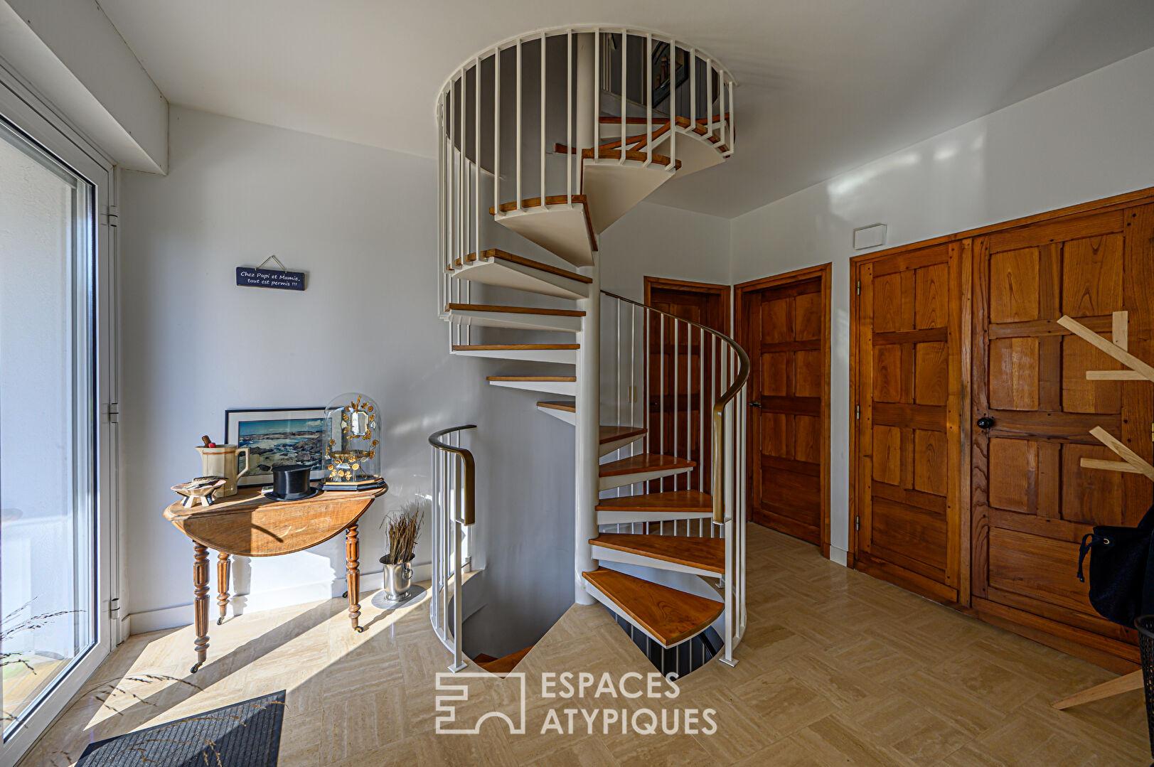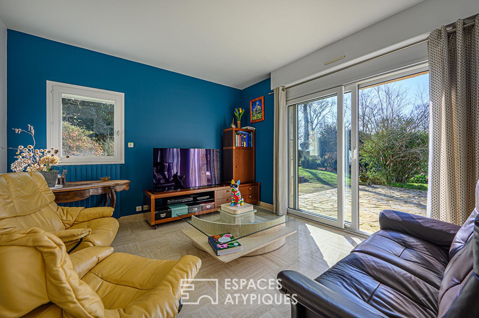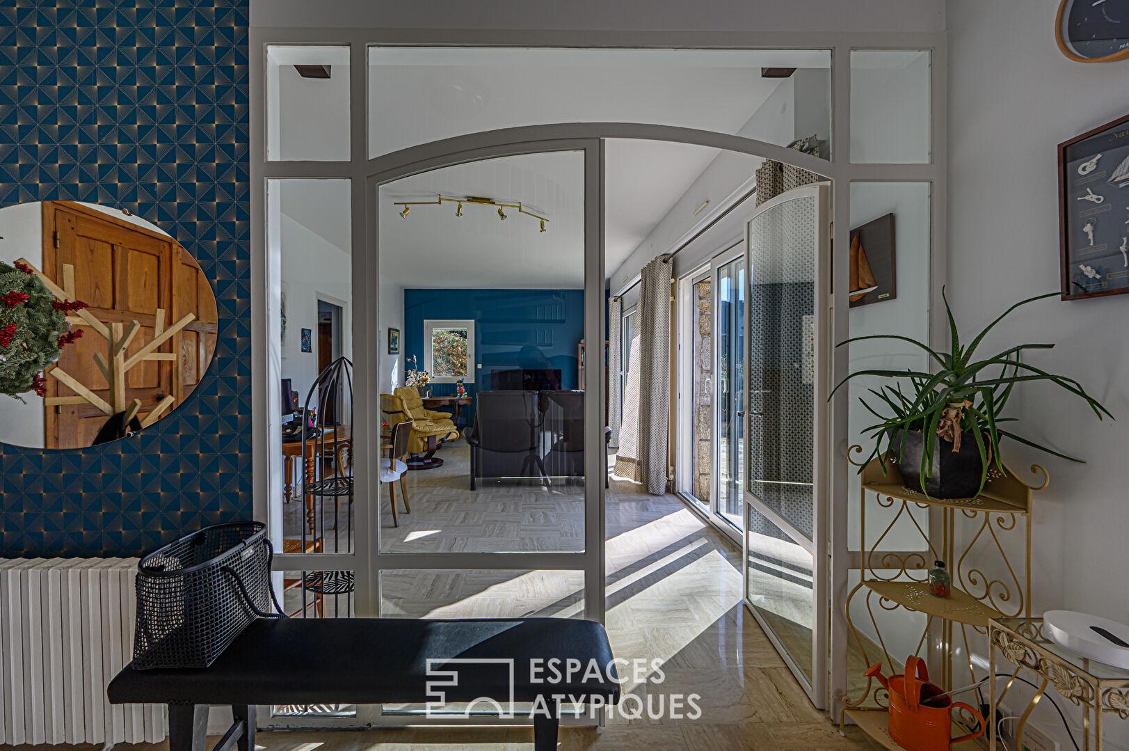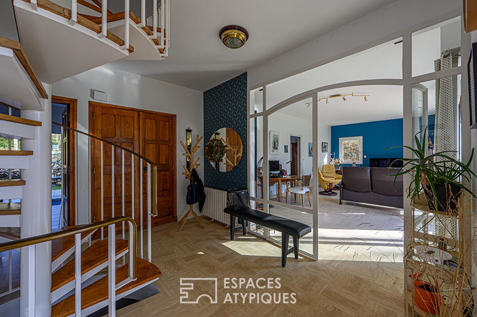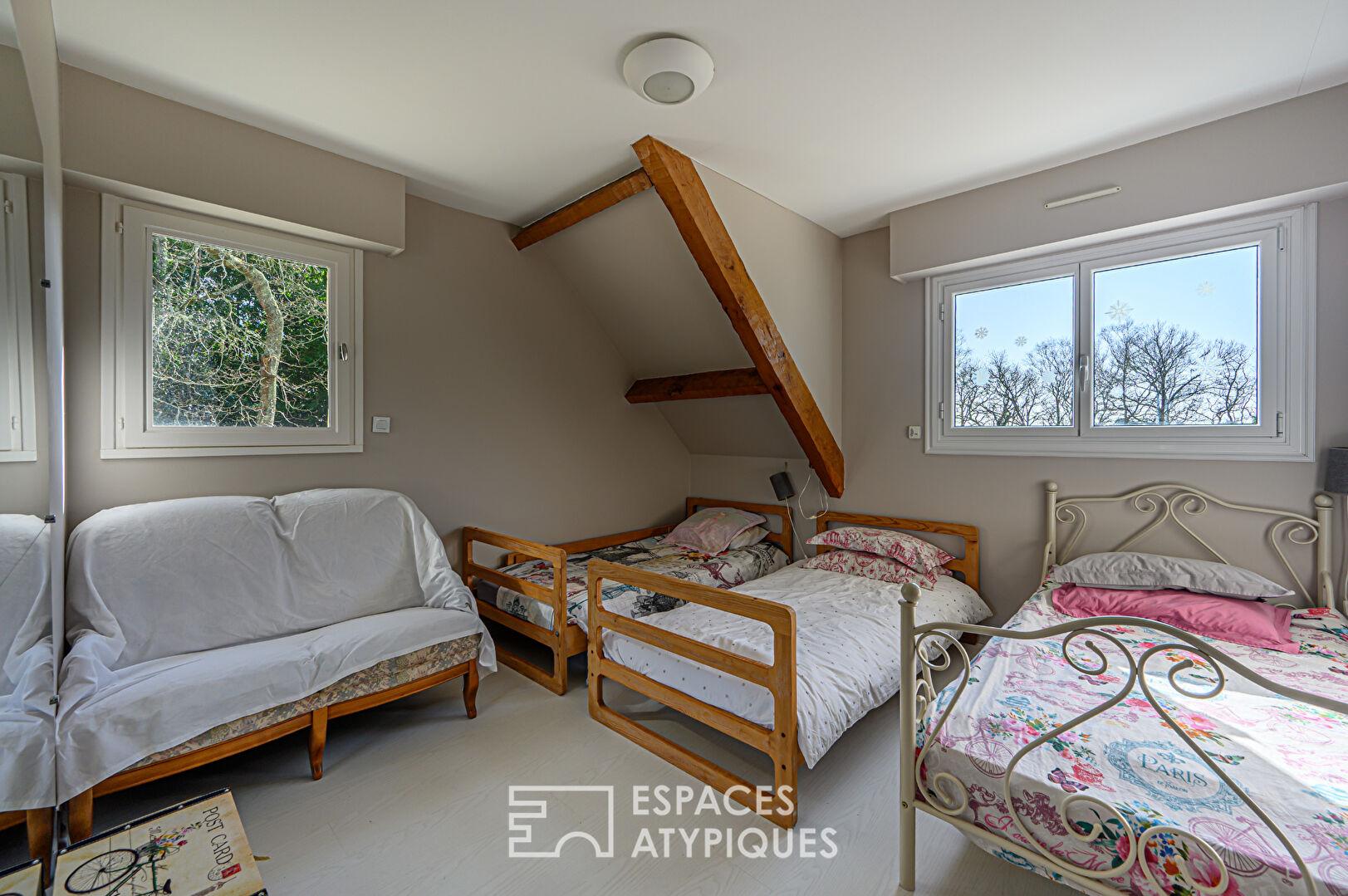 Implantée sur un terrain arboré de près de deux hectares, cette vaste propriété conçue dans les années 70 bénéficie d’un cadre bucolique et paisible, à seulement quelques minutes du bourg et des plages. Repensée au fil des années, elle conjugue aujourd’hui, sur près de 330 mètres carrés au sol dont un vaste sous-sol, confort contemporain, luminosité et architecture de caractère.