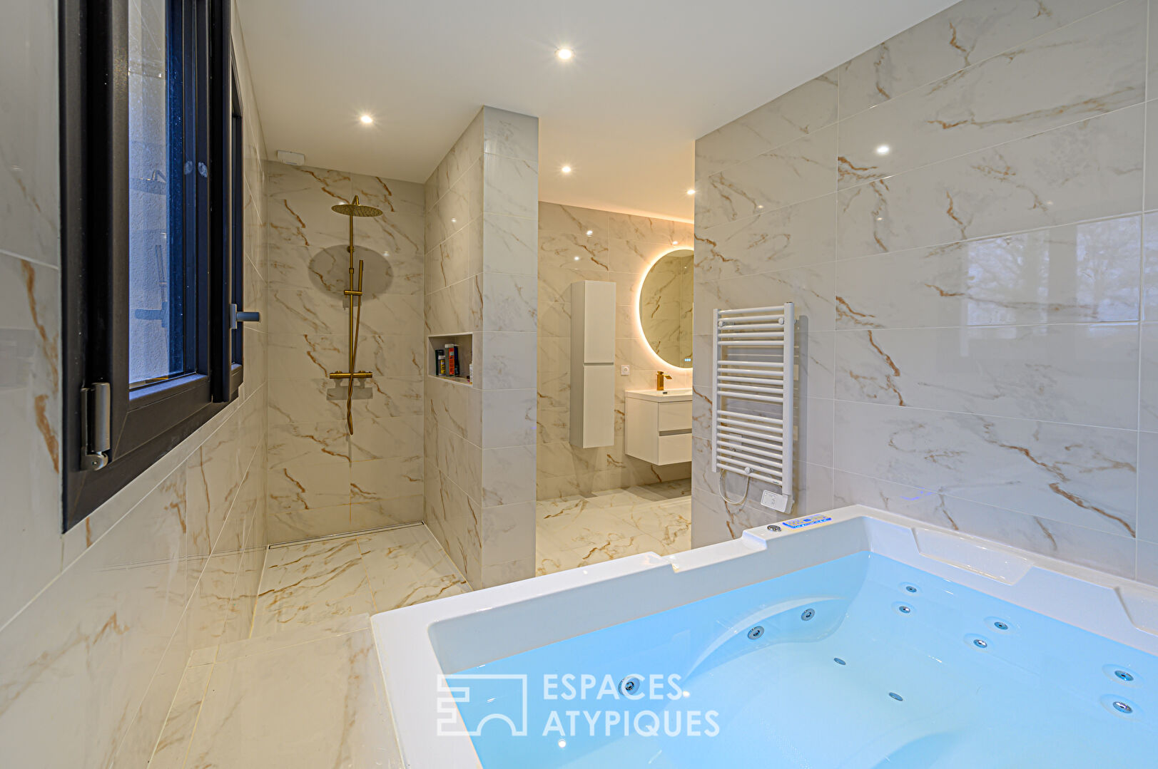 Le chauffage par le sol, exposé sud-ouest, assure une température idéale tout au long de l’année. La grande terrasse, accompagnée d’une piscine, offre un espace extérieur propice à la détente et aux réceptions ensoleillées.