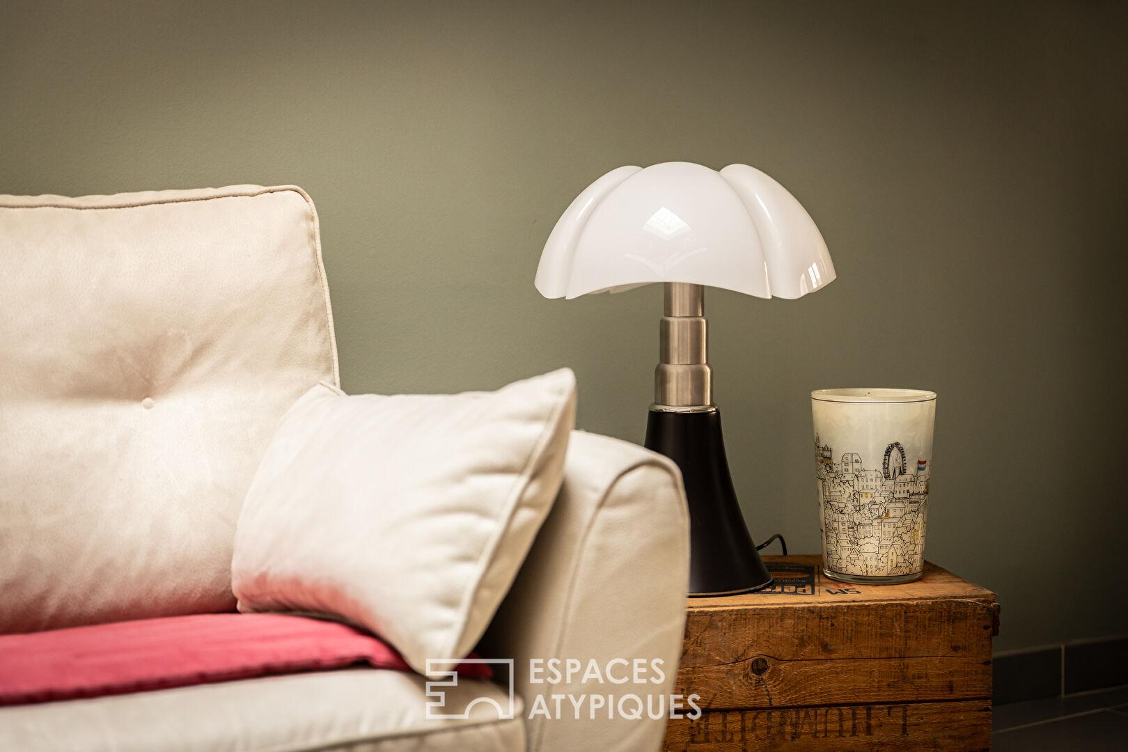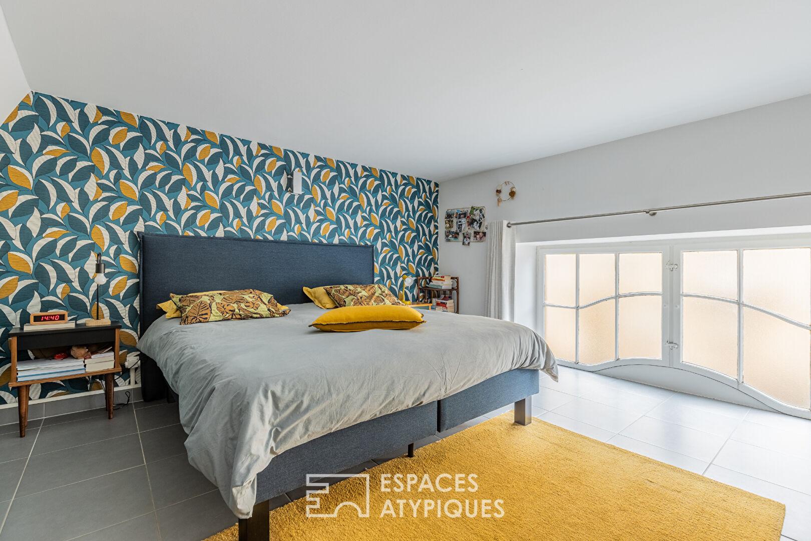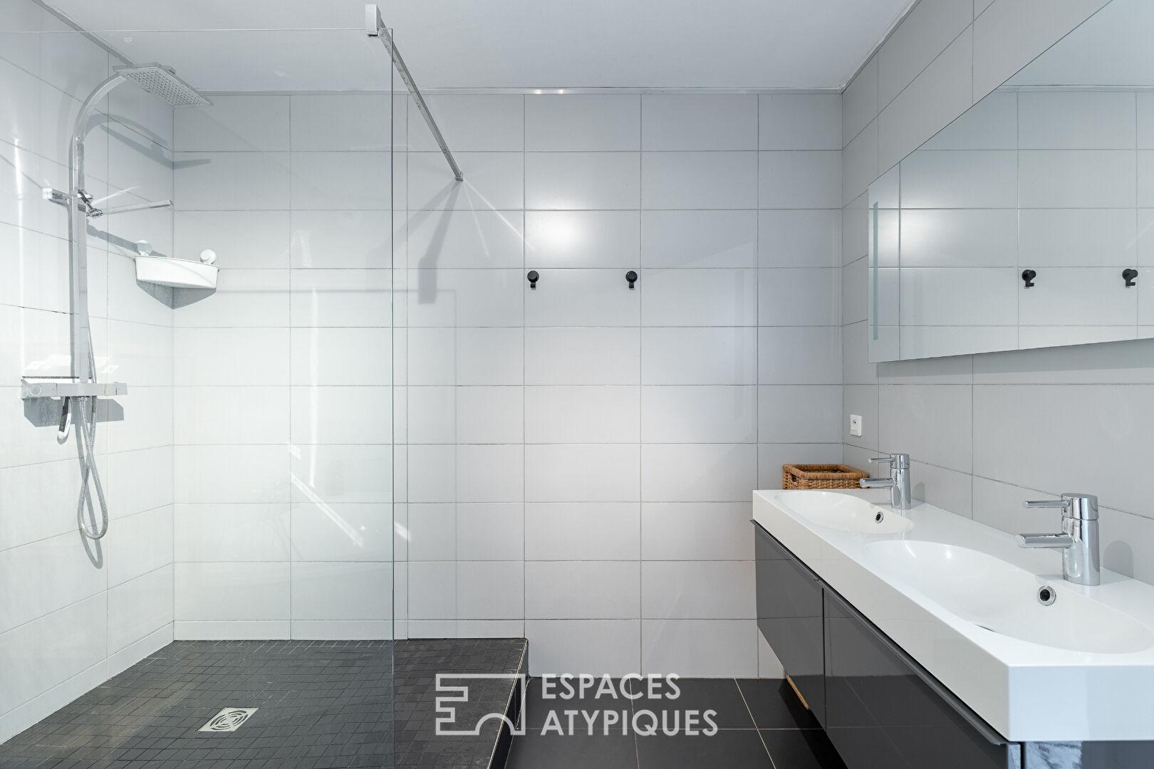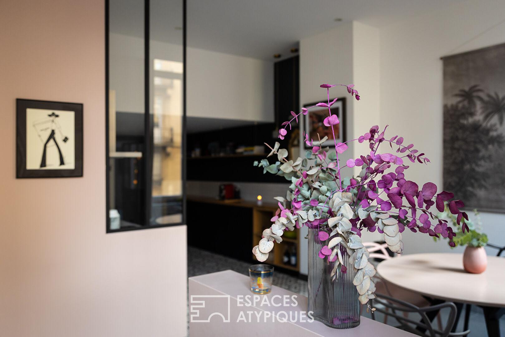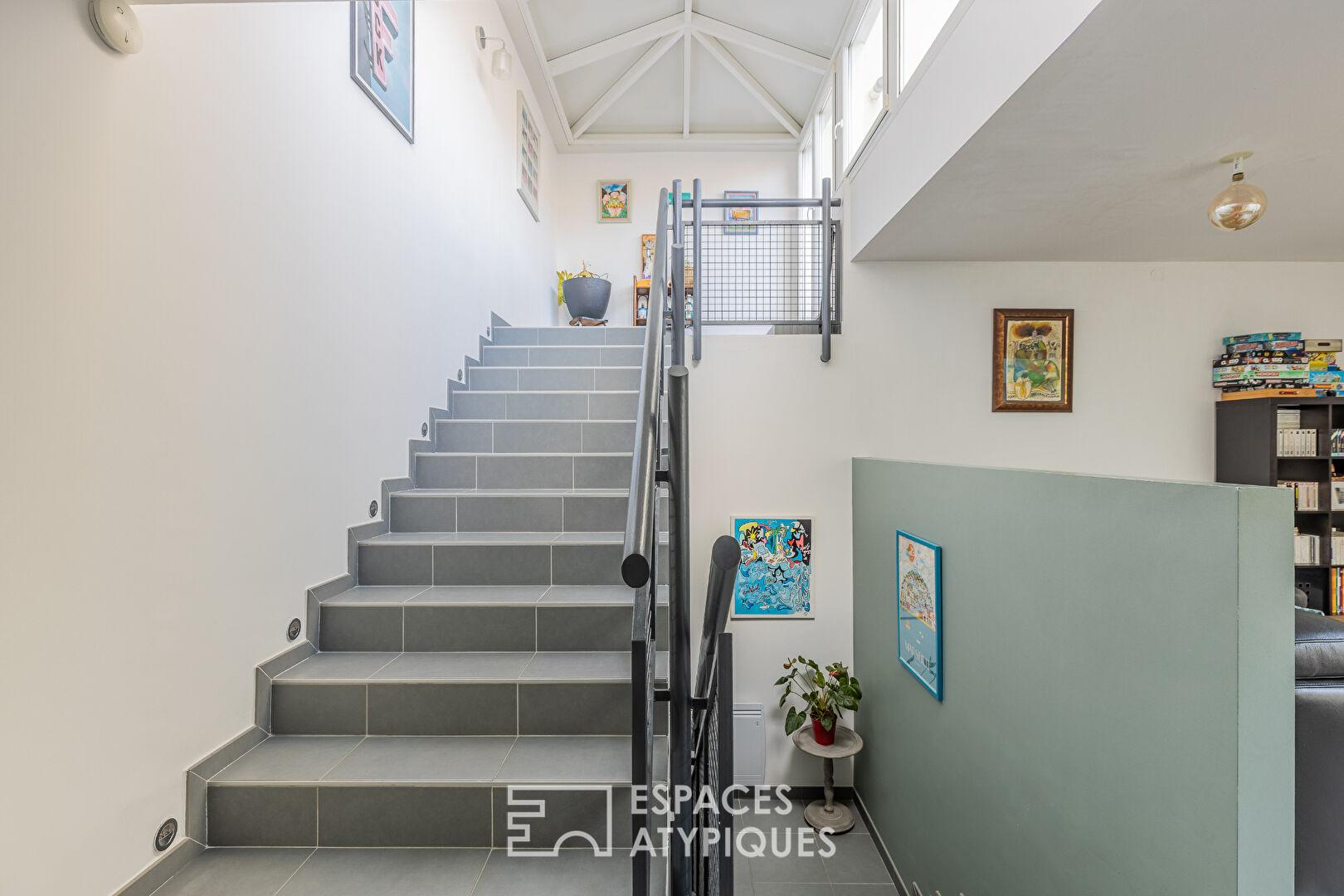 Le rez-de-chaussée surélevé accueille une entrée avec vestiaire s’ouvrant sur une cuisine dînatoire spacieuse. Un dégagement conduit au séjour qui profite d’une lumière zénithale apportée par une verrière. Ce niveau comprend également une chambre, une salle de bain, ainsi qu’un cellier-buanderie. Le premier étage, conçu en mezzanine au-dessus du séjour, abrite un second salon. La partie nuit se prolonge avec une salle de bain et trois chambres, dont une dotée d’un dressing. Le dernier niveau permet d’accéder à une terrasse nichée sur le toit de l’appartement. Véritable patio suspendu au coeur de l’îlot, cet extérieur offre un espace de respiration à l’abri de l’agitation urbaine.