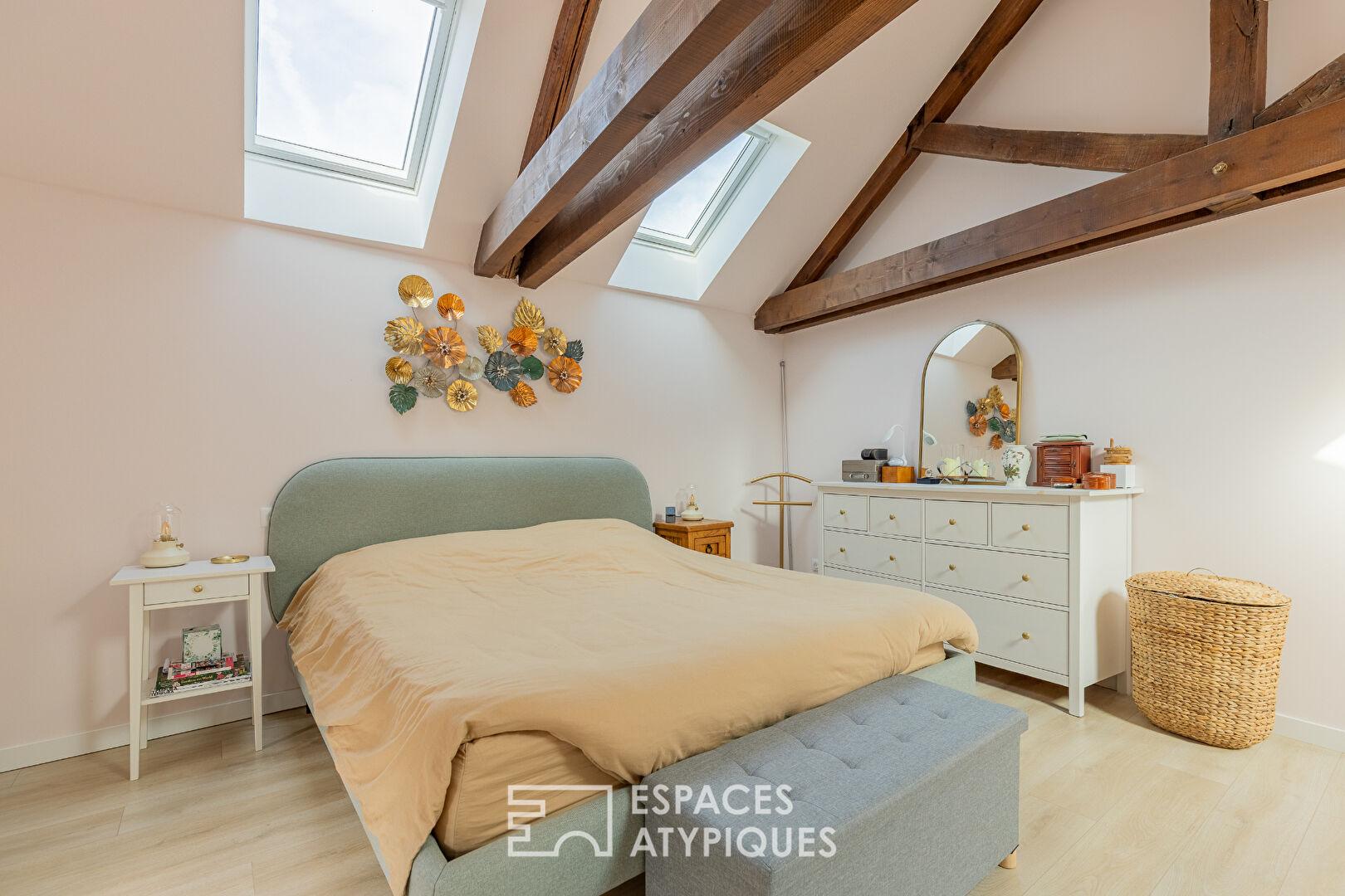 Dès l’entrée, le premier niveau dévoile une vaste pièce de vie dédiée à la convivialité. La salle à manger, chaleureuse et habitée par une cheminée fonctionnelle, s’ouvre sur une cuisine dînatoire aux lignes épurées et aux matériaux premium. Depuis cet espace, le regard s’échappe vers les reflets de la Moselle qui bordent l’immeuble. Ce niveau est complété par une salle de bain aux finitions soignées. Quelques marches mènent ensuite à un demi-niveau qui constitue le coeur intime du bien : un patio privatif à ciel ouvert. Dans la continuité, deux salons en enfilade offrent une atmosphère feutrée et une flexibilité d’usage rare, que ce soit pour un bureau ou un espace de lecture au calme absolu. Un escalier en pierre d’origine conduit au dernier étage dédié au repos. Sous une charpente apparente, trois chambres spacieuses se partagent ce volume sous combles, dont une suite parentale avec salle d’eau privative, complétée par une troisième salle d’eau.