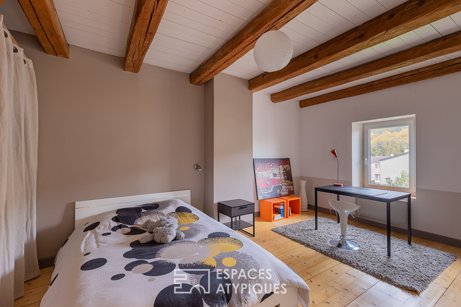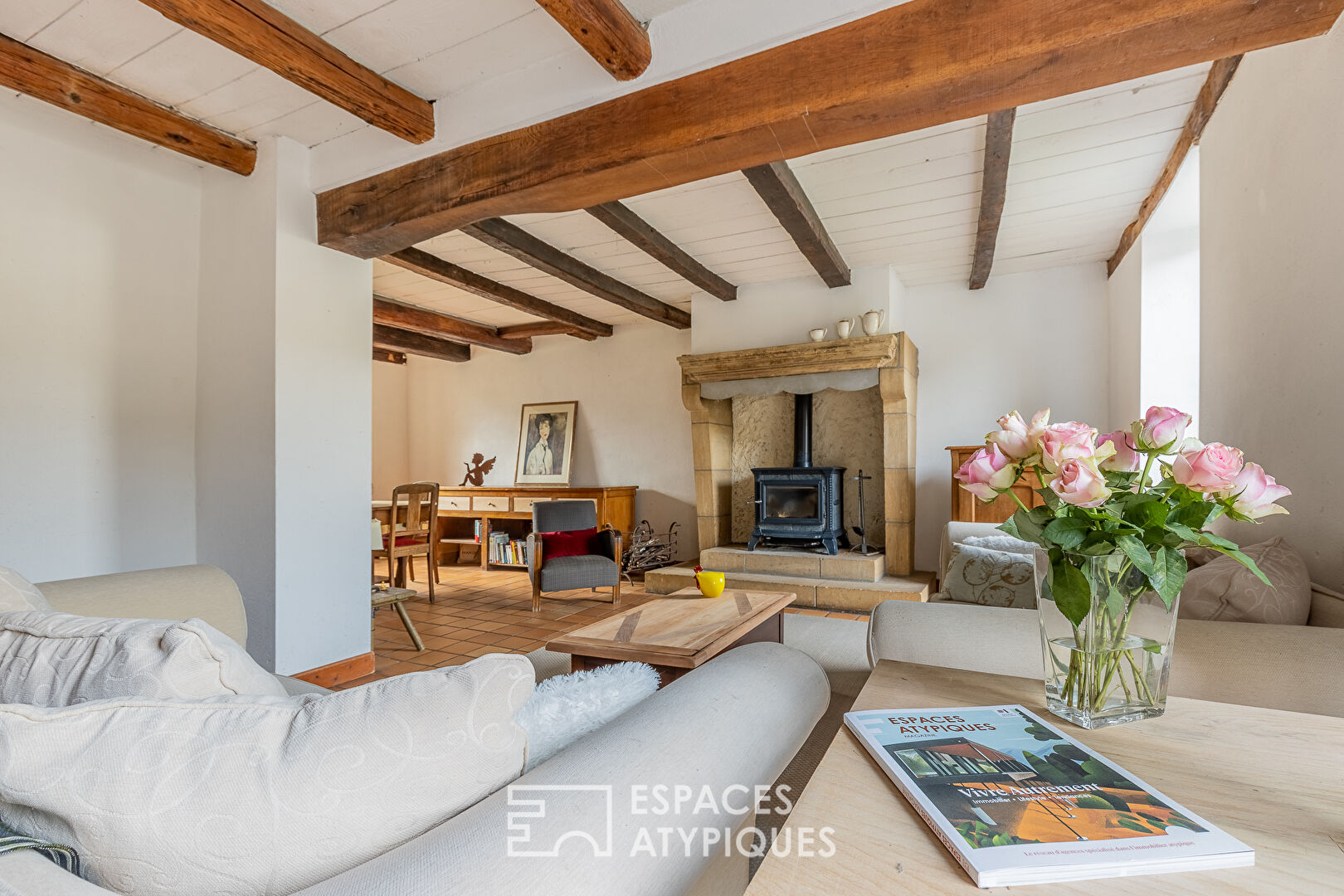 Accessible par une cour en pavés anciens, l’entrée, protégée par une marquise, ouvre sur un dégagement et dévoile le chaleureux et lumineux salon-séjour avec ses poutres apparentes et sa majestueuse cheminée d’époque agrémentée d’un poêle à bois. Dans la continuité, se trouve la cuisine, indépendante et authentique, donnant accès à une grande terrasse et au jardin.