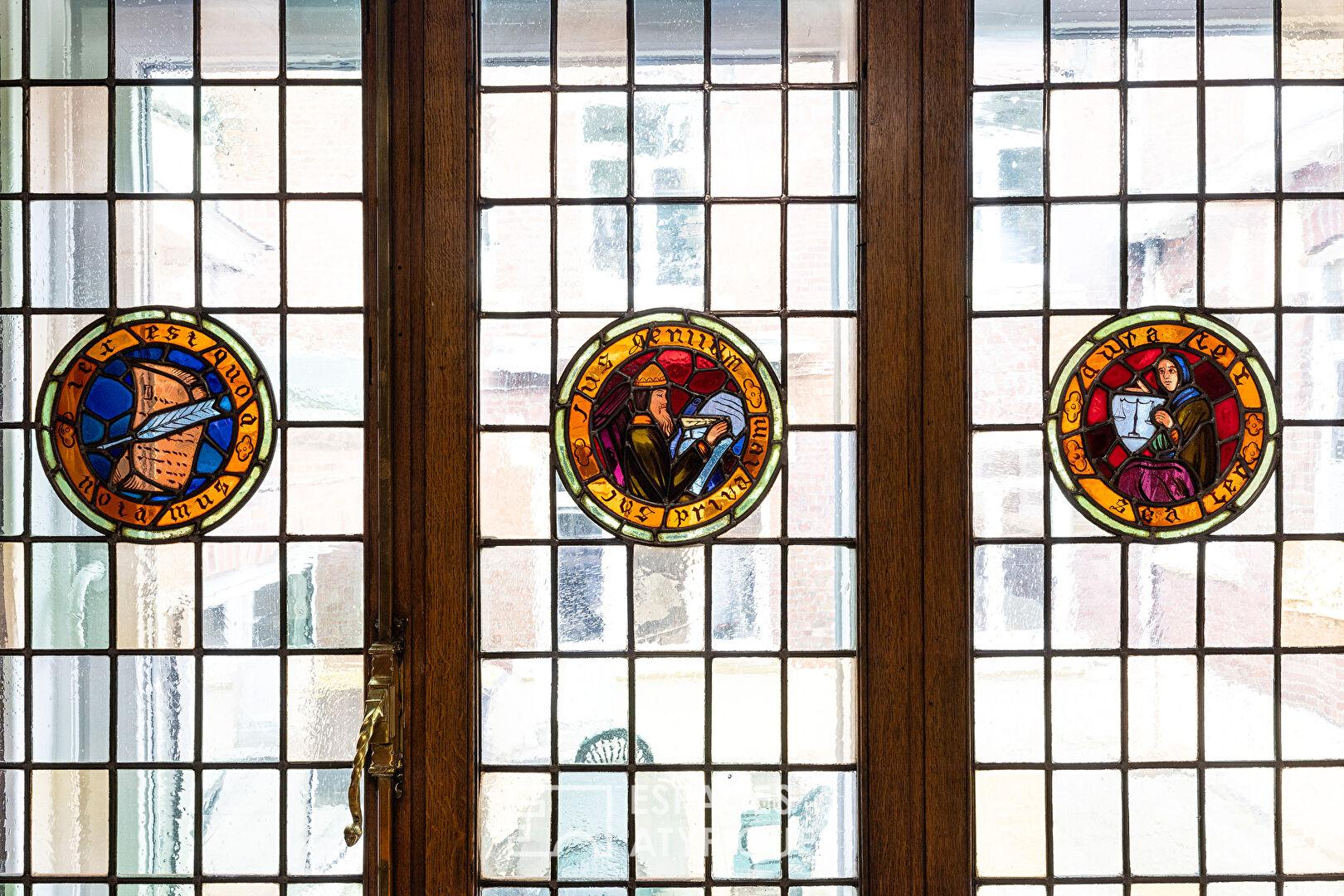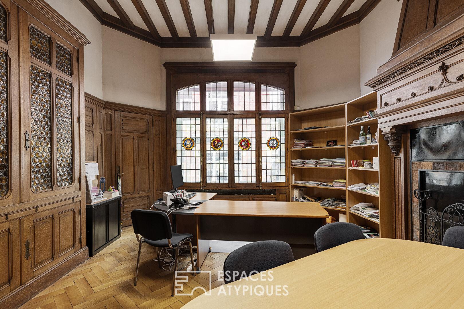 Dès l’entrée, les volumes généreux s’imposent avec une belle hauteur sous plafond et une distribution fluide des espaces. L’ensemble développe 13 pièces dont 10 espaces de bureaux, pensés pour conjuguer espaces de réception et zones de travail plus confidentielles. Le cachet de l’ancien s’exprime partout, à travers un escalier en fer forgé, un parquet en chevron, des cheminées majestueuses habillées de bois ainsi que des vitraux intérieurs, apportant une signature élégante à ce lieu. Un espace d’eau avec sanitaires multiples et douche complète l’organisation fonctionnelle.