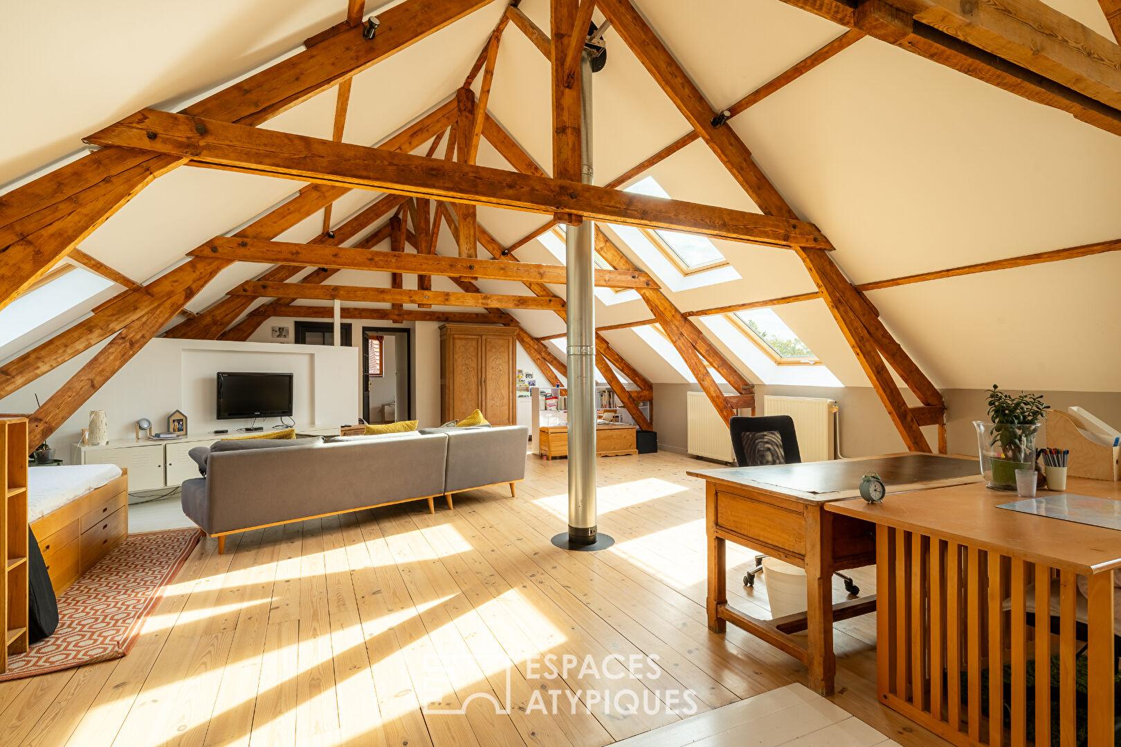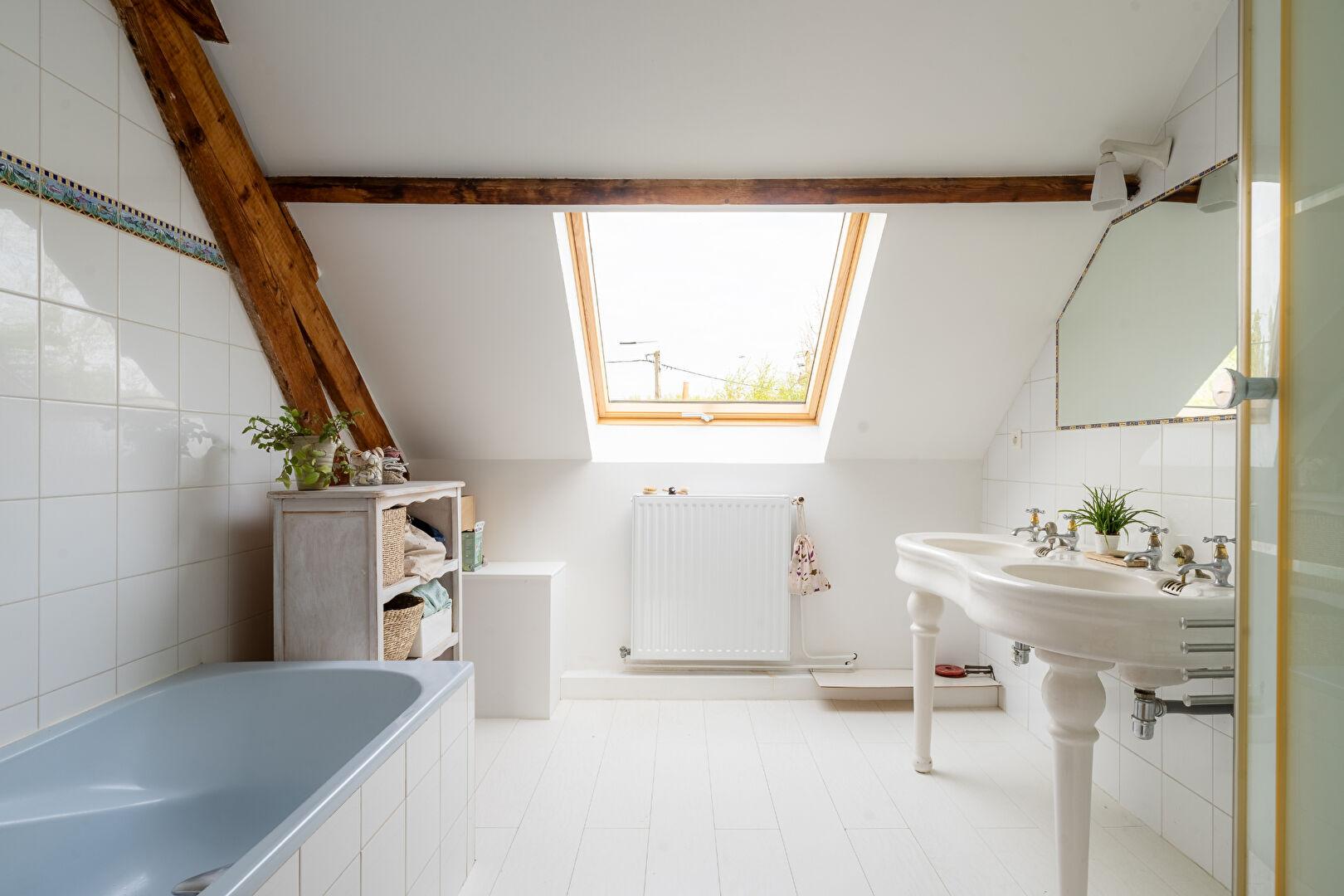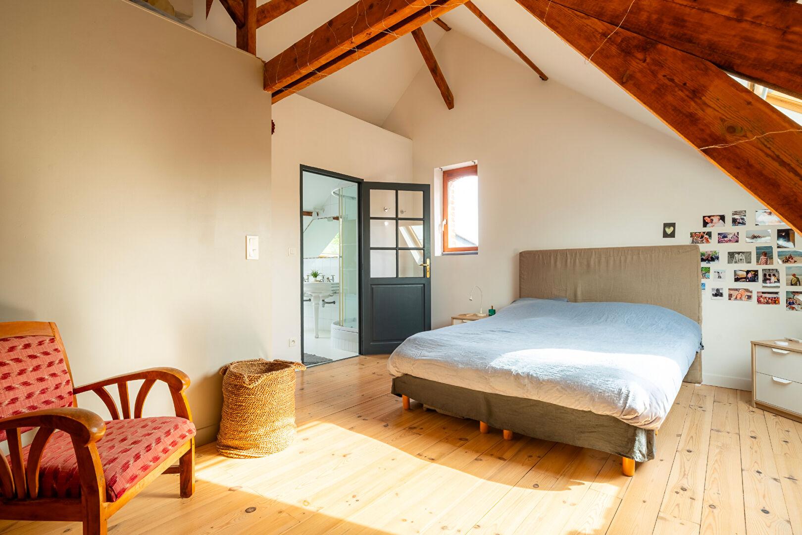 L’ascension vers l’étage offre de magnifiques perspectives et révèle un plateau spectaculaire de plus de 100 m² où la charpente apparente et les larges Velux créent un cocon de lumière. Cet étage accueille une suite parentale d’exception, véritable refuge intime disposant de son propre dressing et d’une salle de bains complète avec douche et baignoire.