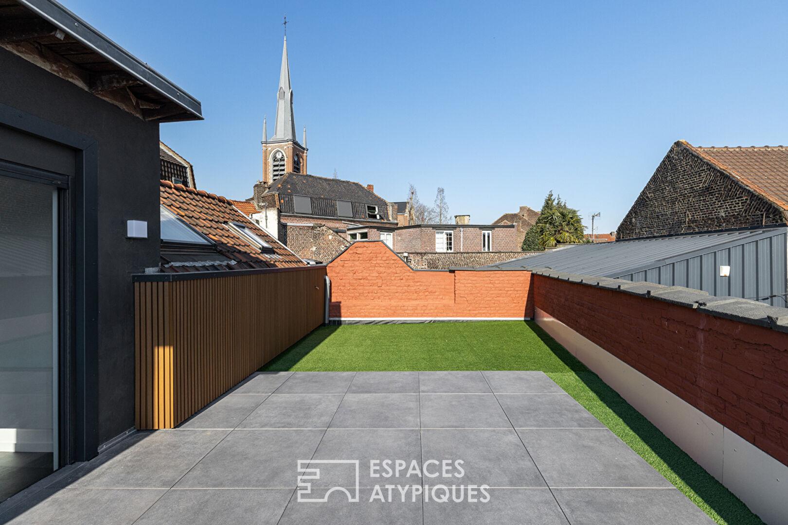 Depuis cet espace privilégié, la vue se déploie avec élégance sur le clocher de l’église du centre-ville de Croix, apportant un charme rare à l’ensemble.
