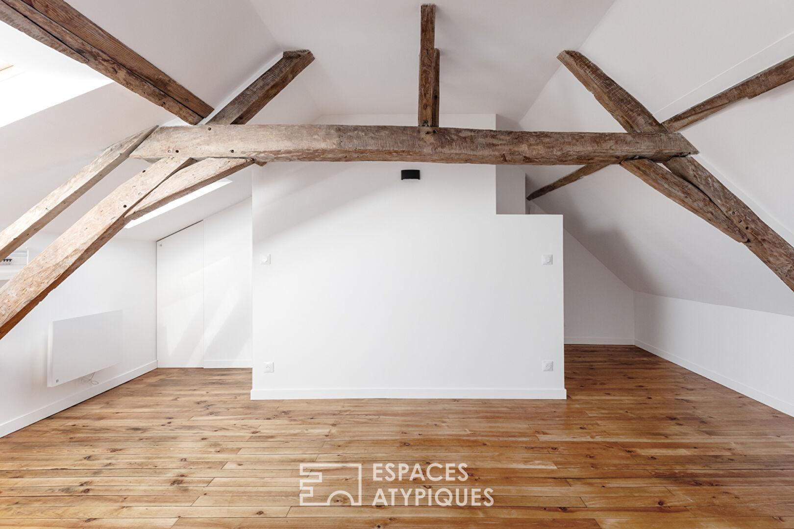 À l’étage, derrière une porte discrètement dissimulée, se dévoile un espace plus intime : une suite parentale nichée sous les poutres, véritable cocon où la charpente apparente souligne le caractère singulier de l’appartement.