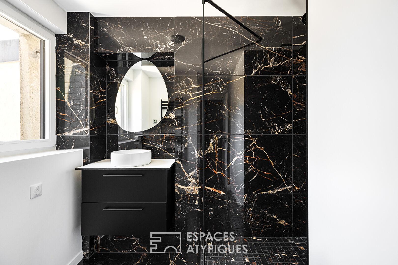 Dans le prolongement, une seconde pièce accueille la cuisine et le salon, pensés dans une continuité fluide et conviviale. L’ensemble de l’appartement a été entièrement repensé et rénové par un architecte, mêlant lignes contemporaines, matériaux choisis et respect de l’esprit originel du lieu.