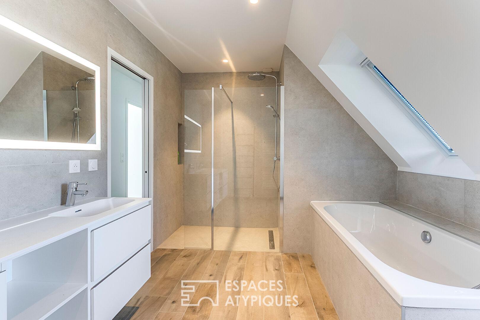 À l’étage, les volumes se prolongent avec cohérence. Un large palier, aménagé en bureau distribue les différentes chambres. La suite principale s’impose comme un cocon complet avec dressing et salle de douche privative. Deux autres chambres généreuses partagent une salle de bain élégante ainsi que des toilettes indépendantes.