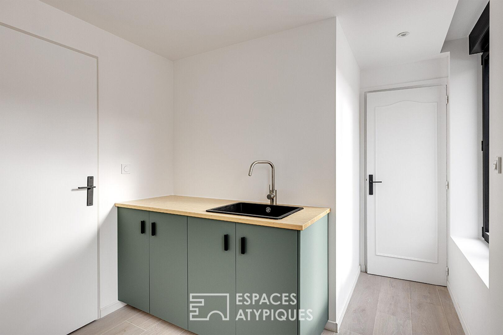 Érigée sur une parcelle de 650 m², elle a bénéficié d’une rénovation intégrale privilégiant le minimalisme et la lumière.