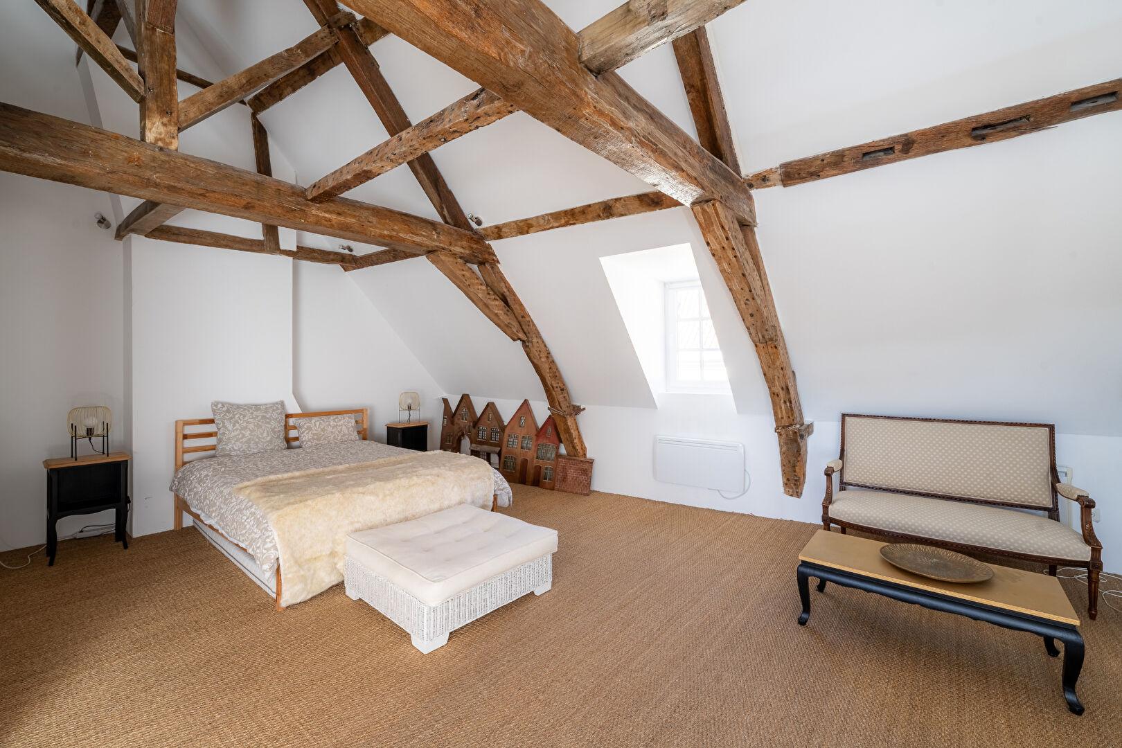 L’espace nuit se compose de trois chambres spacieuses, dont une suite sous combles magnifiée par une charpente apparente monumentale, révélant un potentiel d’aménagement remarquable pour les amateurs de lieux chargés d’histoire. La lumière circule librement grâce aux larges ouvertures et aux parquets blonds qui réchauffent l’ensemble architectural.