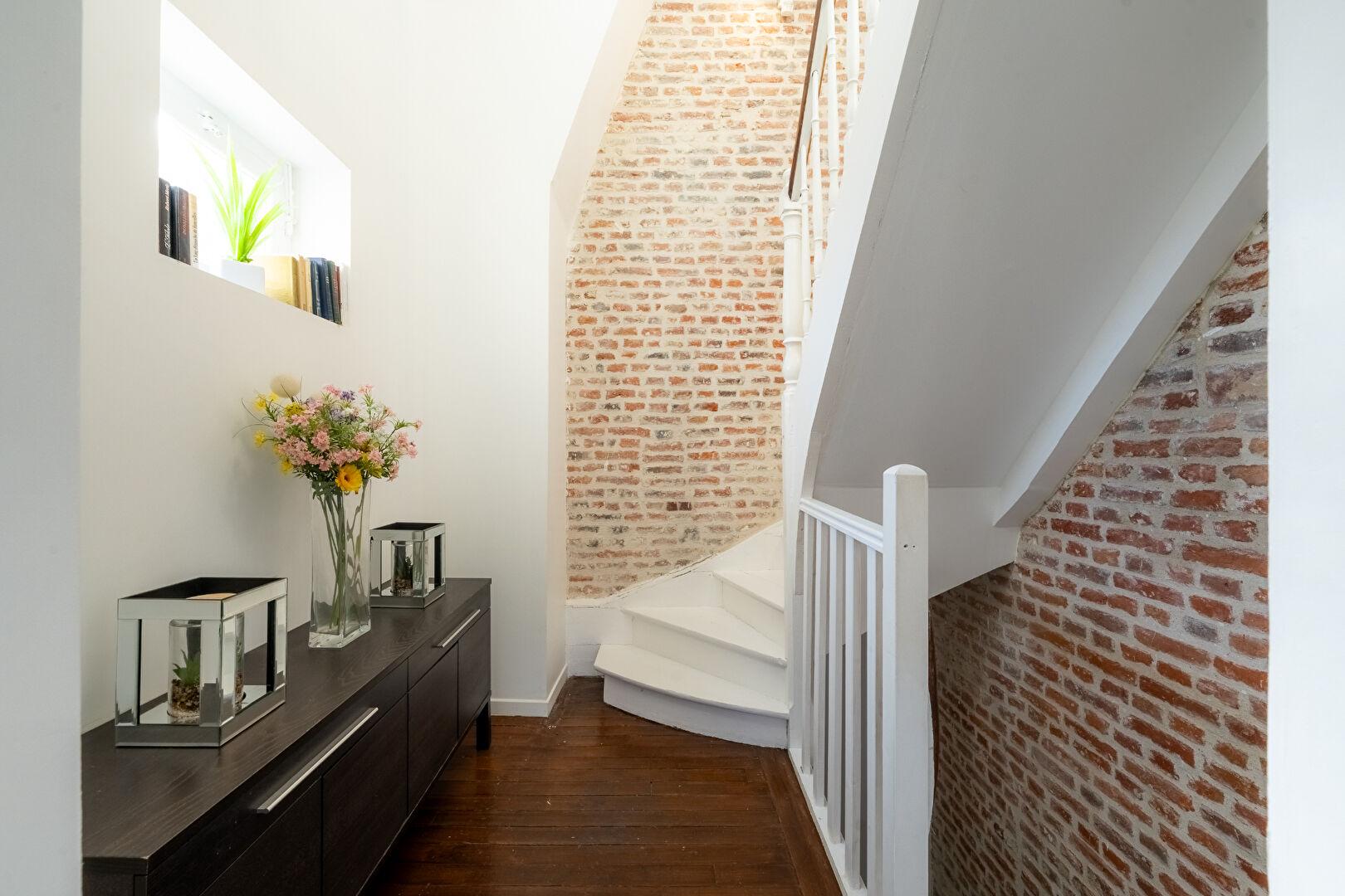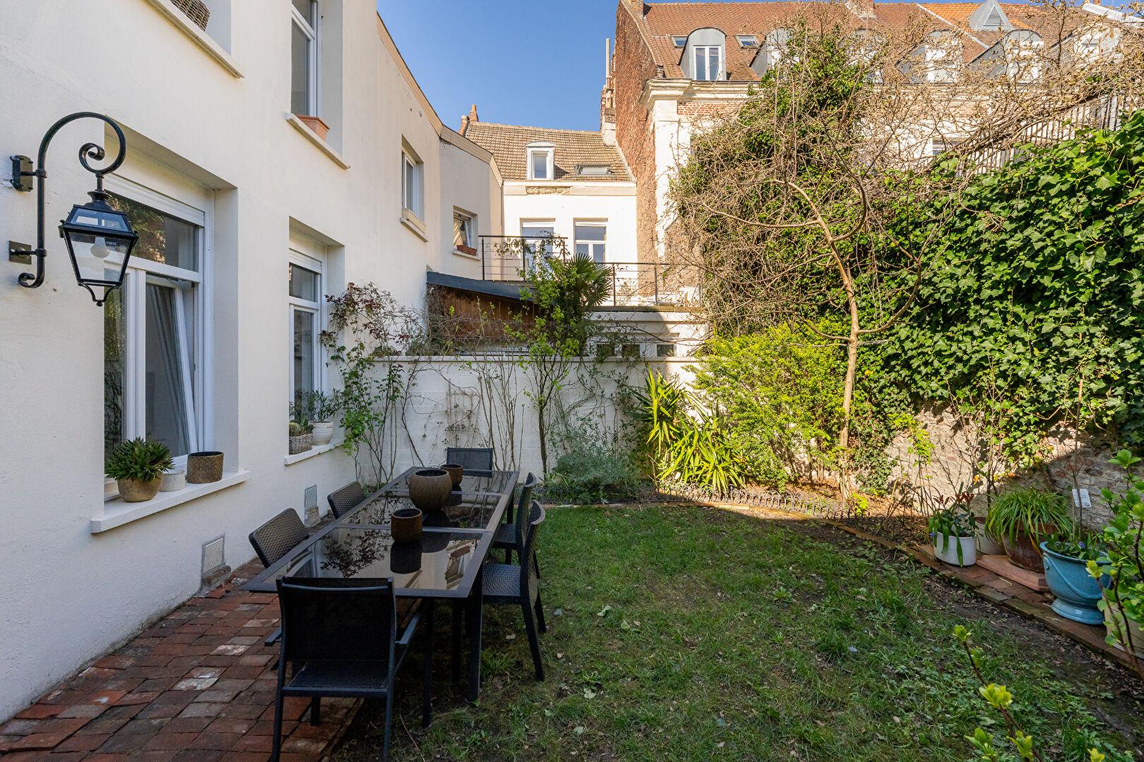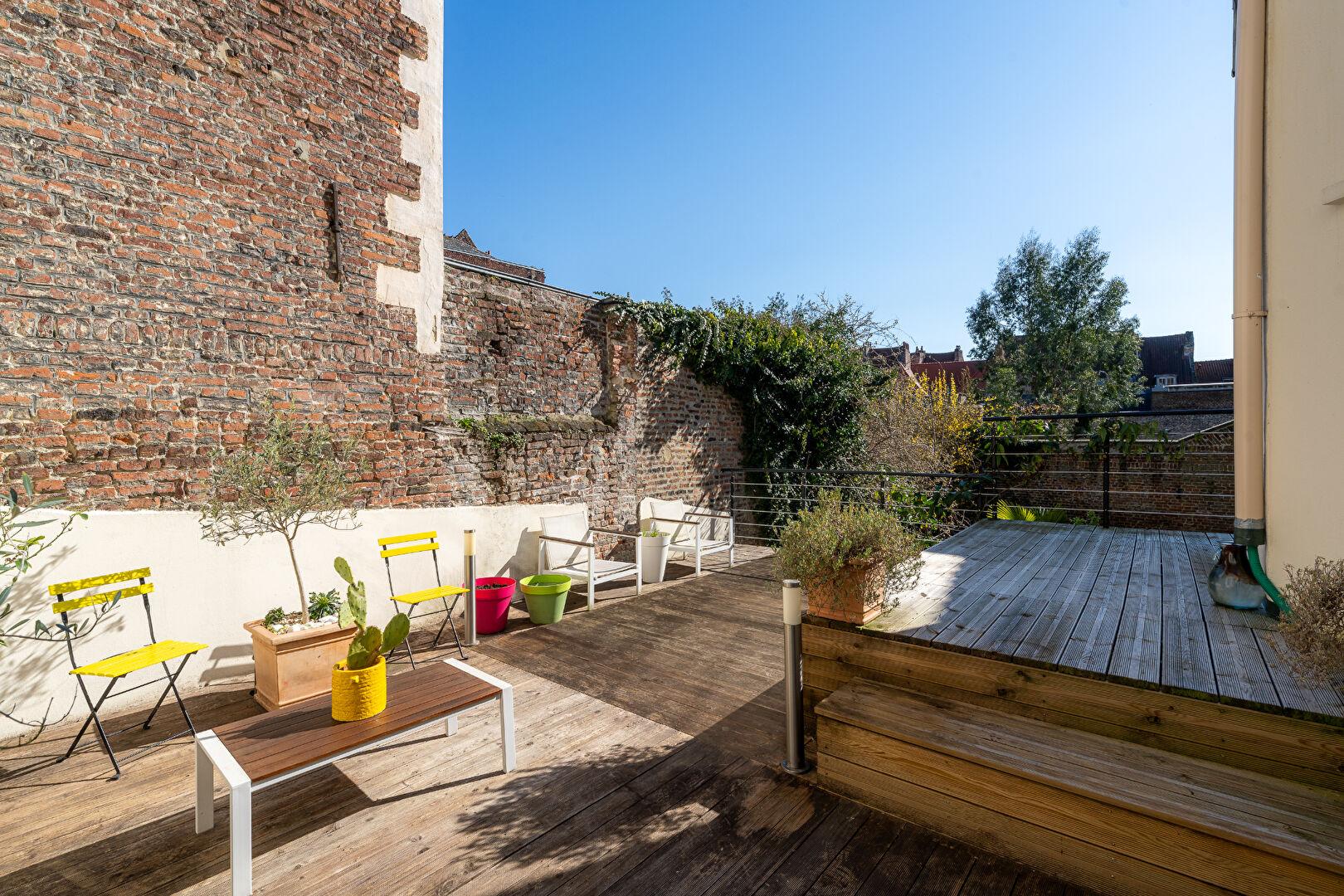 À l’extérieur, une terrasse en bois de belle dimension prolonge les espaces de vie, offrant un véritable jardin suspendu entouré de murs de briques authentiques. Ce havre de paix, complété par un jardin idéalement exposé rare en centre-ville, se situe à proximité immédiate des commerces, des écoles réputées et de la gare, facilitant un quotidien dynamique.
