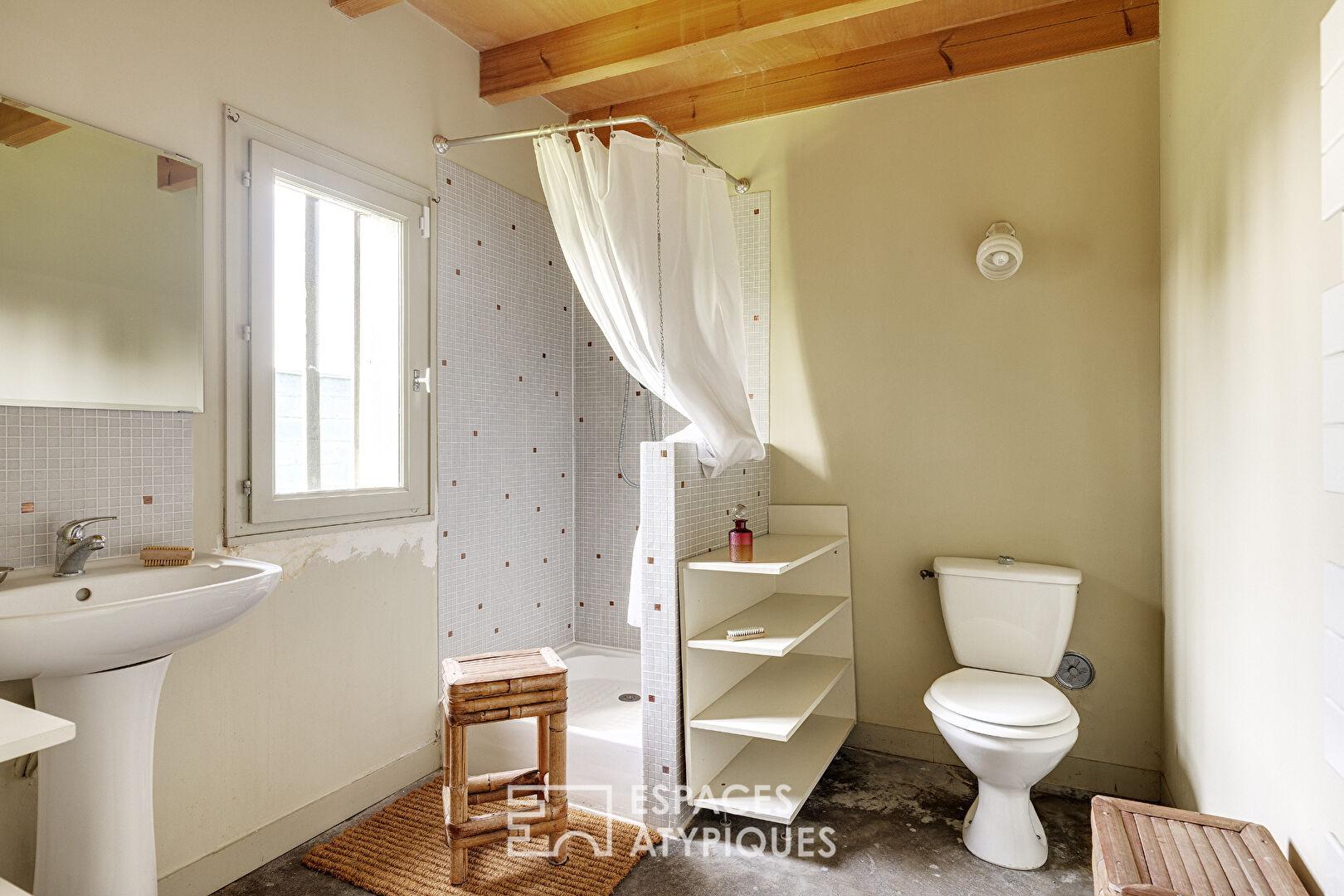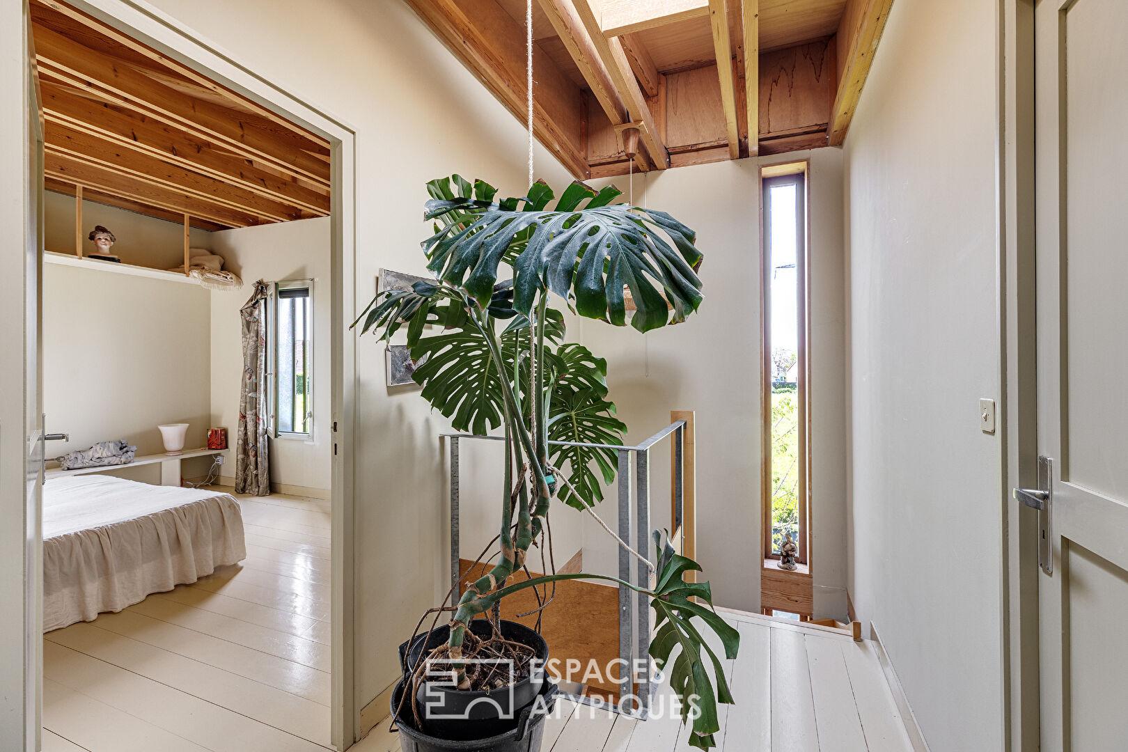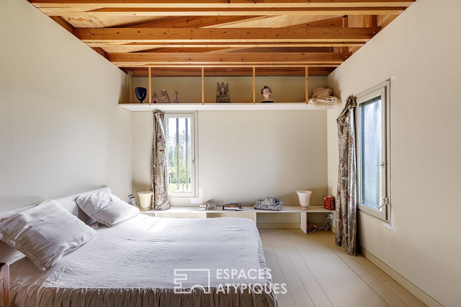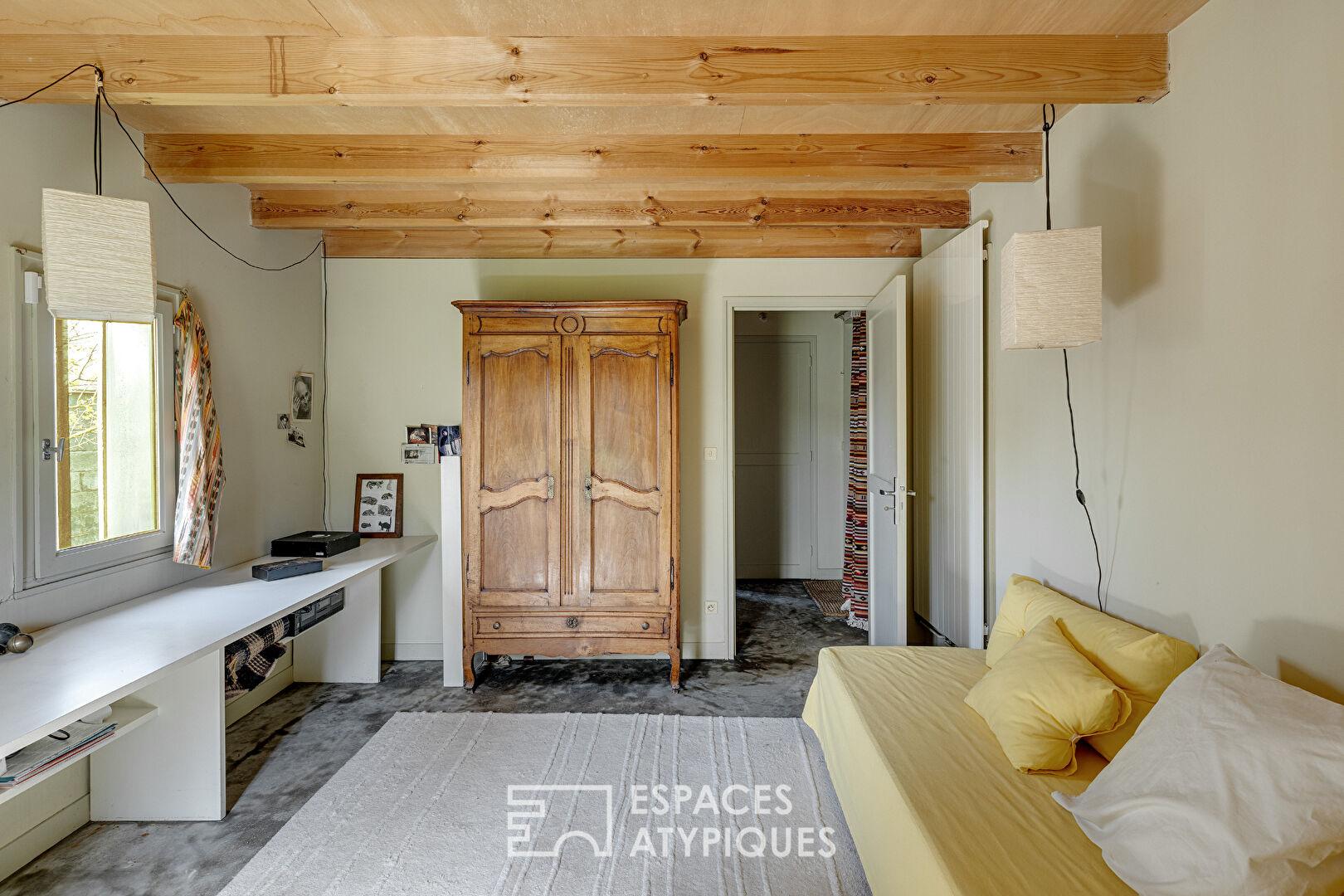 En retrait des espaces de vie, les volumes se déploient avec fluidité. Un espace intimiste précède une première chambre avec salle d’eau, tandis qu’un vestiaire s’articule autour d’une salle de bains aux tonalités 70’s. En retrait, l’extension en bois d’environ 70m², accessible par un palier d’inspiration japonisante, accueille une chambre épurée et u bureau. En contrebas, une dernière chambre en rez-de-jardin, baignée de lumière et sublimée par une poutraison apparente, prolonge cette atmosphère paisible avec sa salle d’eau attenante.