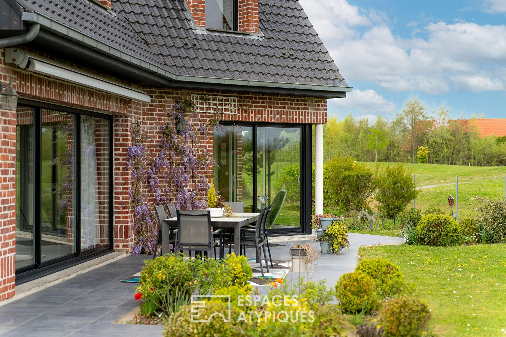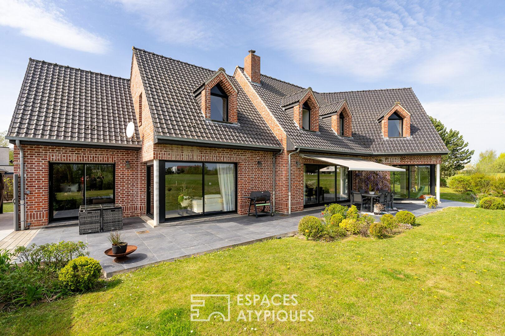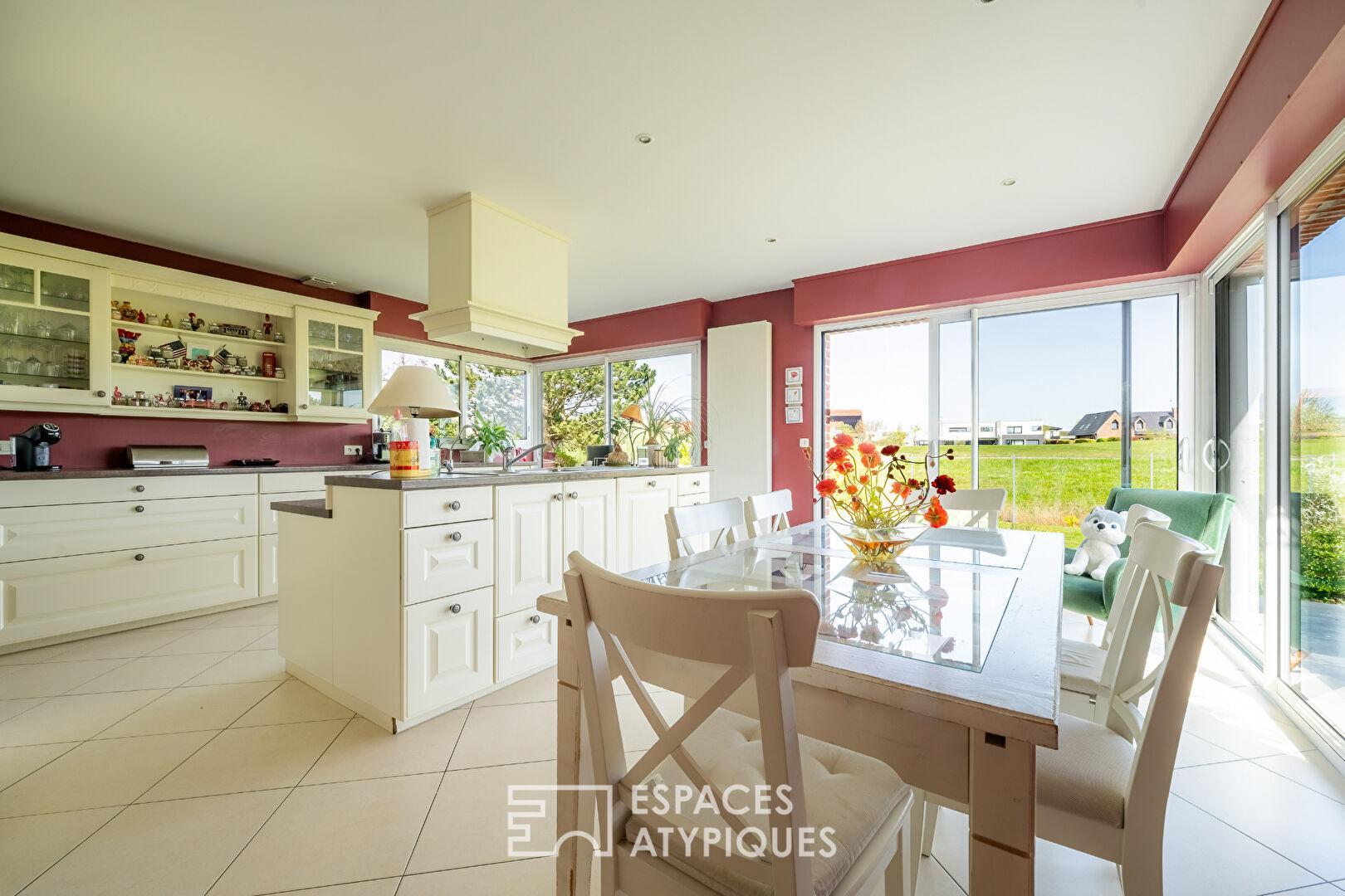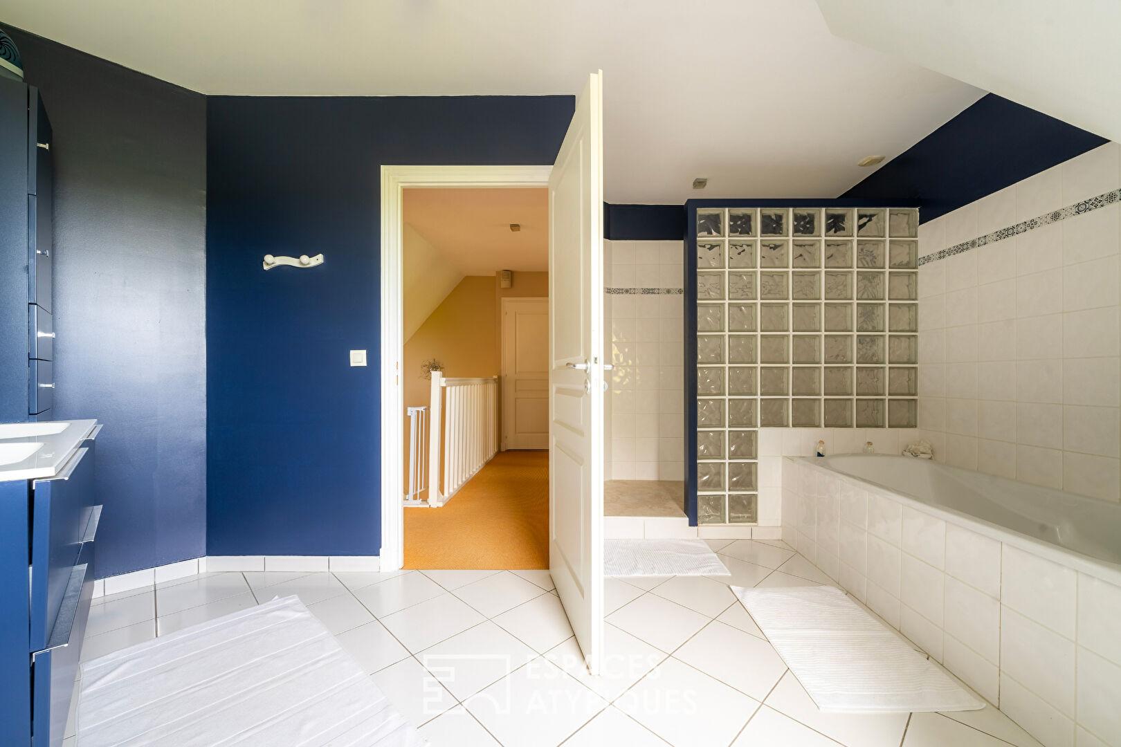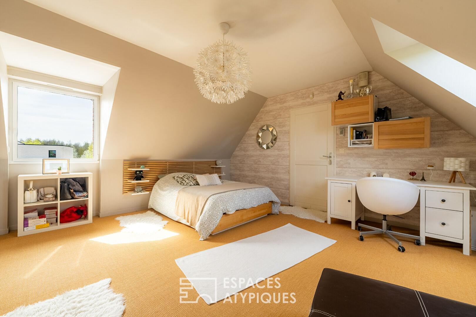 L’entrée, dotée de rangements fonctionnels et d’un accès direct à la cave, ouvre sur une pièce de vie magistrale où la lumière circule librement. Une cheminée centrale à double foyer structure l’espace, créant une atmosphère chaleureuse entre le salon et la salle à manger. La cuisine dinatoire équipée d’un îlot central est complétée de son arrière-cuisine. Le rez-de-chaussée propose également une chambre avec vue sur le jardin et un bureau évolutif en salle de bain.
