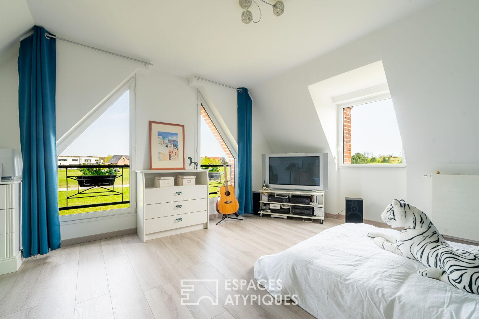 À l’étage, le palier dessert quatre chambres offrant un panorama unique sur les perspectives vallonnées du parcours de golf, dont une suite indépendante avec salle d’eau privative accessible par un escalier extérieur. Parmi les quatre chambres, on y trouve également une suite parentale d’exception avec dressing et salle de bain balnéo qui parachève cet espace nuit.
