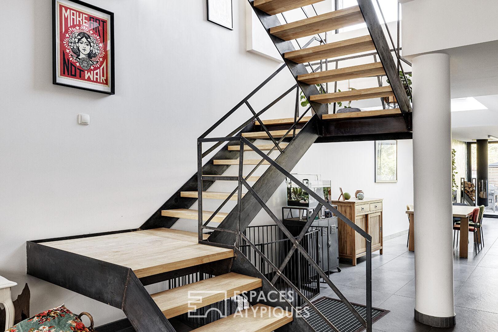La vie intérieure s’organise autour d’un escalier au design magistral, véritable colonne vertébrale de la maison qui dessert les différents niveaux avec fluidité.
